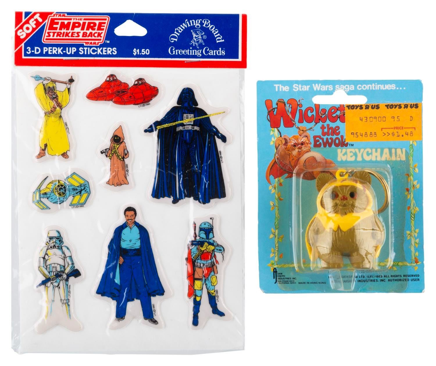 (Drawing Board/Alan Joseph Industries, 1982/1983) A set of eight “The Empire Strikes Back” 3D stickers and a Wicket the Ewok keychain. Ranging in size from 3.75” x 5” to 5” x 7.5” in their original packaging, the unopened items are in very good to fine condition with light wear from storage. The packaging is in good to very good condition with creases, wear, and a pricing sticker on the keychain.
