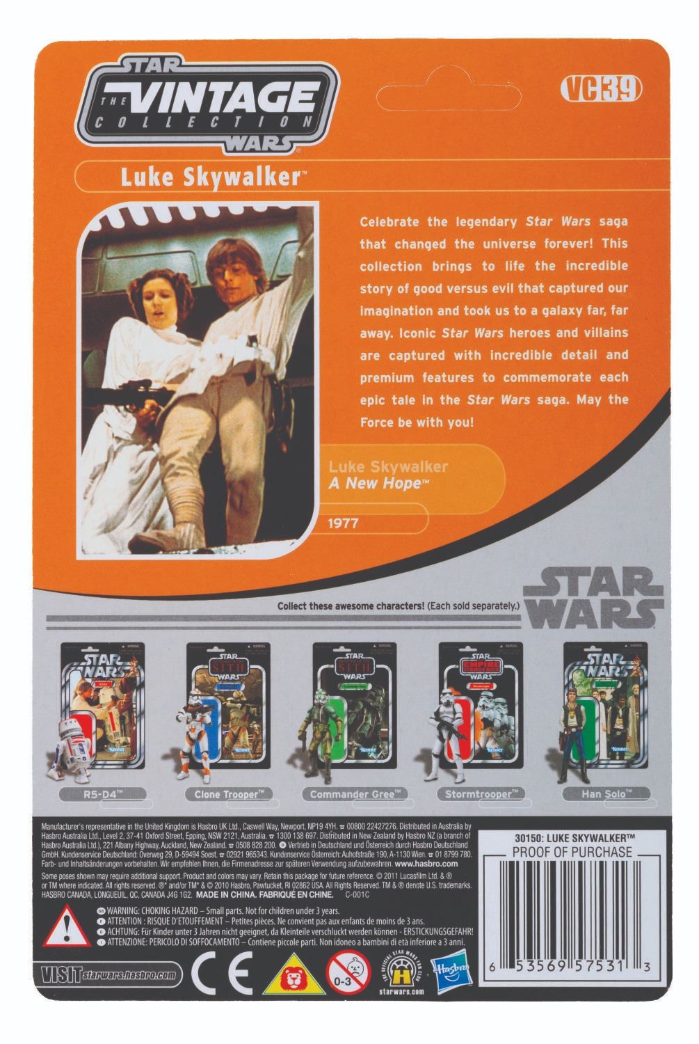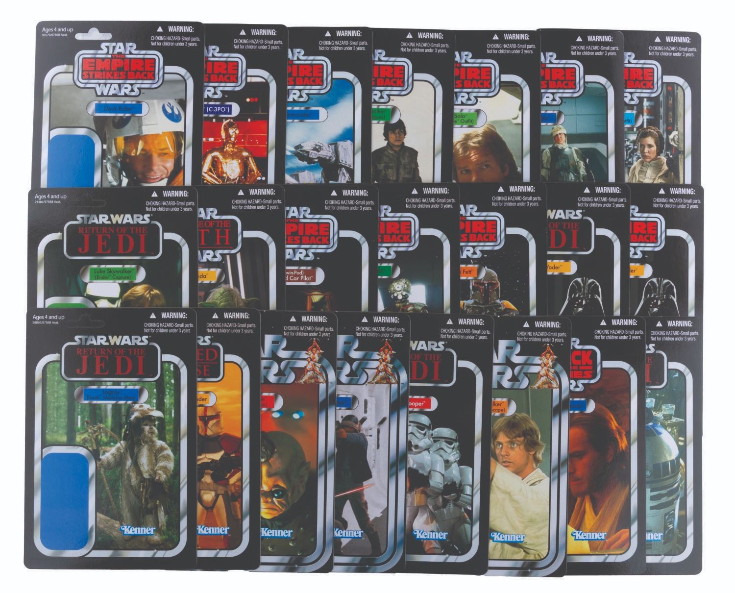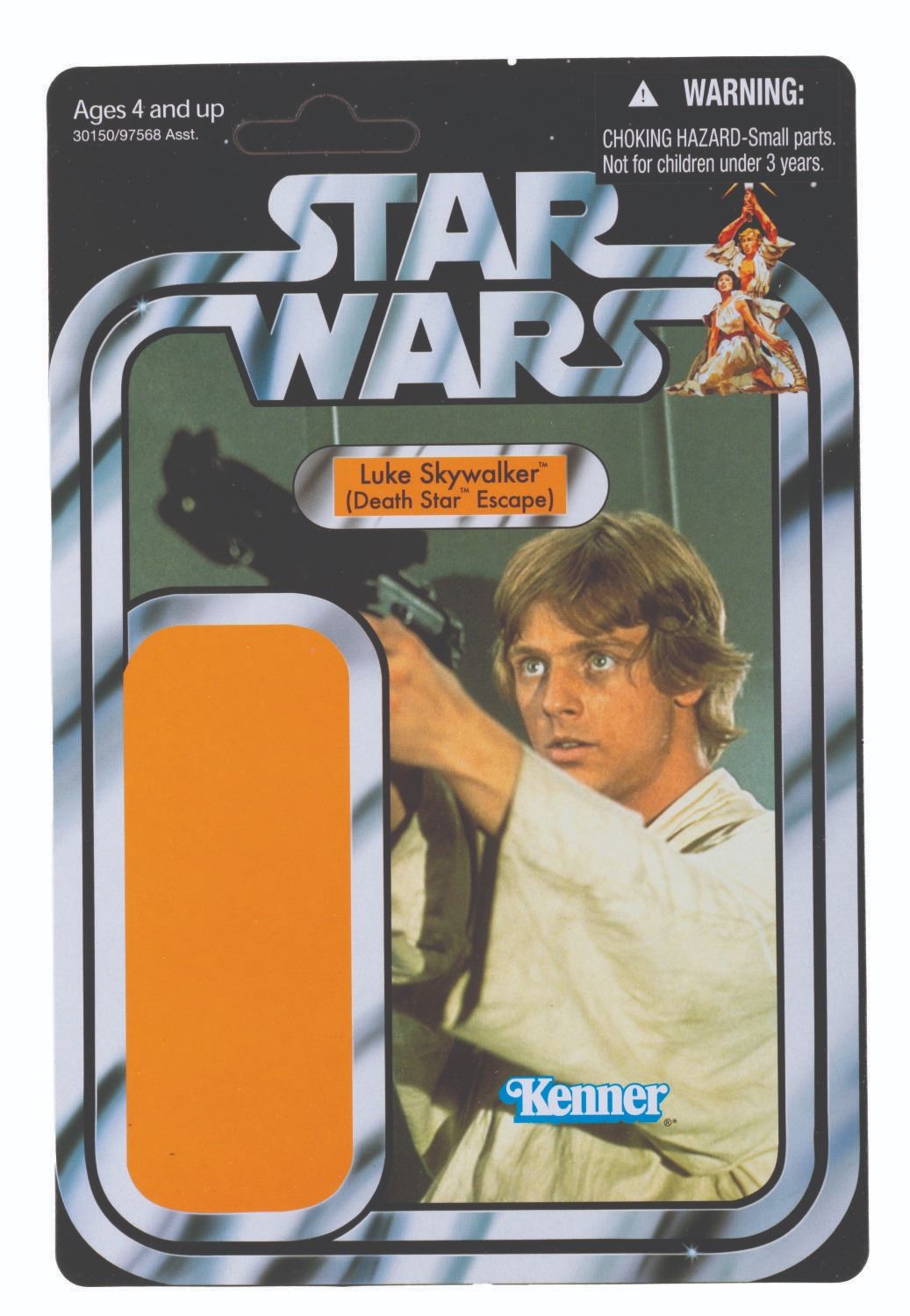 (Hasbro, 2010-2011) A set of 22 unused cardbacks for the Star Wars The Vintage Collection action figures based on the original Kenner action figures made in the late 1970s and early 80s. Included are cardbacks for Luke Skywalker, C-3PO, Han Solo, two designs for Darth Vader, and more. Measuring 6" x 9", the cardbacks, 16 of which are unpunched, are in very good to fine condition with minor edge wear to a few, and a small crease to the back bottom right corner of Han Solo.