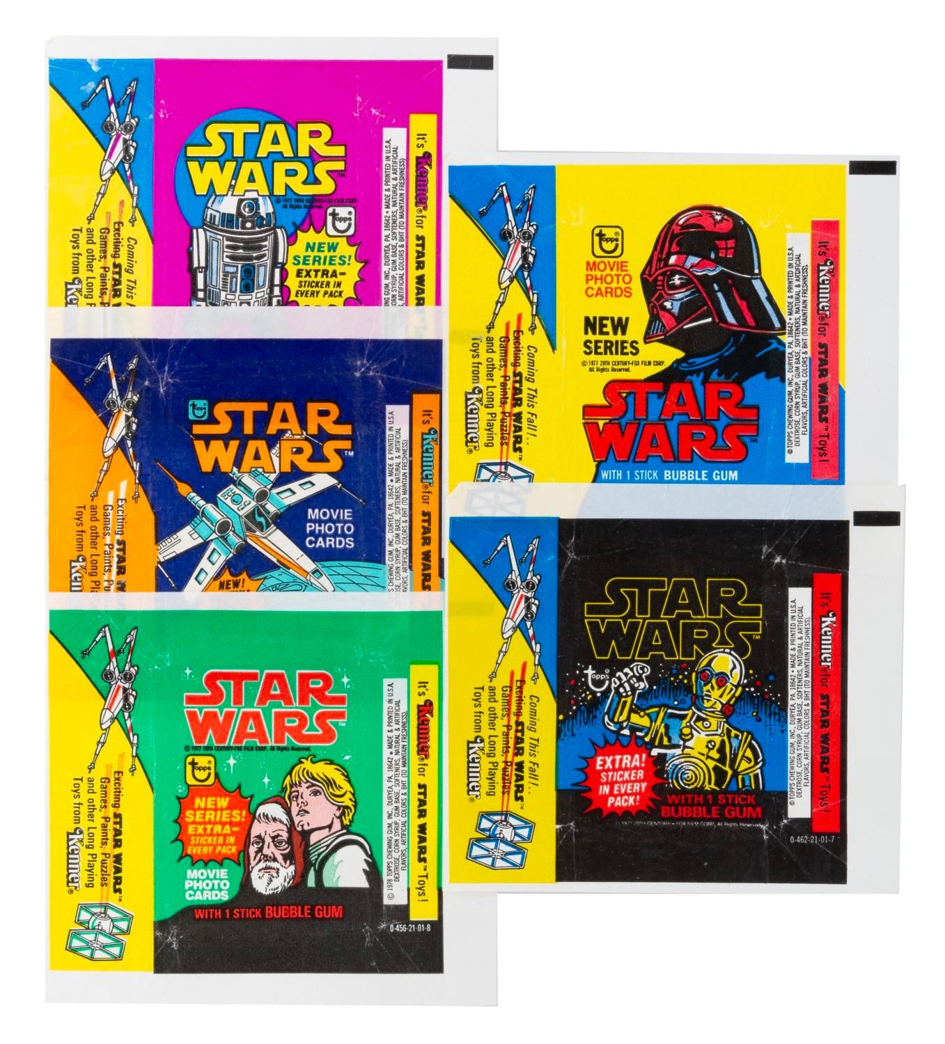 (Topps, 1977) A complete set of Topps “Star Wars” series one through five wax wrappers, from their iconic trading card series for the original film. Each measuring 5.5” x 6”, the wrappers display in good condition with typical wear and creases.