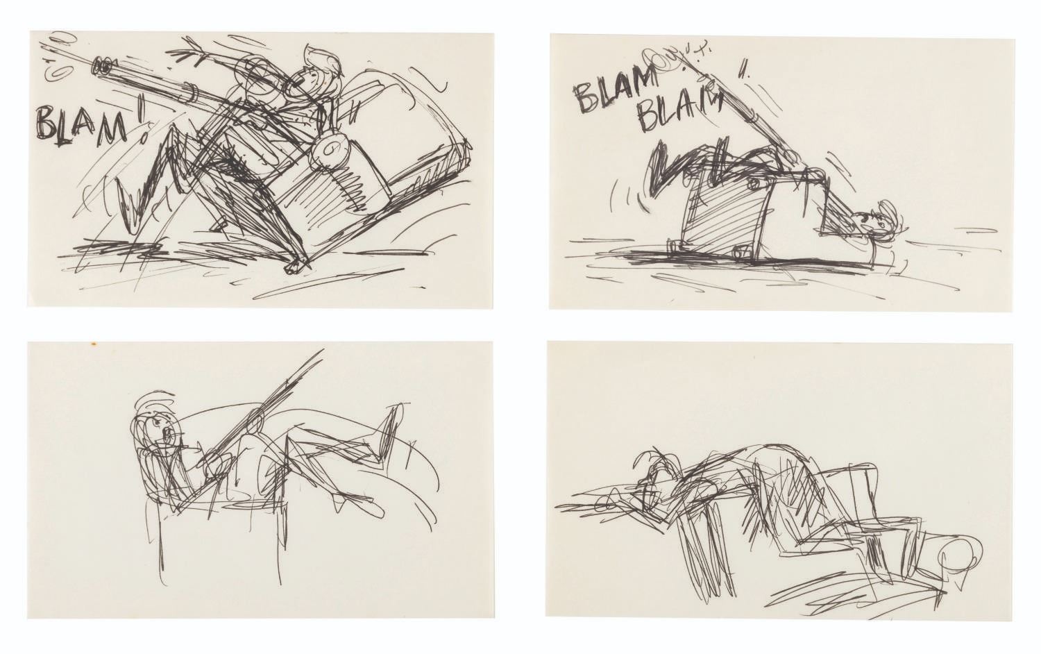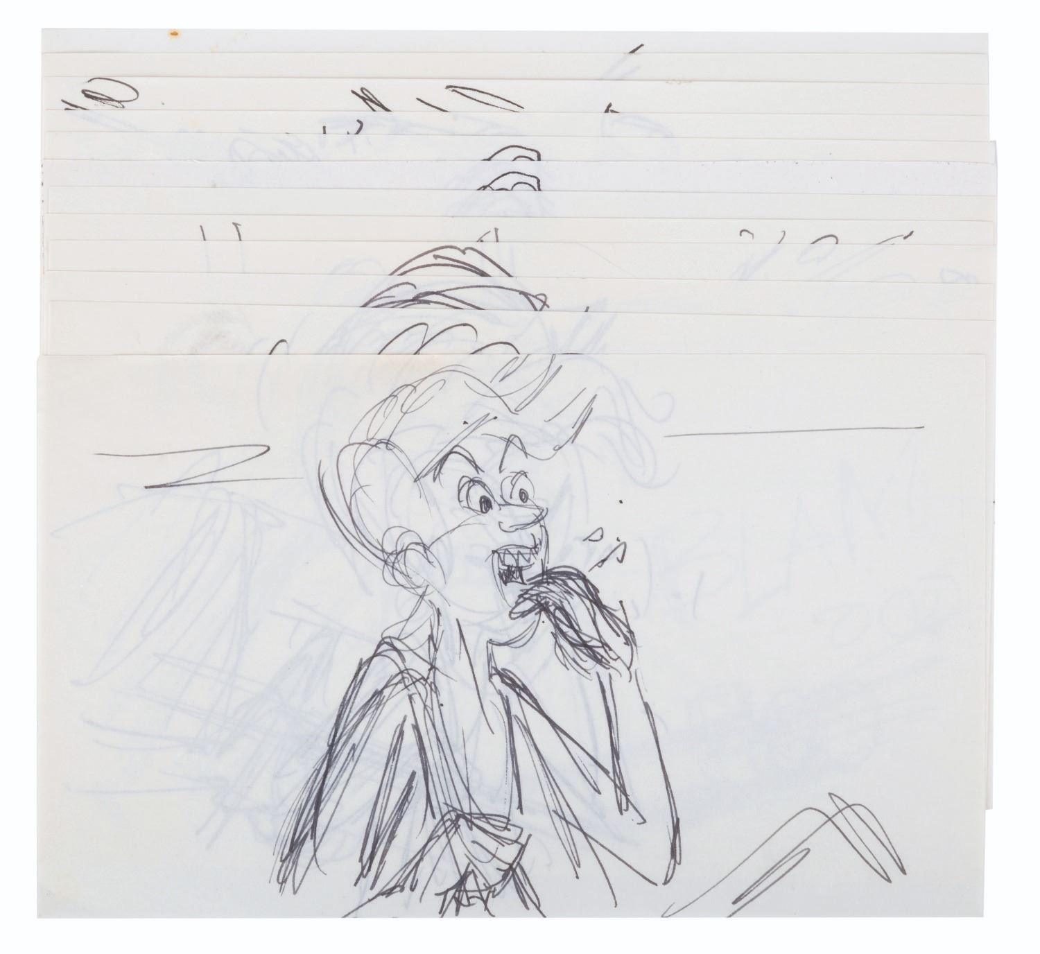 (Disney, 1977) A set of twelve storyboard panels from Walt Disney’s "The Rescuers" depicting Madame Medusa brandishing and firing a shotgun. Each measuring 4” x 7”, the panels are accomplished in ink and pencil, with one photocopied panel of another drawing. All pieces are in very good condition with very slight wear mainly to their edges.