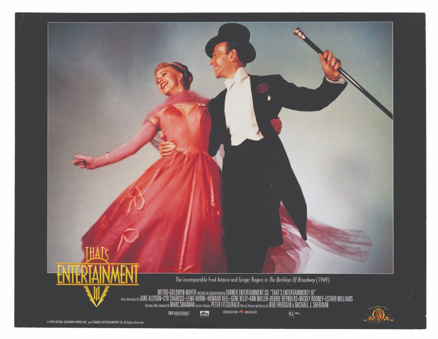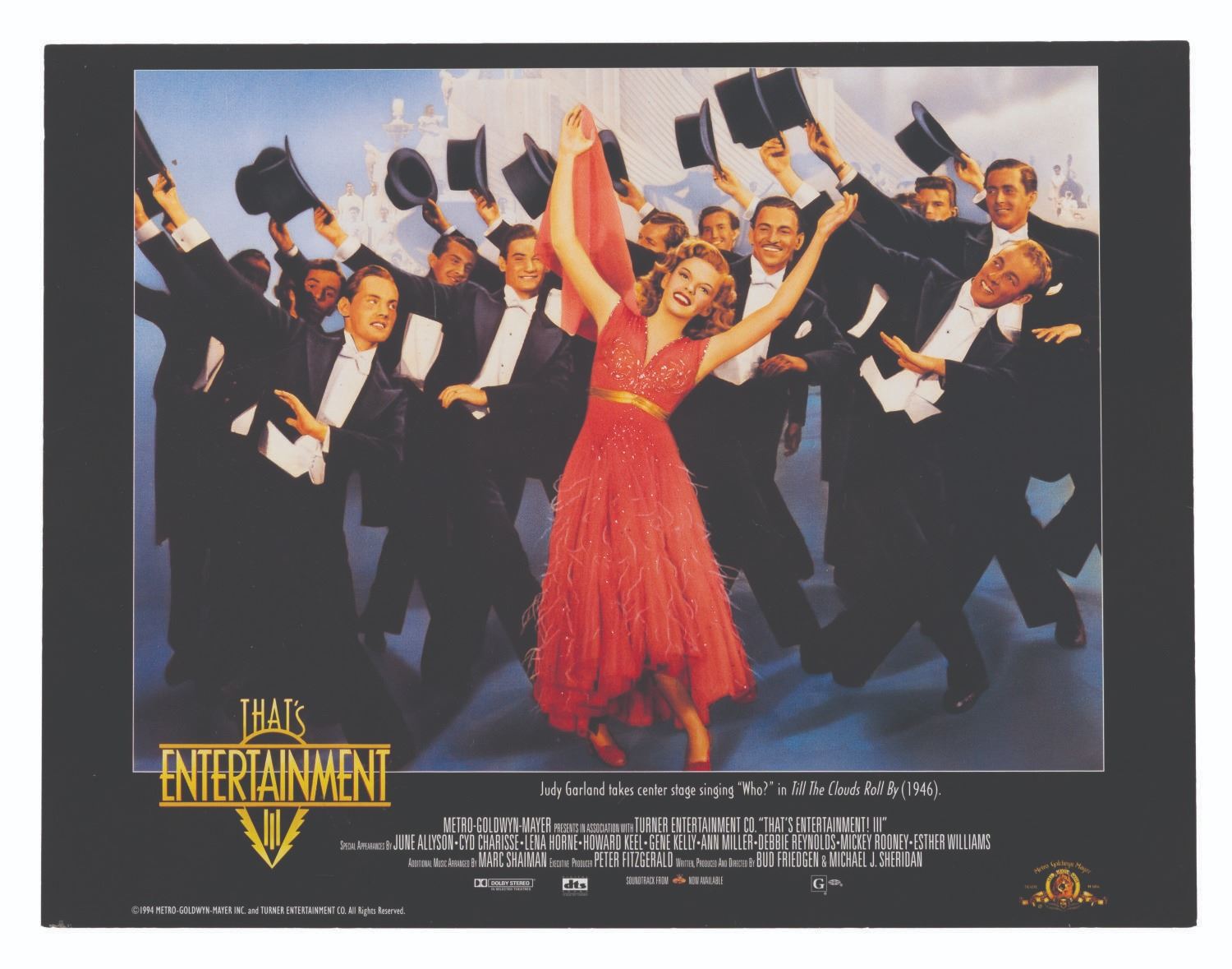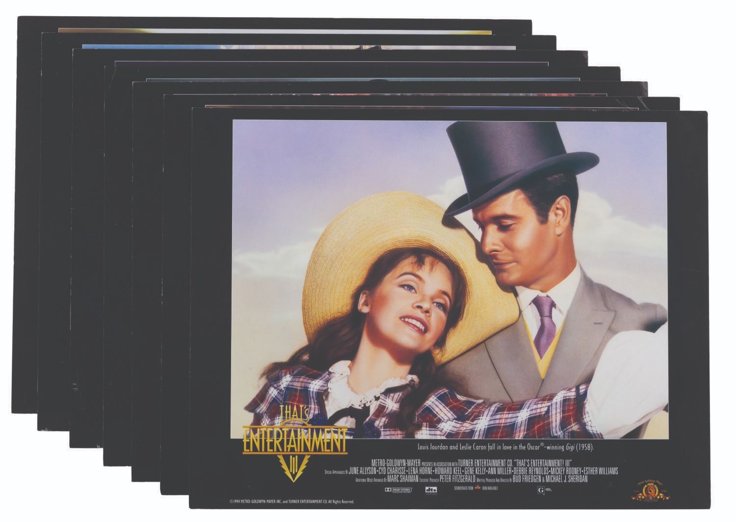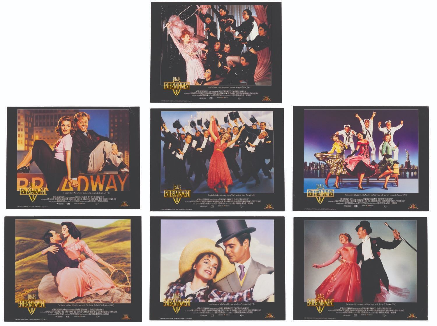 (MGM, 1994) A set of seven lobby cards for "That’s Entertainment III" featuring scenes from classic MGM musicals starring Judy Garland, Lucille Ball, Fred Astaire, and more. Measuring 9.25" x 12", the cards display in good condition with light edge wear and small creases, and spots of paper loss to the back that do not affect display.