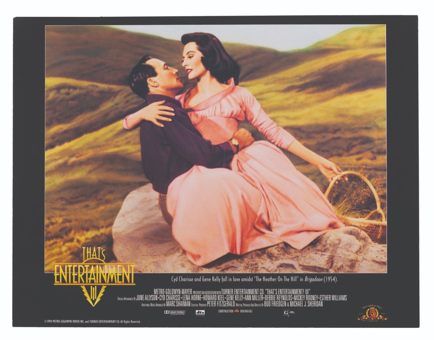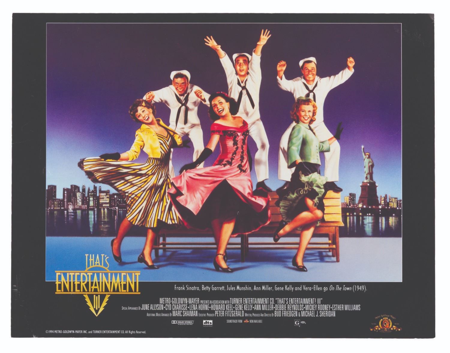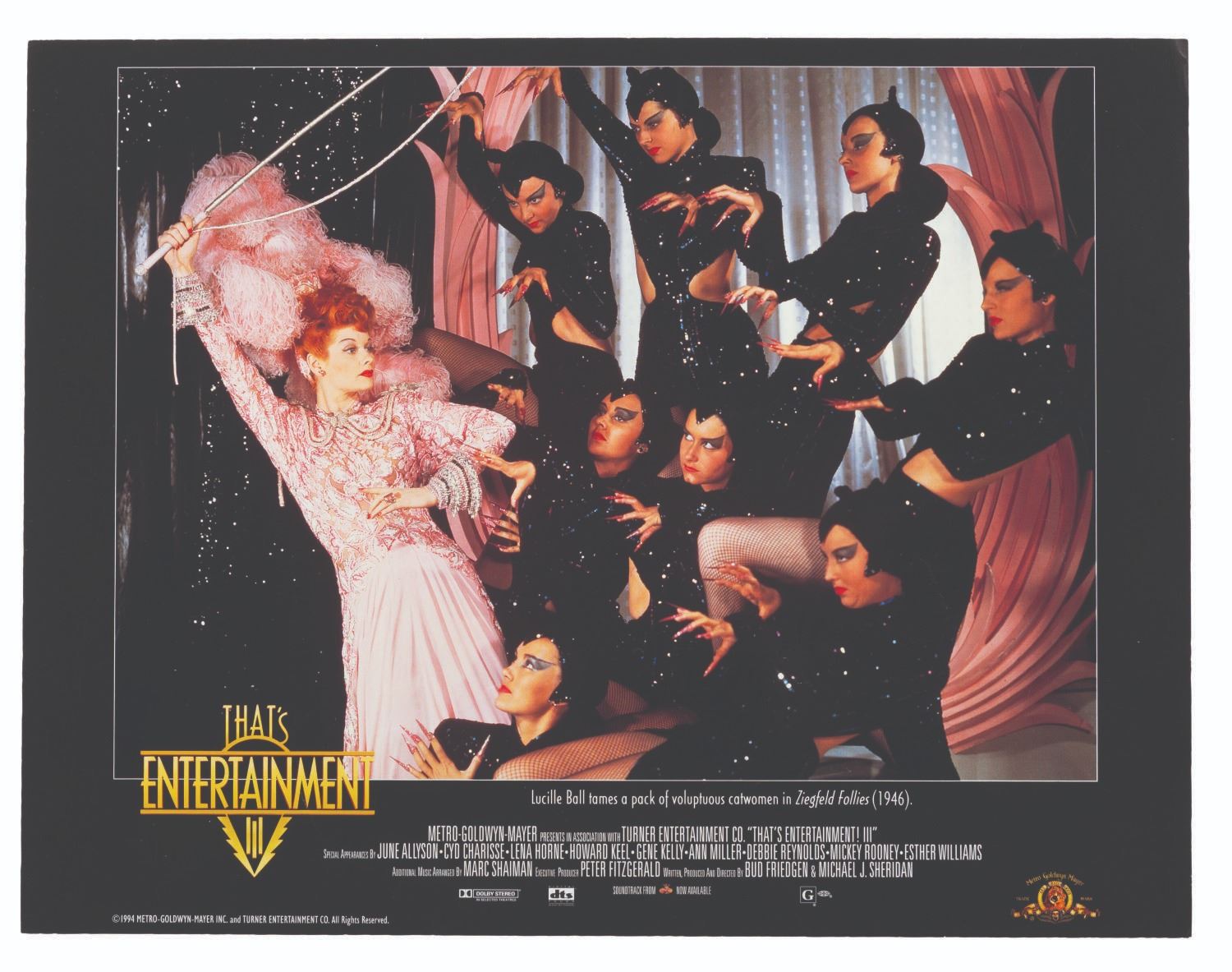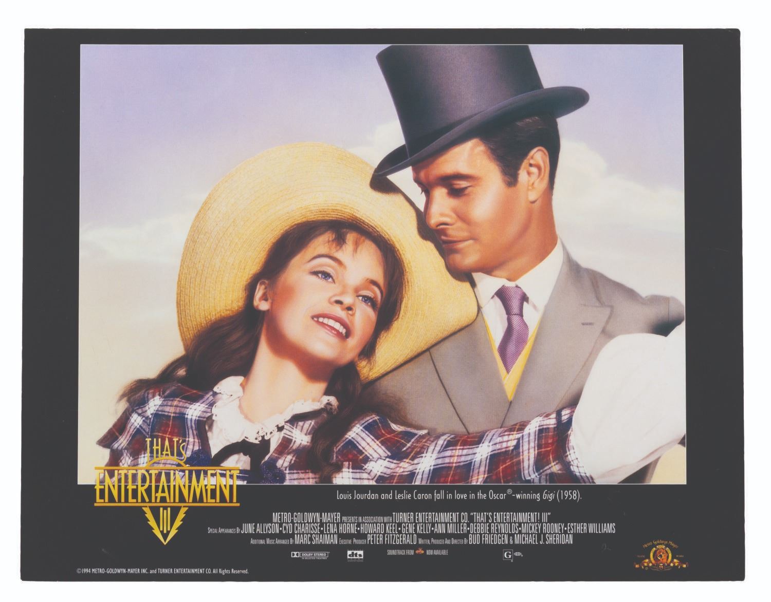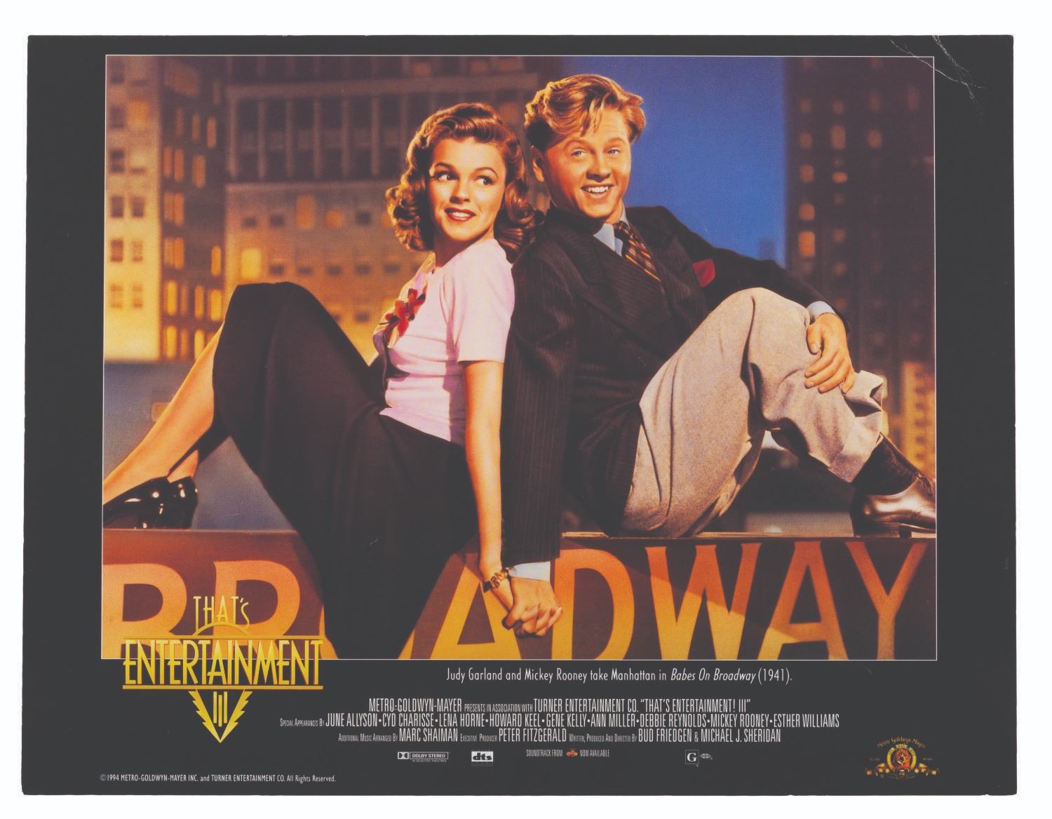 (MGM, 1994) A set of seven lobby cards for "That’s Entertainment III" featuring scenes from classic MGM musicals starring Judy Garland, Lucille Ball, Fred Astaire, and more. Measuring 9.25" x 12", the cards display in good condition with light edge wear and small creases, and spots of paper loss to the back that do not affect display.