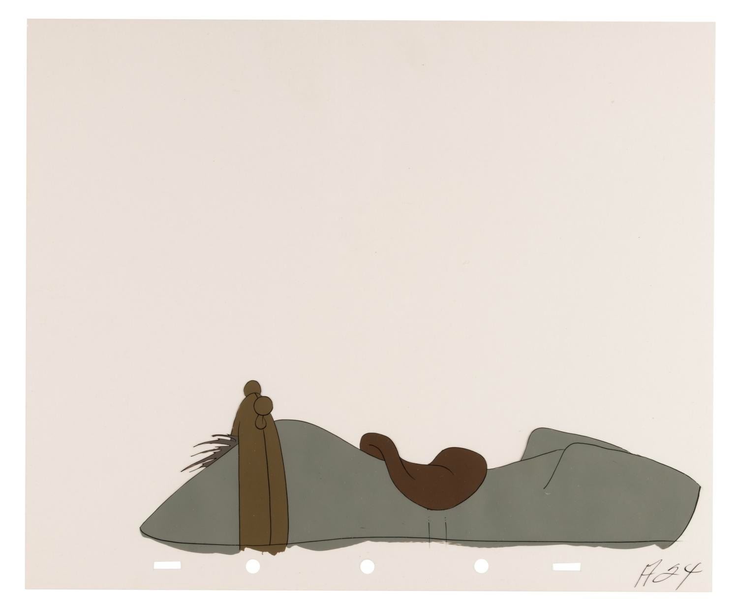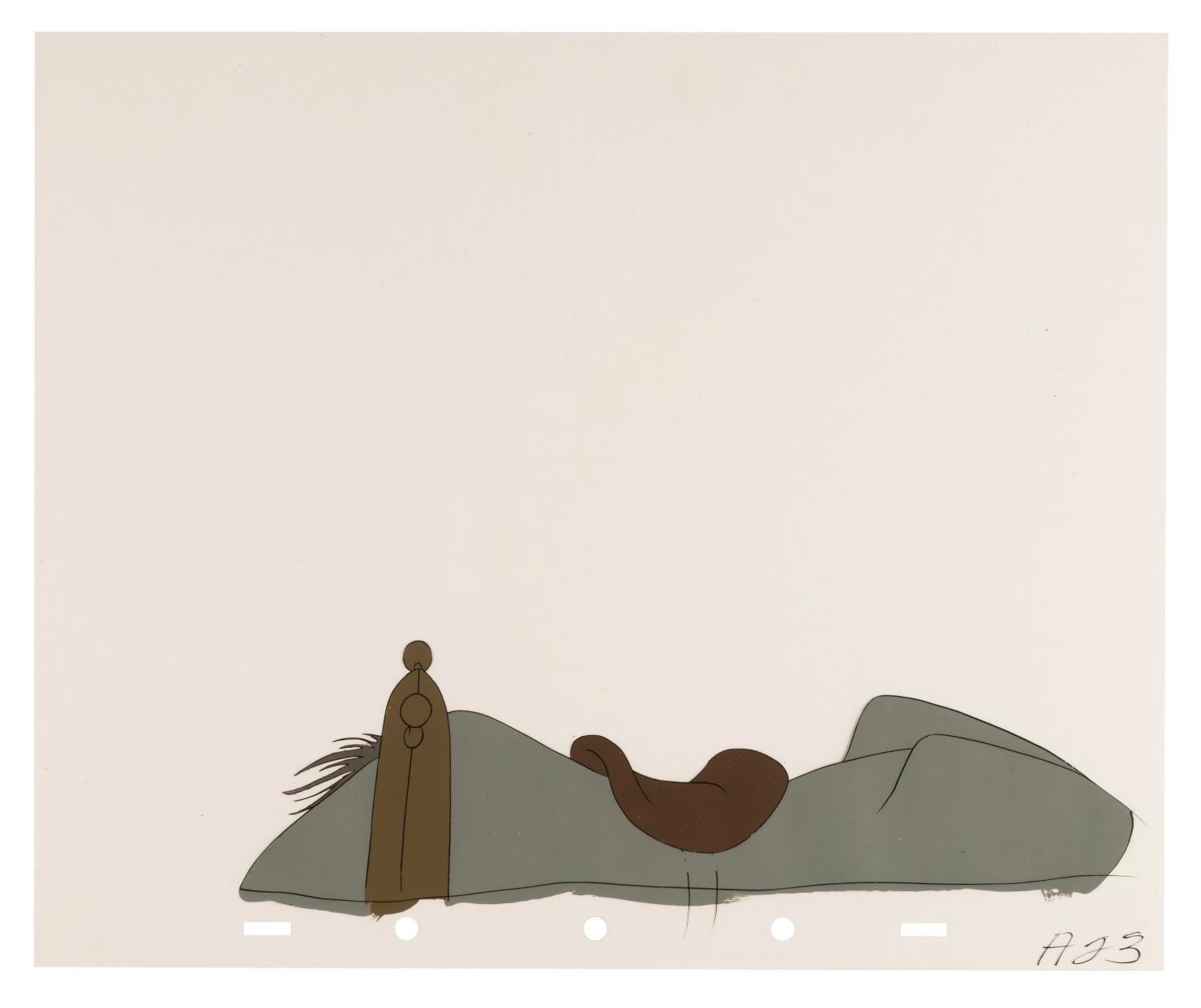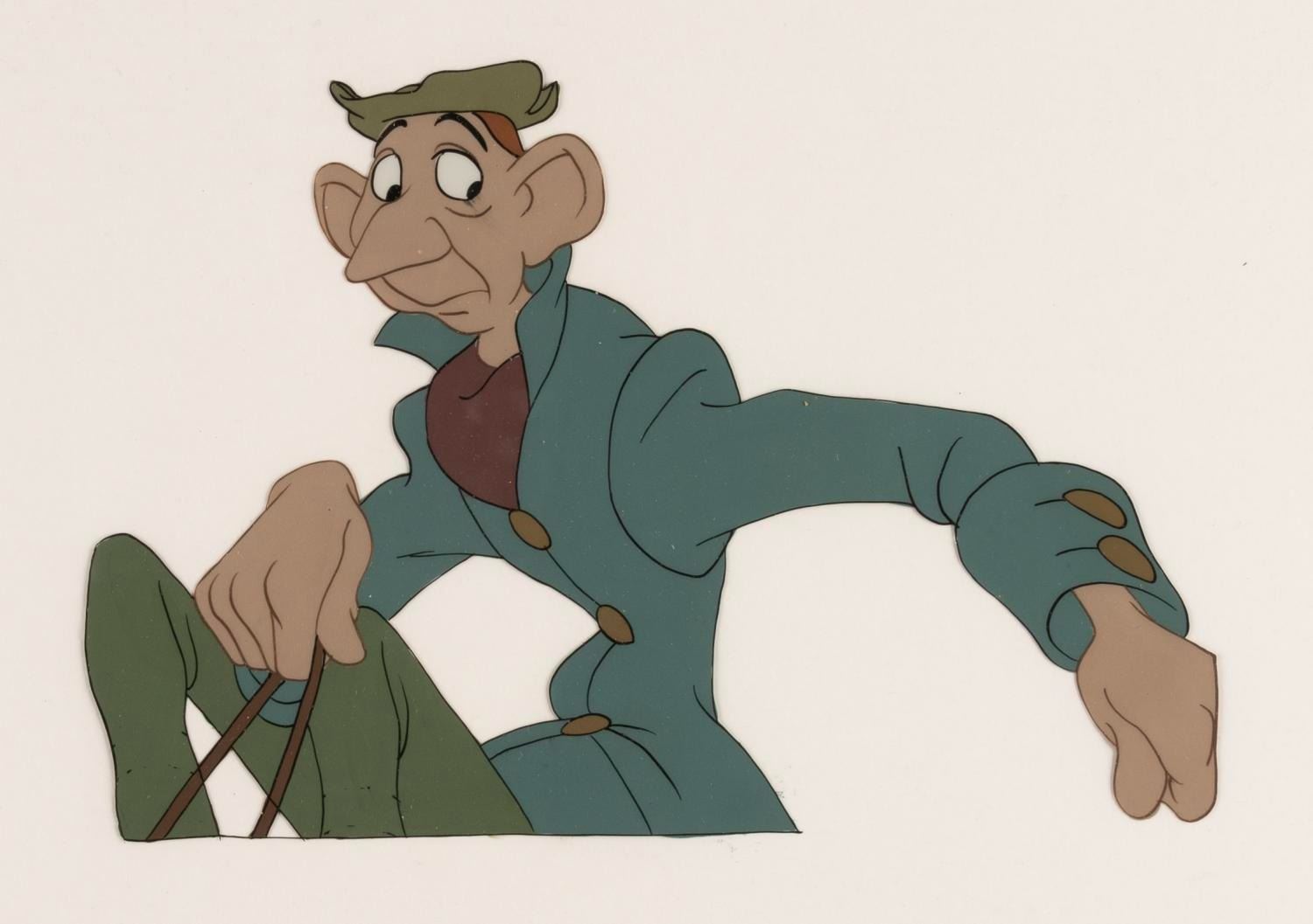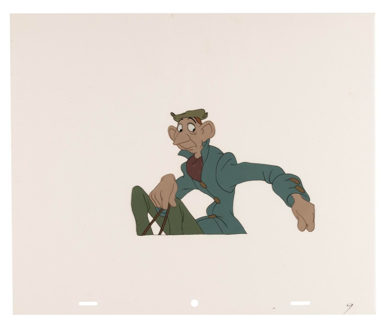 (Disney, 1949) A collection of eight original production cels from “The Legend of Sleepy Hollow” segment of Walt Disney's anthology film "The Adventures of Ichabod and Mr. Toad." Included are one cel of Ichabod Crane and seven cels of his horse's back. Ichabod’s character image size measures 4.25” x 6” and the horse’s back ranges from 2.5” x 10.25” to 3” x 11”, each on 10” x 12” cels. The artwork displays in very good condition with light paint loss, scratches, scrapes, and smudges.