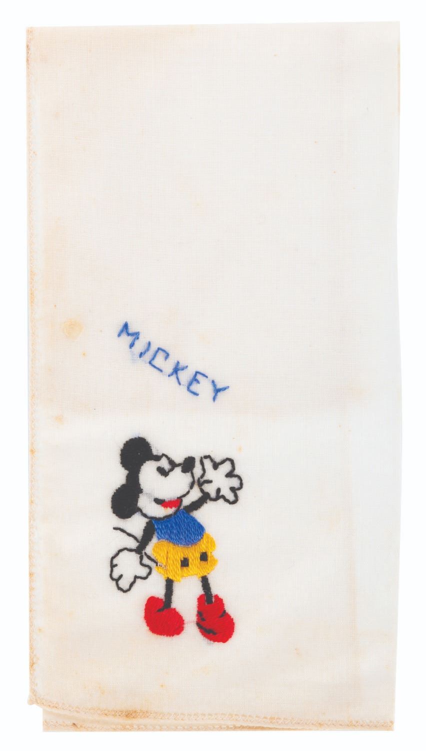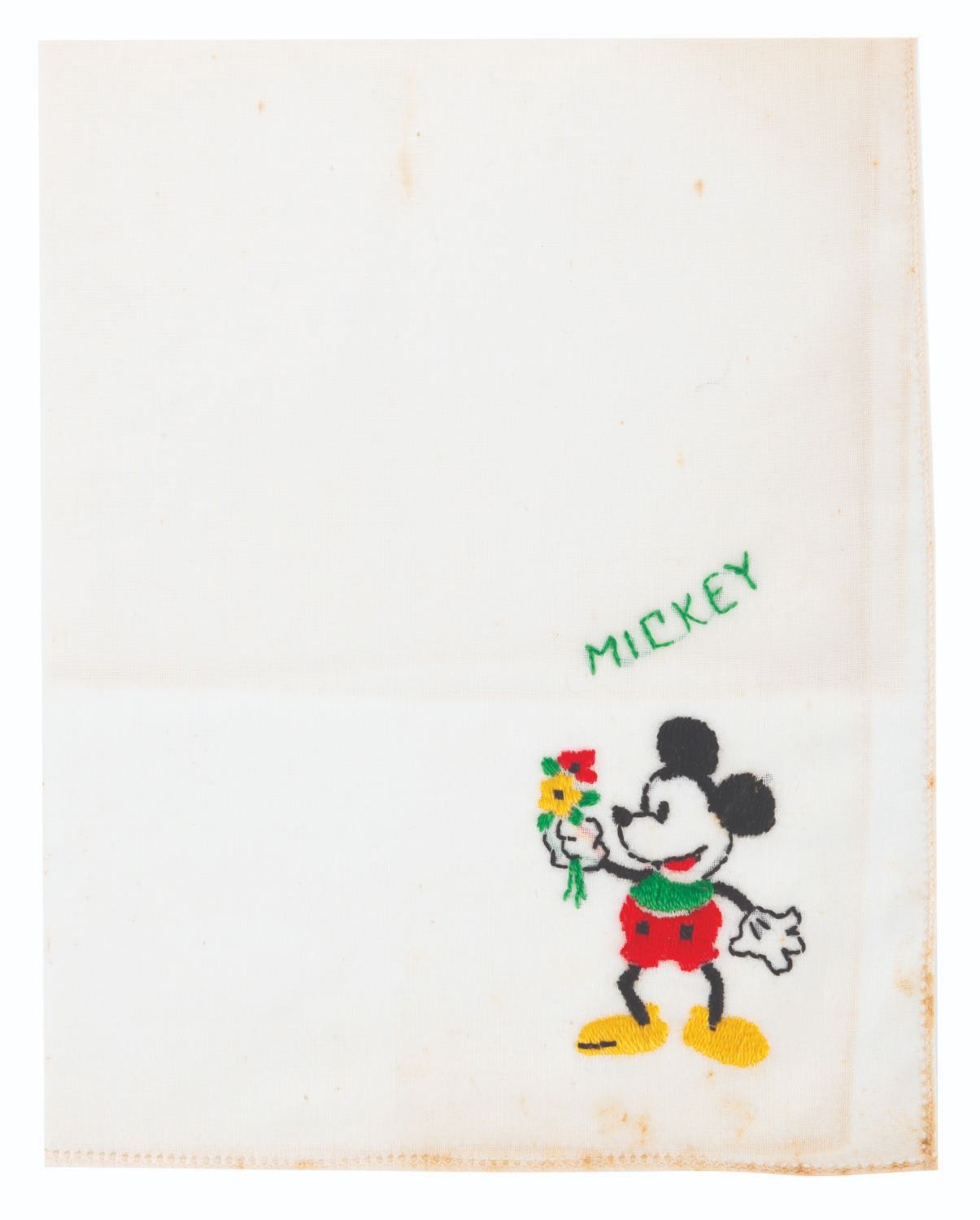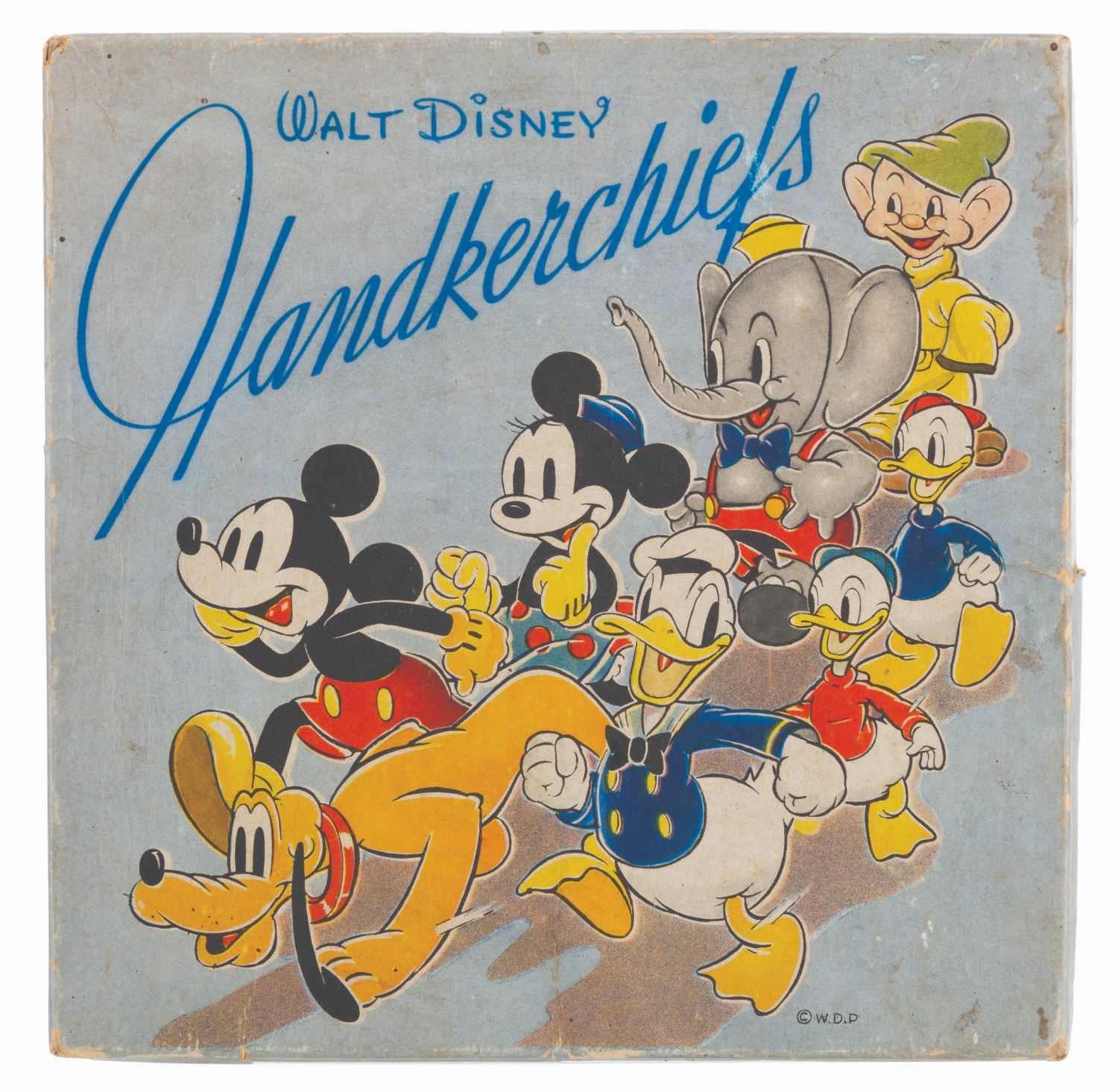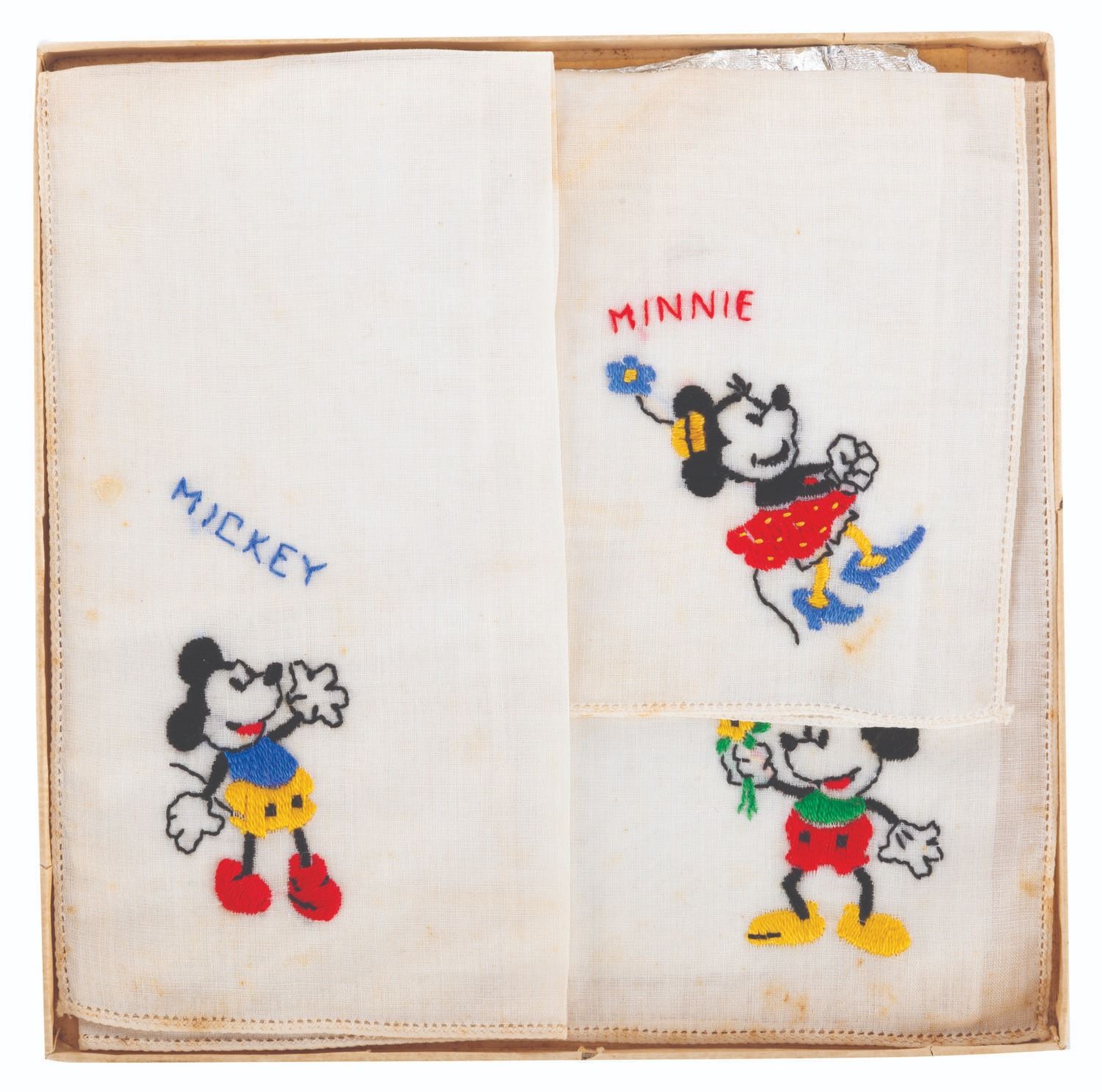 (Disney, 1938) A Walt Disney Handkerchiefs boxed set, featuring embroidery of Mickey & Minnie Mouse. Measuring 7" x 7", the handkerchiefs are in good condition with staining and discoloration while the box is in fair condition with staining, edge wear, soiling, tears and deterioration.