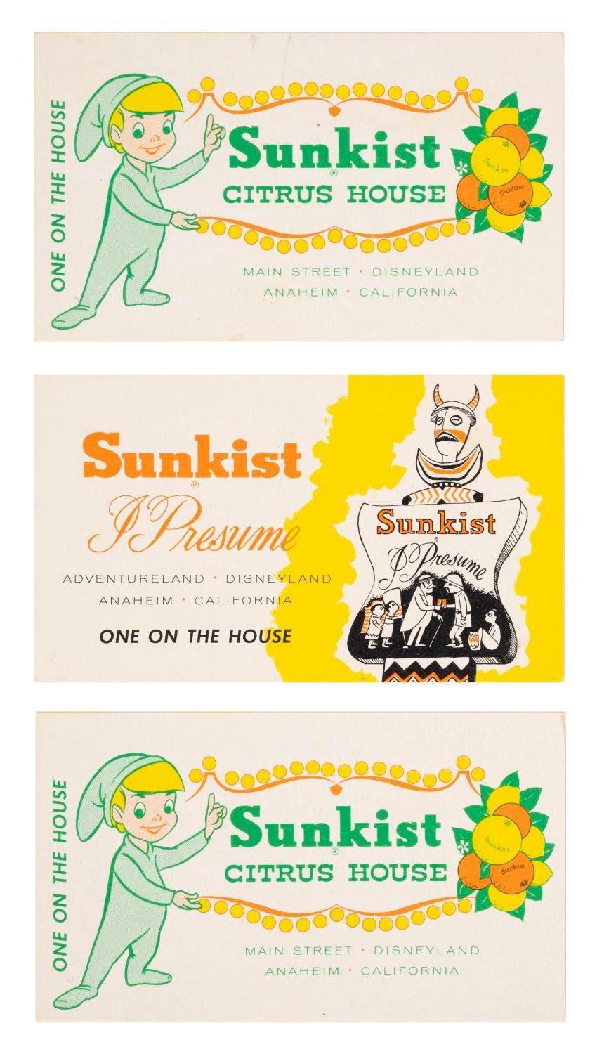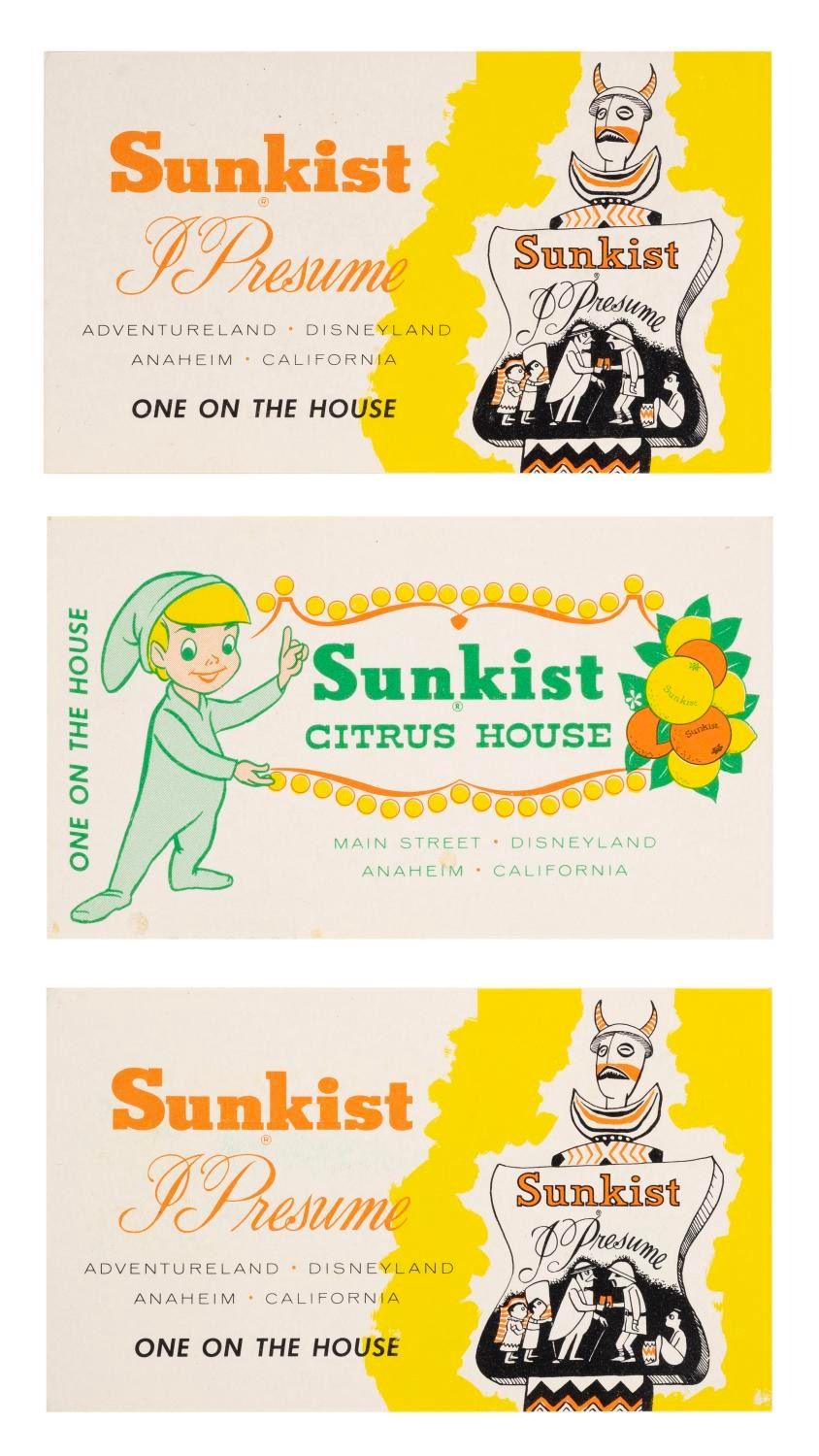 (Disneyland, 1962-1970s) A trio of early Sunkist beverage redemption cards. Each card is for a complimentary lemonade or orange juice from the Sunkist I Presume or Sunkist Citrus House refreshment locations. Measuring 4" x 2.25" each, the cards are in very good condition with light wear from age, and one card exhibiting very light spotting.