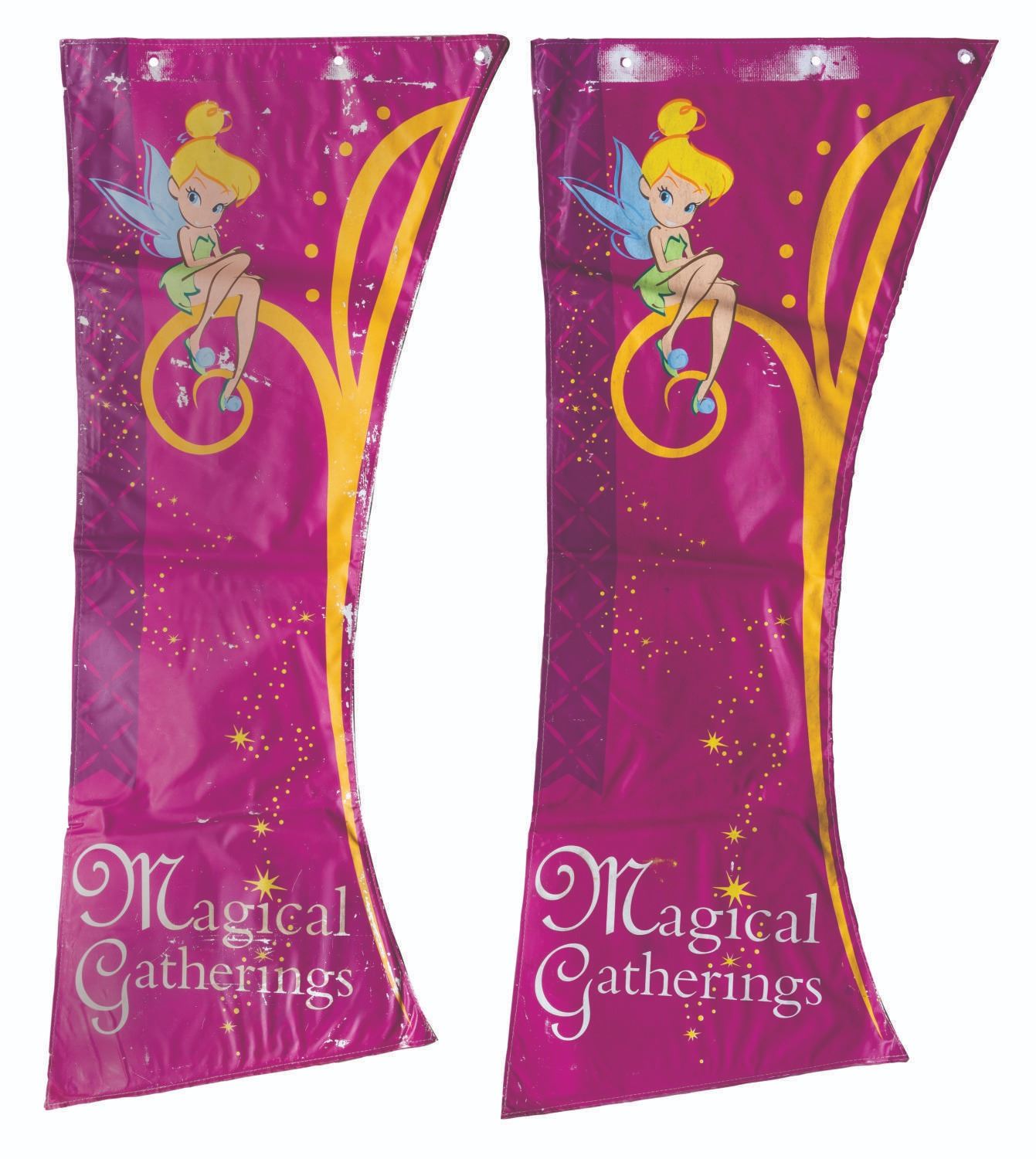 (Walt Disney World, 2010s) A pair of original banners from Magical Gatherings at the Magic Kingdom. Featuring imagery of Tinker Bell, and measuring 22" x 50" each, the banners are in fair condition with surface wear, small cracks, spots of discoloration and color loss, creases throughout and folds from storage.
