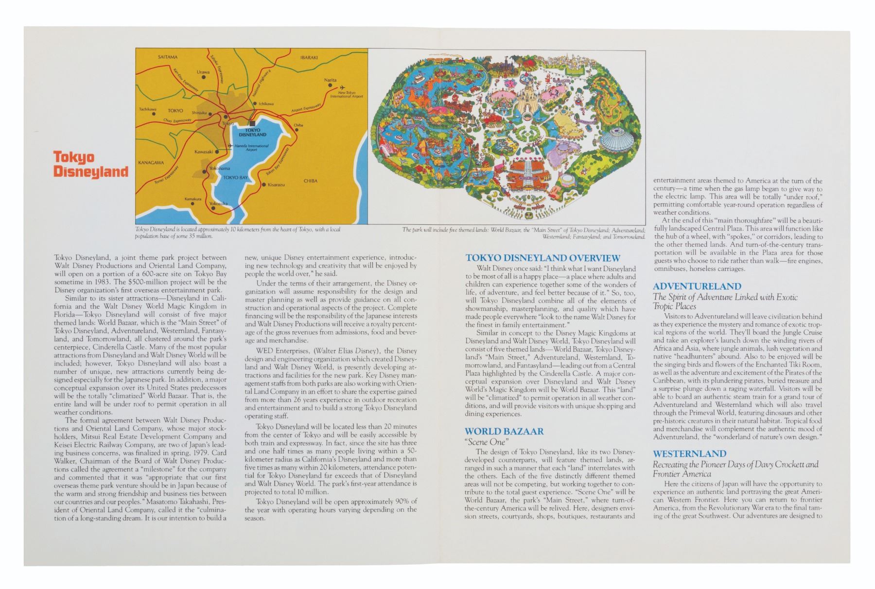 (Tokyo Disneyland, 1981) A set of 23 bi-fold brochures giving an overview of Tokyo Disneyland with maps and concept art. The 8.5" x 11" brochures are in very good condition with very light handling wear to some.
