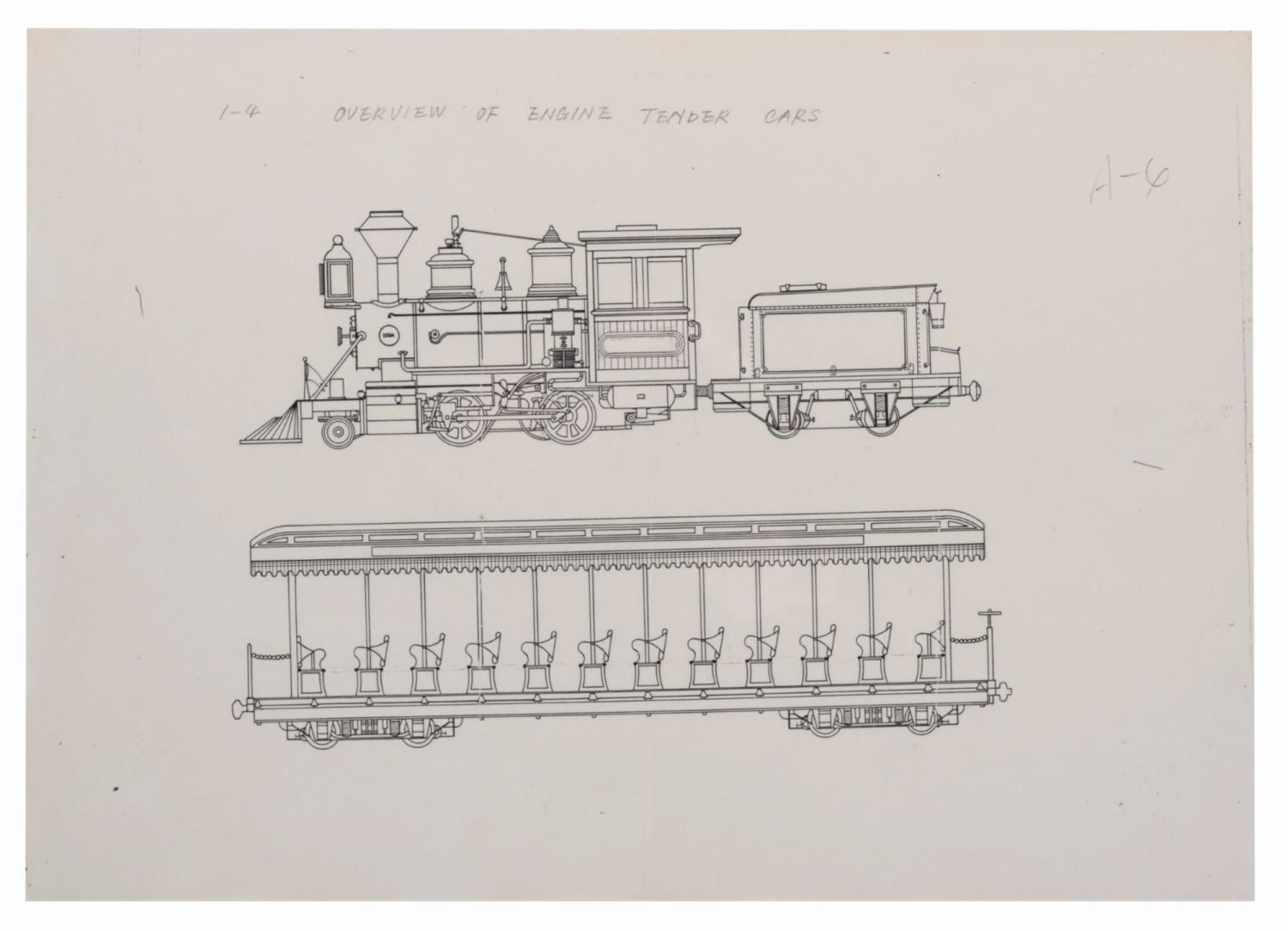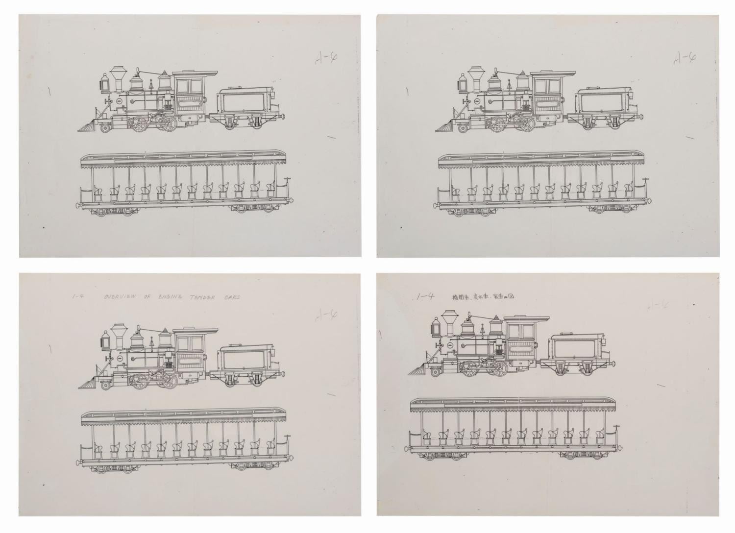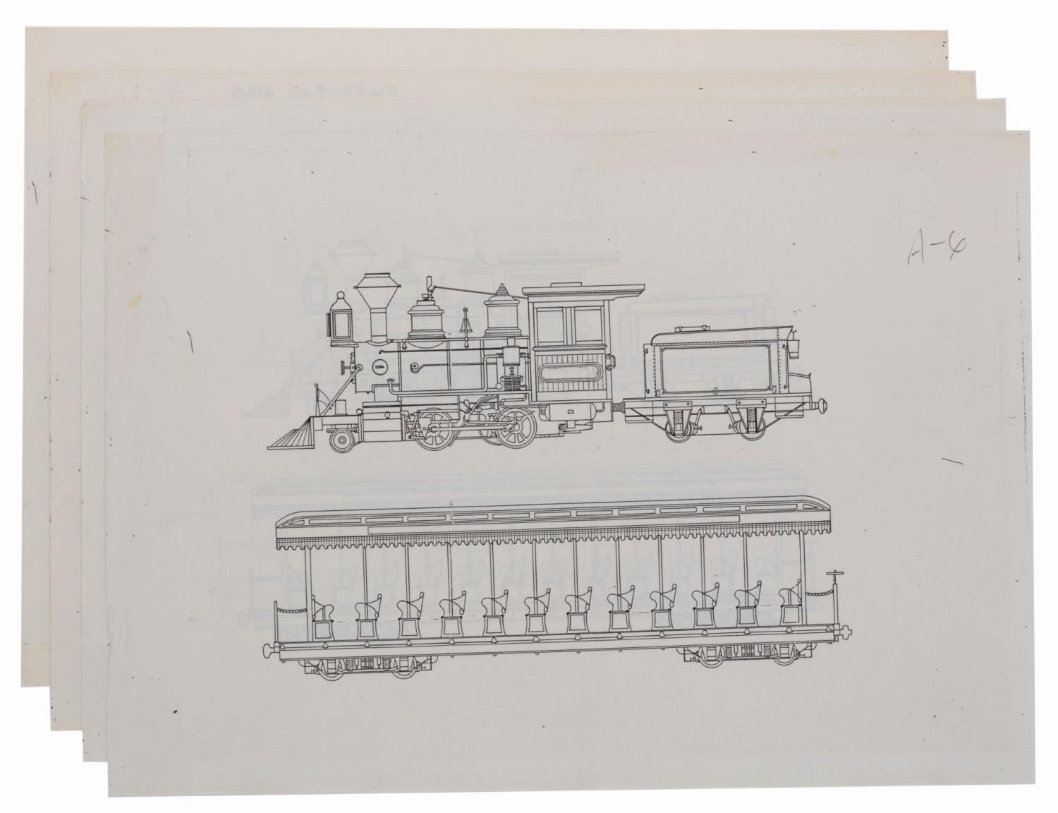 (Tokyo Disneyland, 1980s) Four production used prints of a line drawing for the Western River Railroad at Tokyo Disneyland. The identical prints show the Rio Grande engine and one train car. Measuring 12" x 16.5" with an image size of 7.25" x 10", the prints are in good condition with wear from original use, a vertical fold through the center, and pencil writing in English and Japanese on two.
