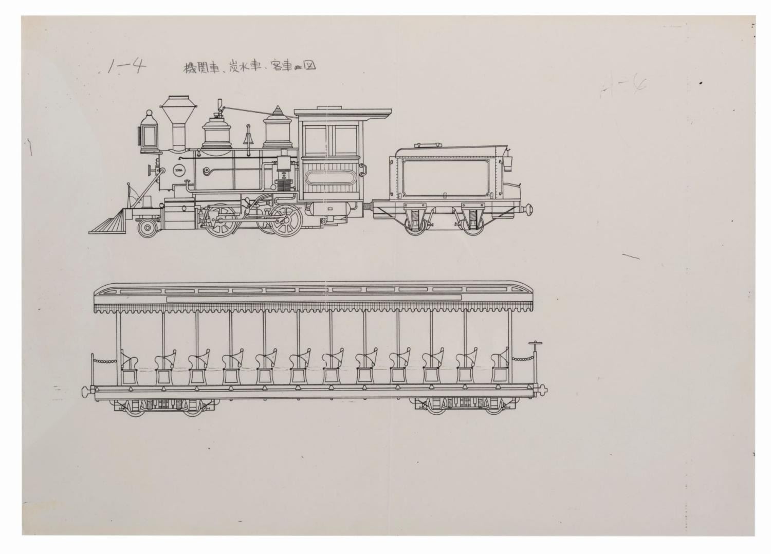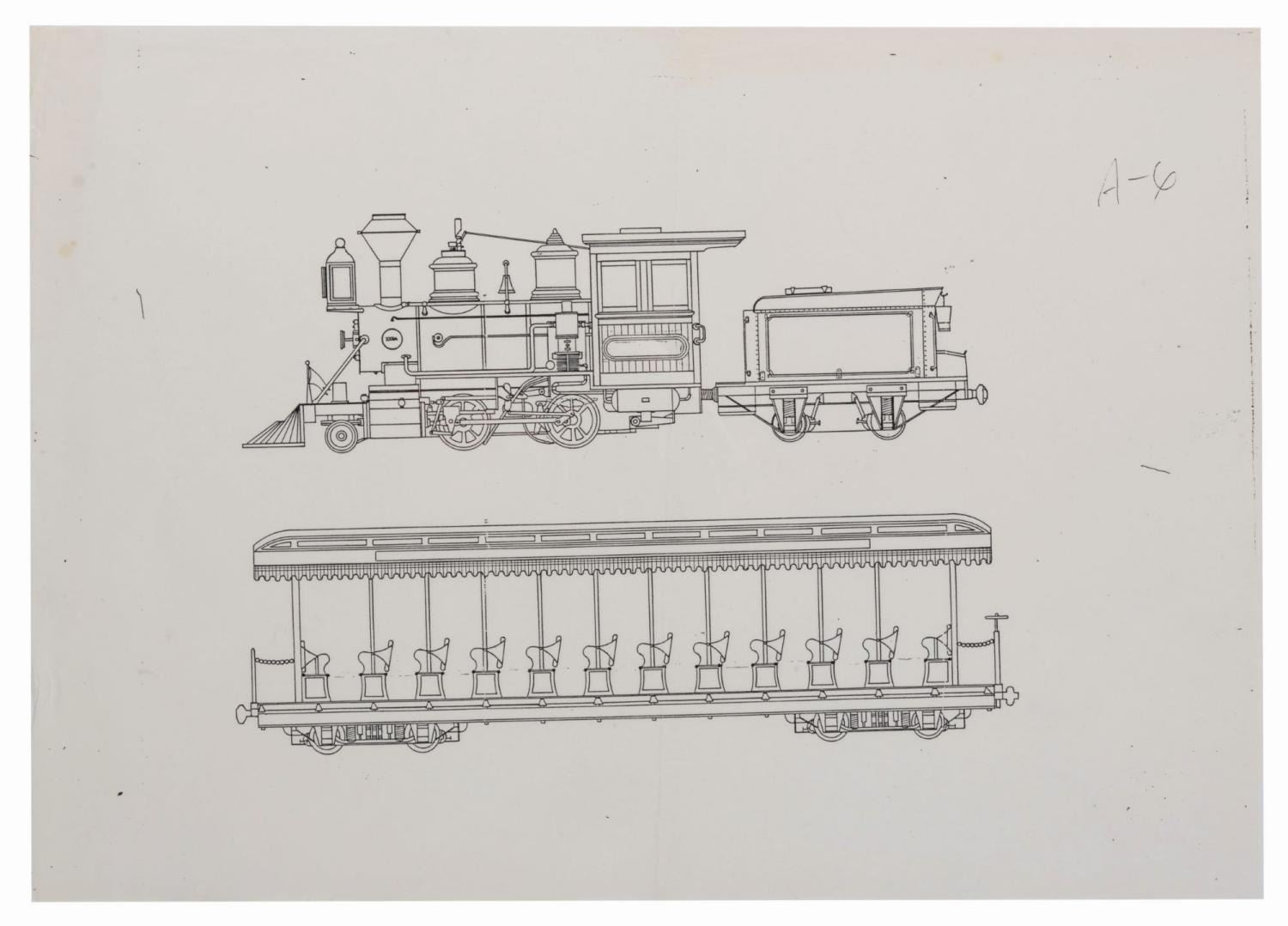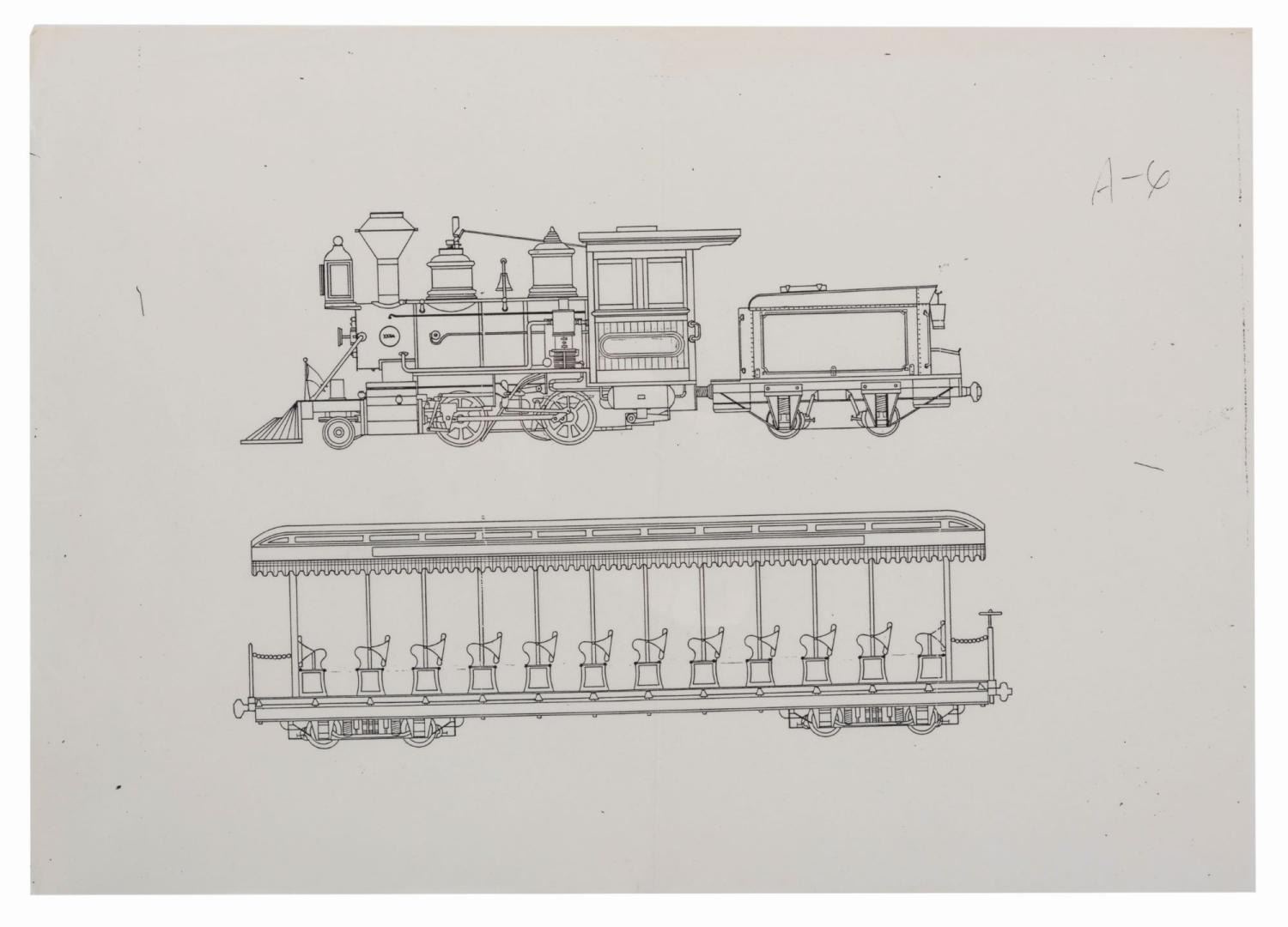 (Tokyo Disneyland, 1980s) Four production used prints of a line drawing for the Western River Railroad at Tokyo Disneyland. The identical prints show the Rio Grande engine and one train car. Measuring 12" x 16.5" with an image size of 7.25" x 10", the prints are in good condition with wear from original use, a vertical fold through the center, and pencil writing in English and Japanese on two.