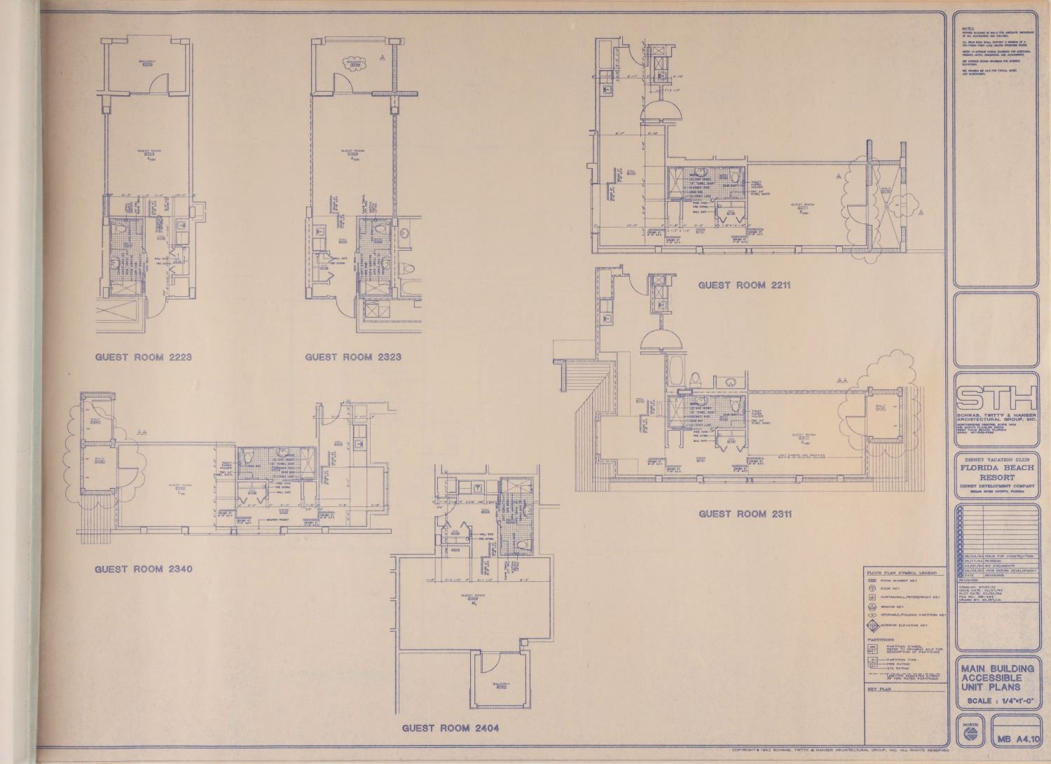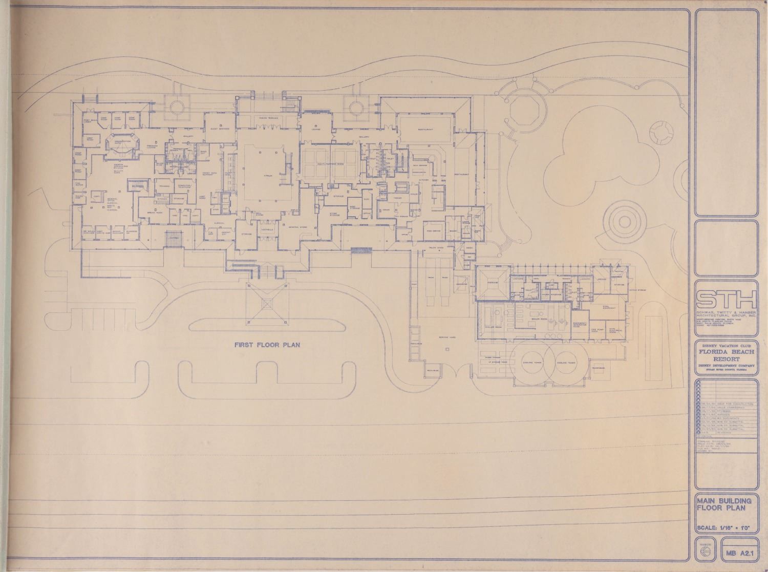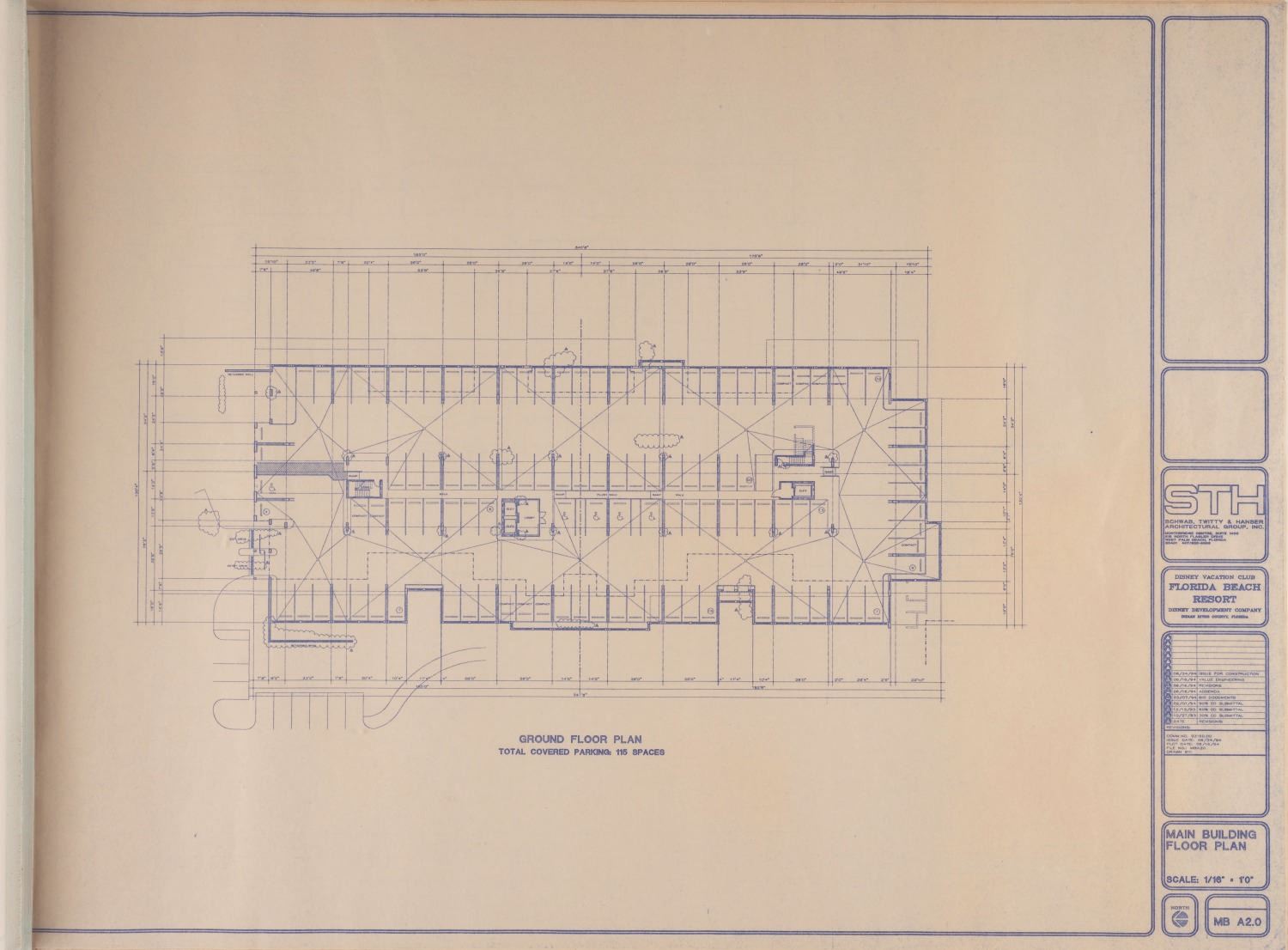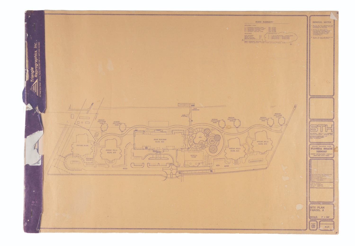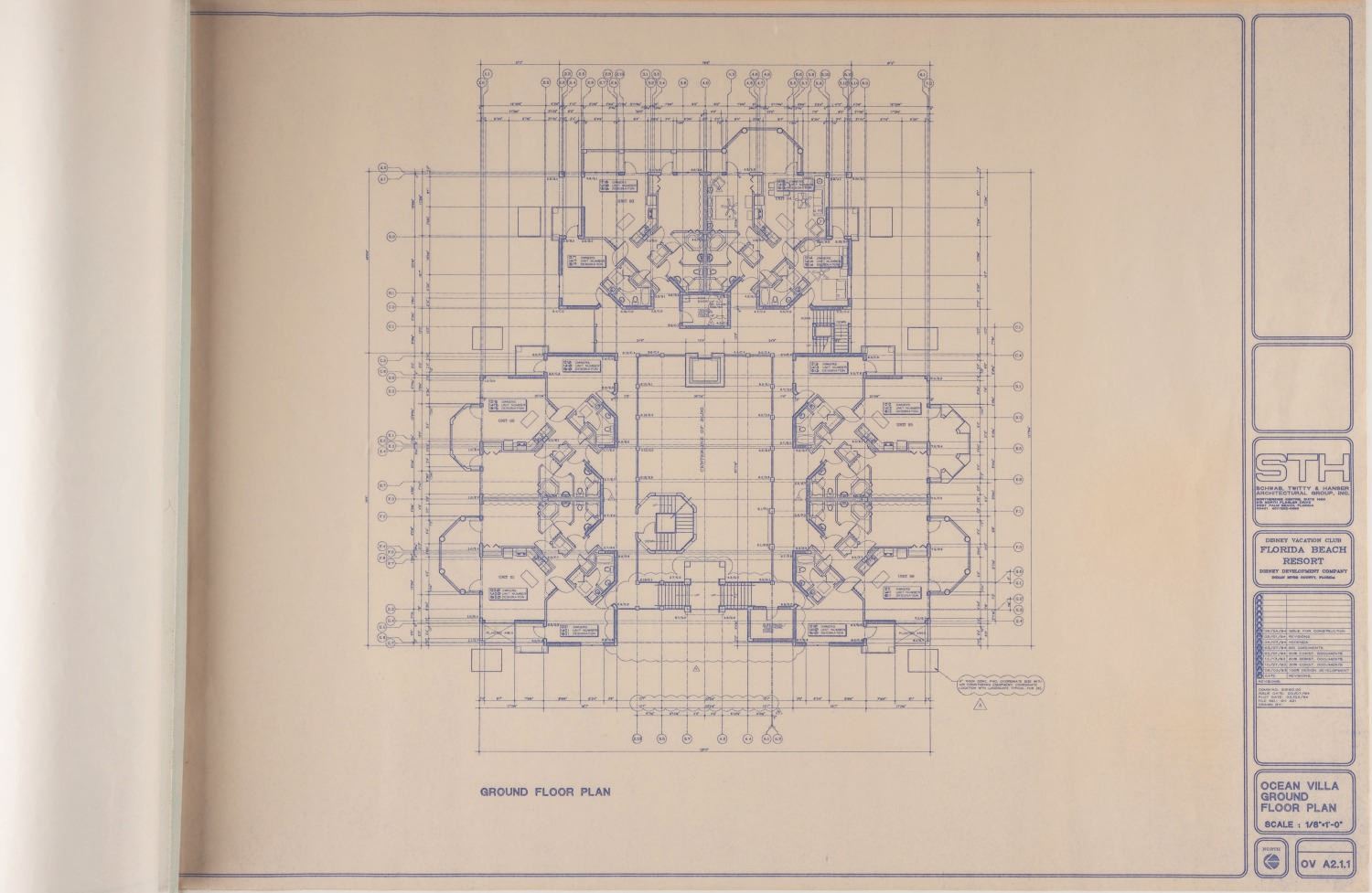 (Disney Vacation Club, 1994) A set of blueprints for the Disney Vacation Club Vero Beach Resort. The stapled pad of 11 blueprints includes the site plans, main building, and ocean villa layouts. Measuring 15” x 21”, the blueprints are in good condition with wear from production use, discoloration to the edges and front page from age, and some small chipping, creases, and folded corners throughout.