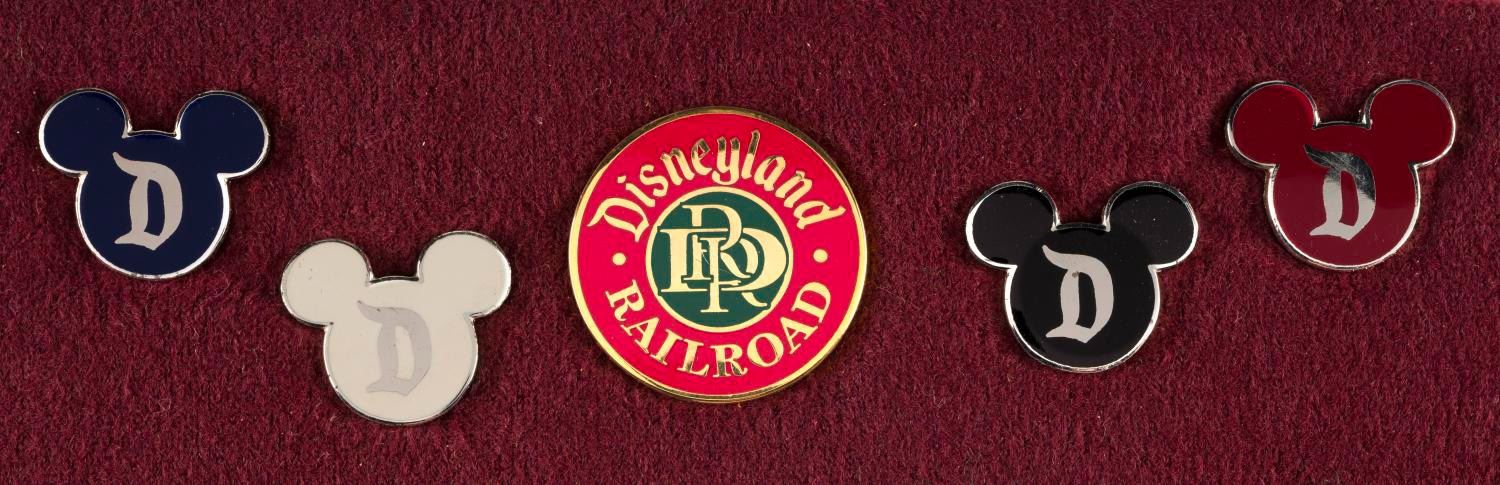 (Disneyland, 2001) A Disneyland Railroad pin and (4) Disneyland Security pins. These pins were used by Disneyland Railroad conductors for security after 9/11. All are in fine condition.
