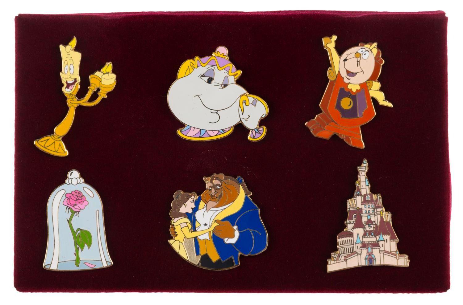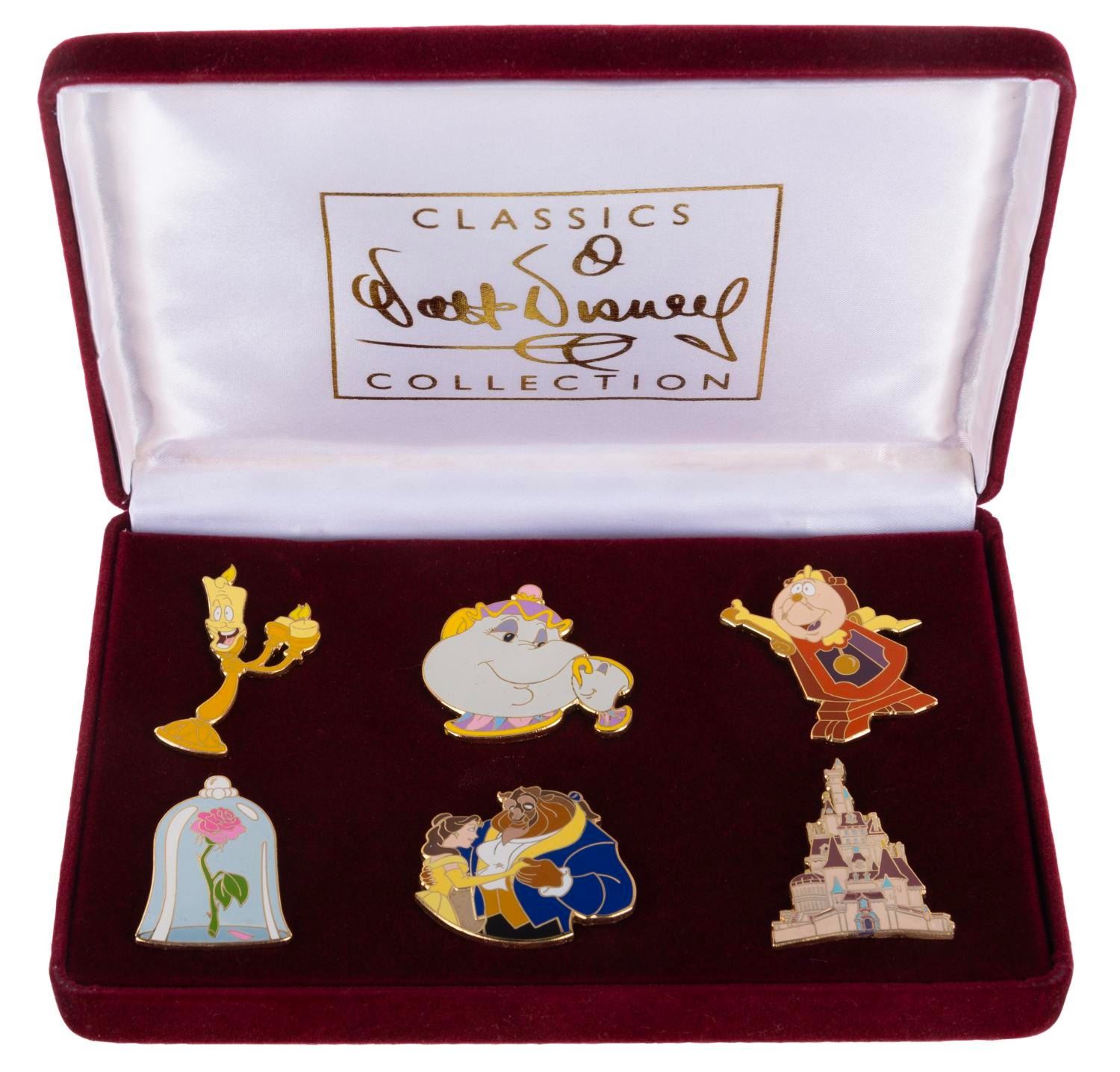 (Disney, 2001) A boxed set of six "Beauty and the Beast” pins, available exclusively as a gift-with-purchase of all the Walt Disney Classic Collections "Great Wide Somewhere” figures at the Studio event on March 3 and 4, 2001. The set is in fine condition, in the 4” x 6” velvet display box.