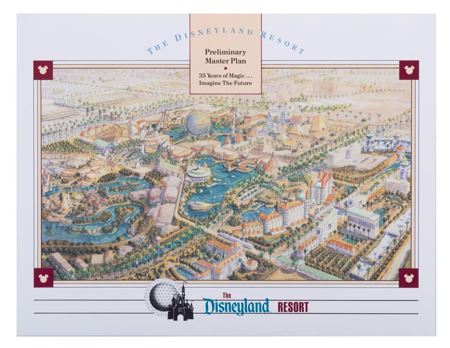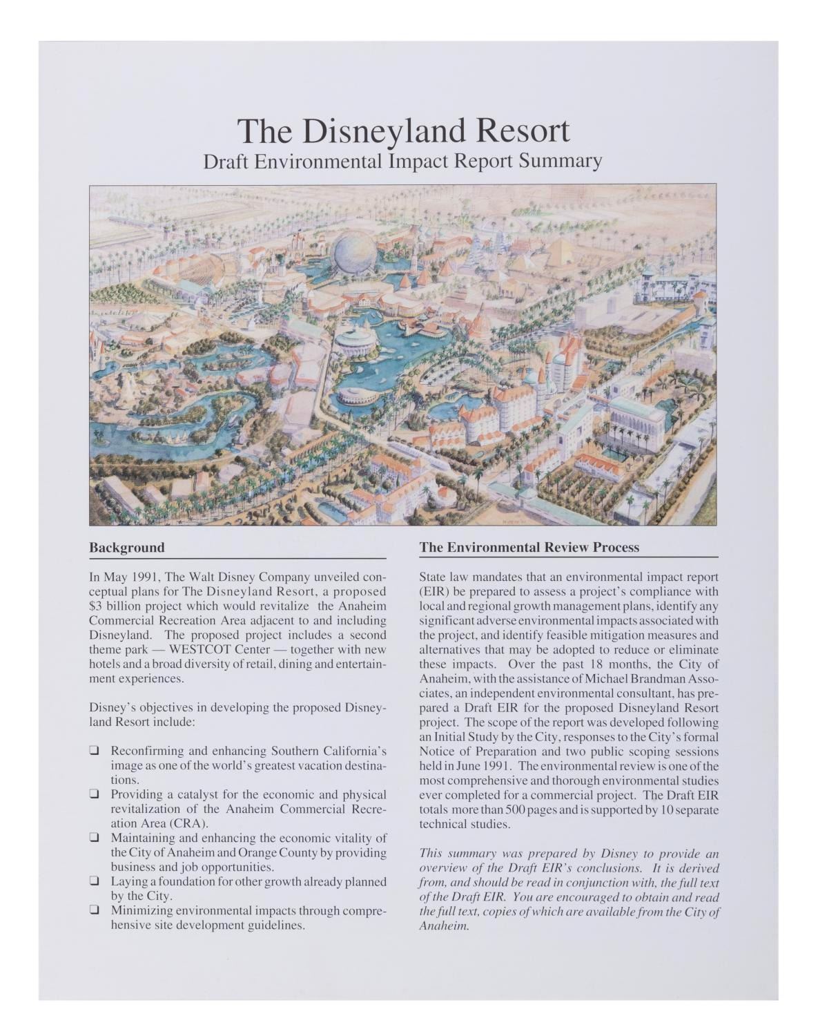 (Disneyland, 1990-1993) A set of three fold-outs about the expansion of the Disneyland Resort and how it would impact the surrounding area. Included are brochures about the EPCOT-style WESTCOT Center and Disney's California Adventure Park. Measuring 8"x12" and 11"x8.5", each piece is in very good condition with mild creases along their original folds and minor wear.