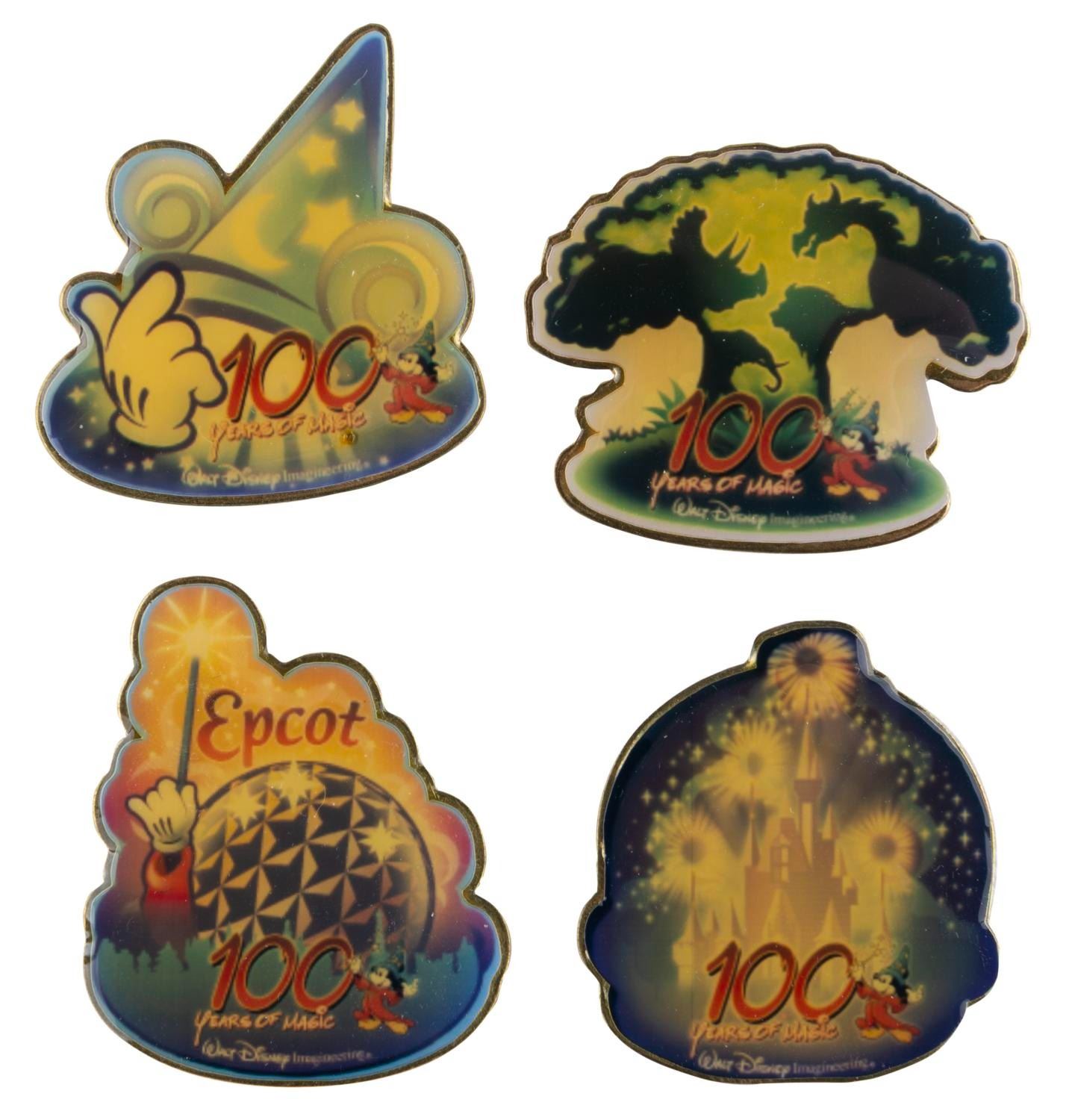 (WDI, 2001) This is a set of four Disney pins celebrating "100 Years of Magic" featuring Mickey's Sorcerer Hat, Spaceship Earth, The Tree of Life, and Cinderella’s castle to represent the four Florida Parks. The pins are in fine condition with typical discoloration from age.