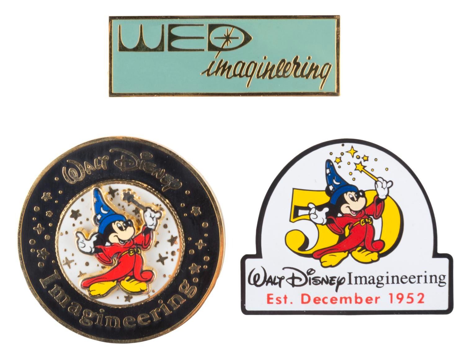 (Disney, 2000s) A collection of three Walt Disney Imagineering pins, including a Cast Exclusive logo spinner pin, an "Established 1952” WDI exclusive pin, and an early WED logo general release pin. The pins are in very good to fine condition.