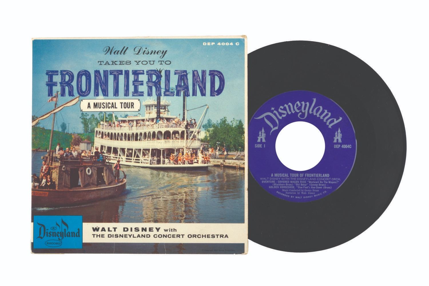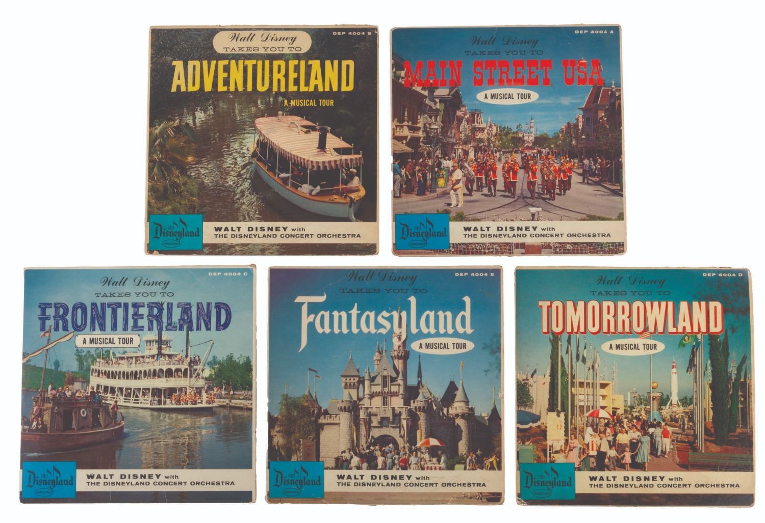 (Disneyland, 1956) A set of five Walt Disney Takes You to… 45 RPM records, with music composed and conducted by Disney Legends George Bruns and Tutti Camarata. Included are albums dedicated to Adventureland, Fantasyland, Frontierland, Tomorrowland, and Main Street, U.S.A. Measuring 7" x 7" each, the records are in fair to good condition with creases, scratches, light stains, and wear. The Main Street record has a stray ink mark and an address label on the reverse, and the Fantasyland record has a 3.25" area of paper loss on the reverse.