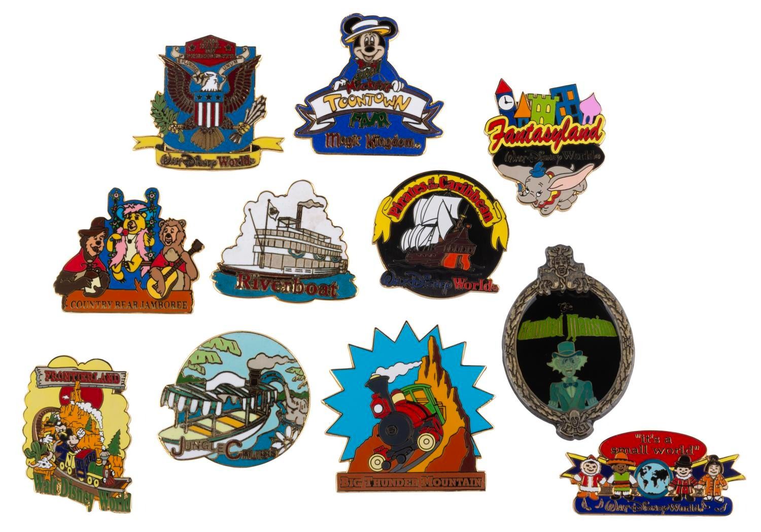 (Walt Disney World, 2000) A collection of 11 pins of Walt Disney World attractions and lands, including The Haunted Mansion, Pirates of the Caribbean, Country Bear Jamboree, The Hall of Presidents, Mickey’s Toontown Fair, and more. The pins are in very good to fine condition.