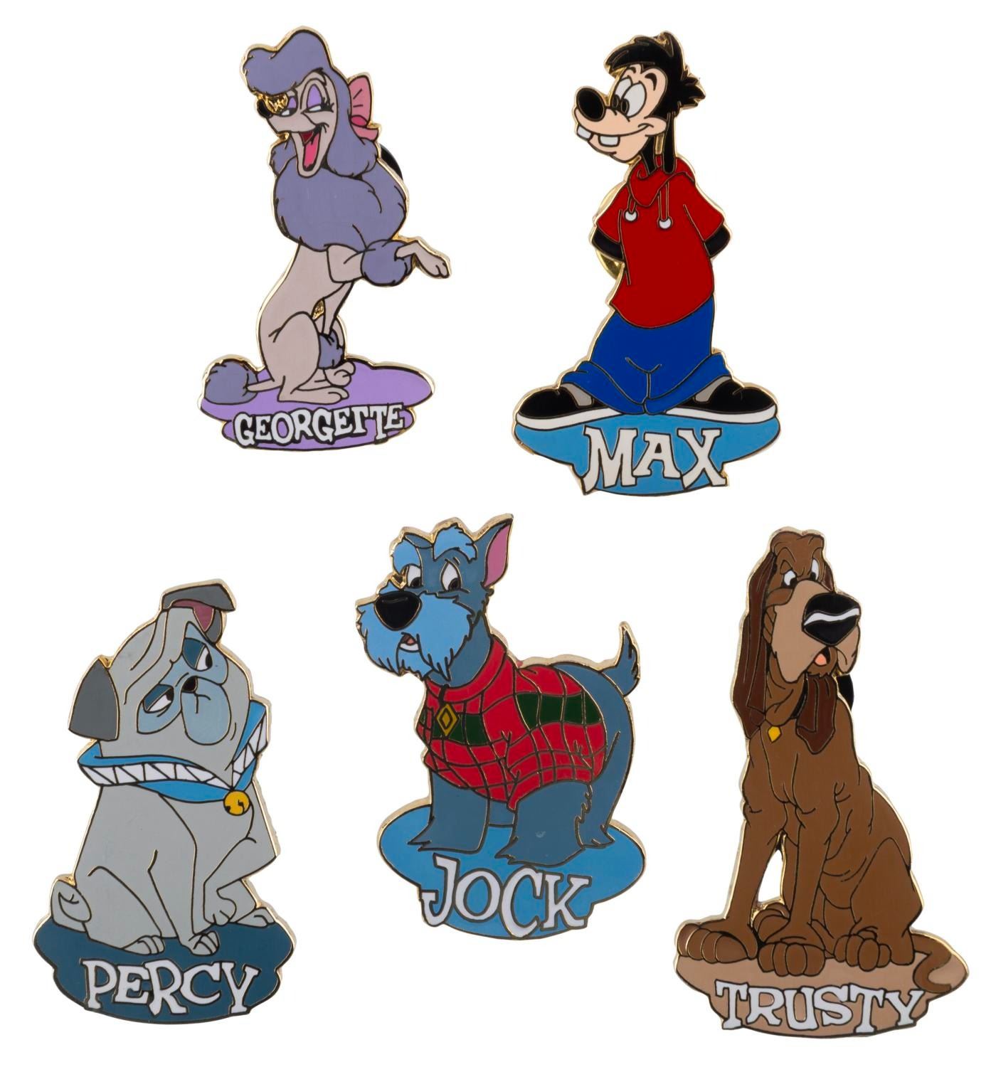 (Walt Disney World, 2000) A set of five "Canine” pins released at Walt Disney World featuring Jock and Trusty from "Lady and the Tramp,” Georgette from "Oliver and Company,” Percy from "Pocahontas,” and Max from "Goof Troop. The pins are in very good condition.
