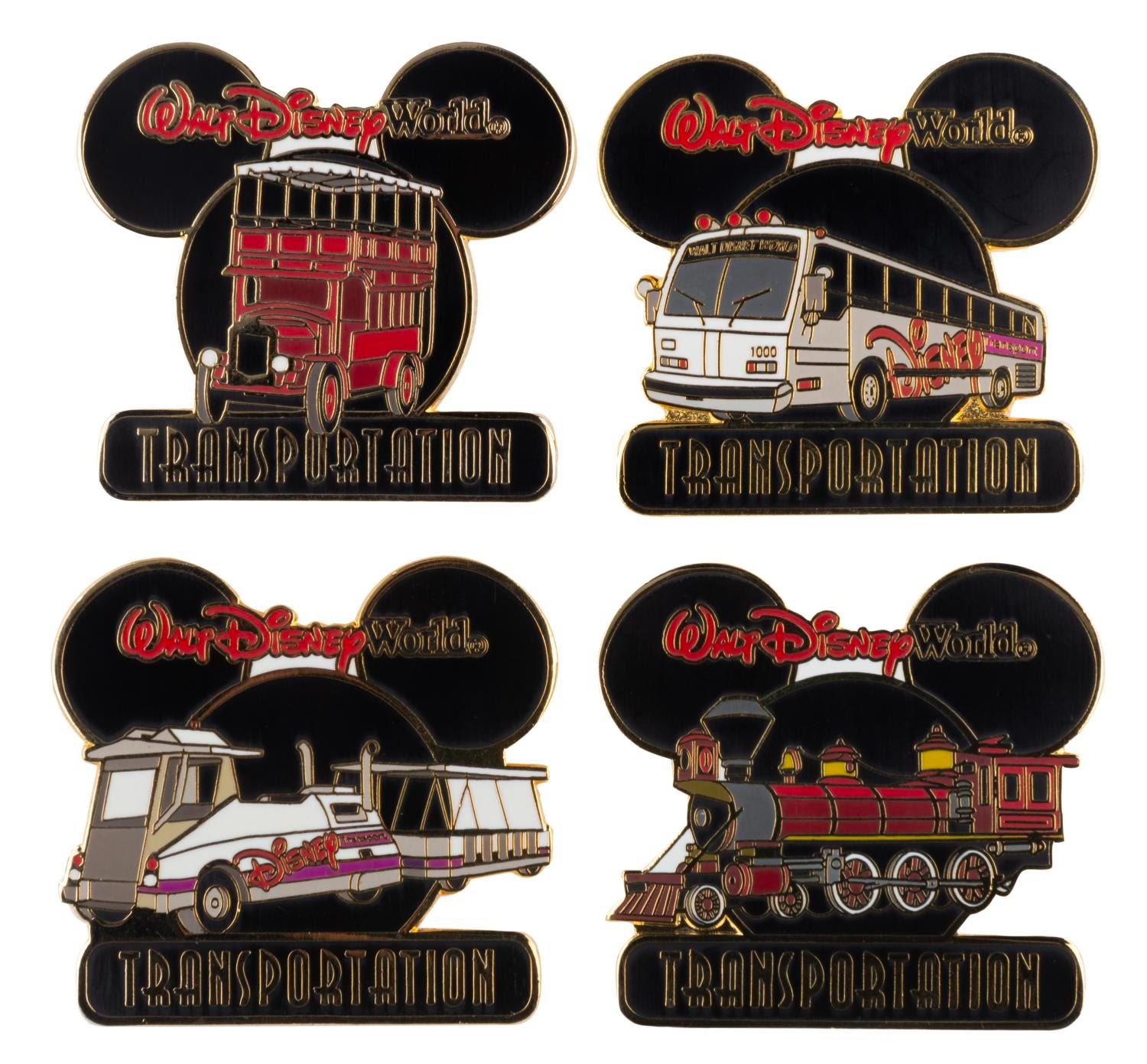 (Walt Disney World, 2000) A set of four Walt Disney World transportation pins, each released in a limited edition of 5,000. Included are the Tram, Shuttle Bus, Locomotive Engine, and Double Decker Bus. Each measuring just over 1.5” x 1.5”, the pins are in fine condition.