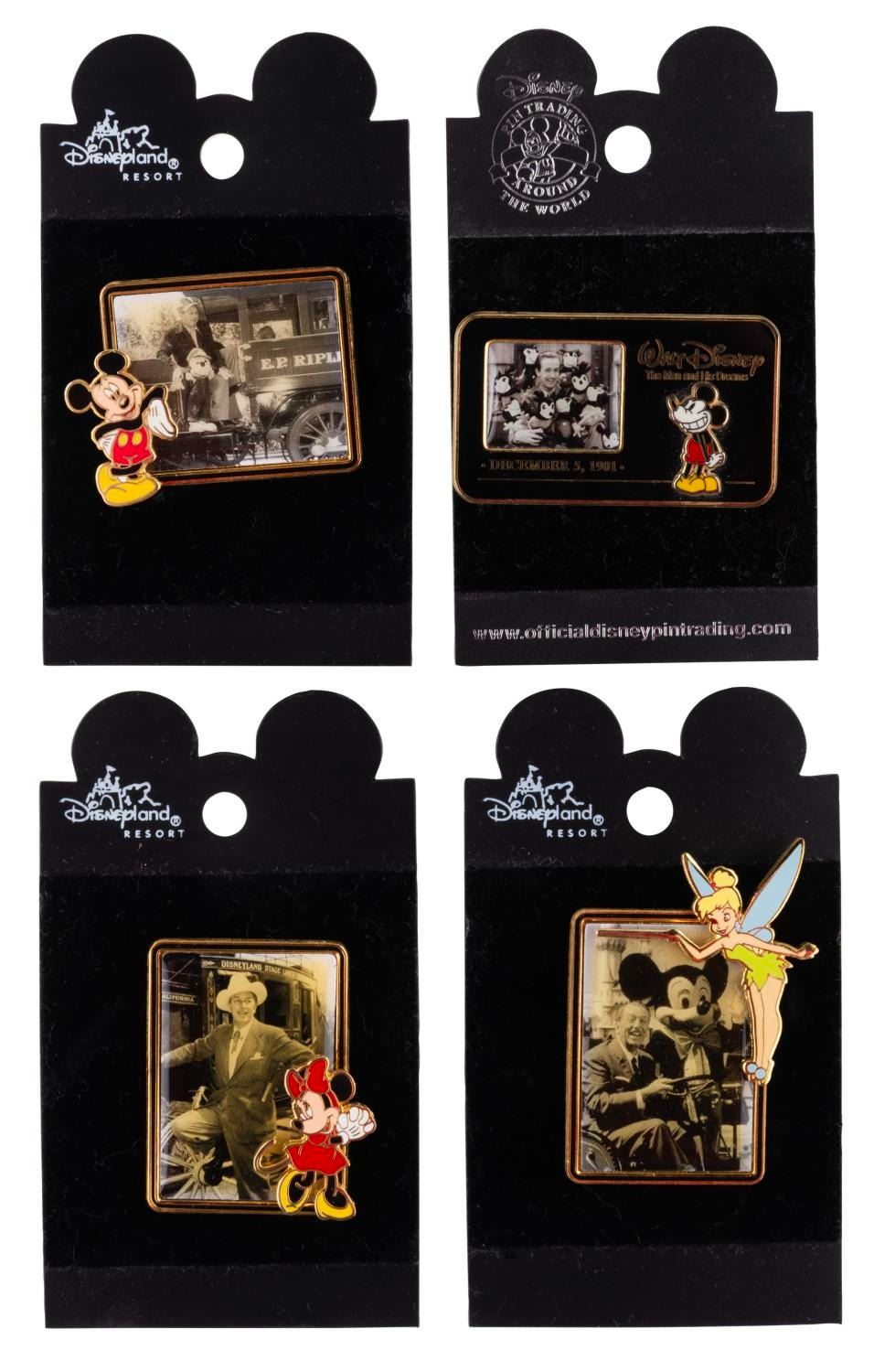 (Disneyland Resort, 2001/2005) A collection of Disneyland pins celebrating Walt Disney’s 100th birthday in 2001. Three pins were released in 2001 at Disneyland, featuring photos of Walt in the Park. The fourth reads "The Man and His Dreams," released in 2005. The pins are in fine condition on the original cards, with slight discoloration from age.