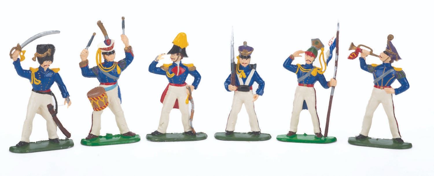 (West Germany, 1980s-90s) A collection of six hand-painted plastic soldiers in 18th or 19th century uniforms. Each standing up to 3.25" tall the toys are in very good condition.