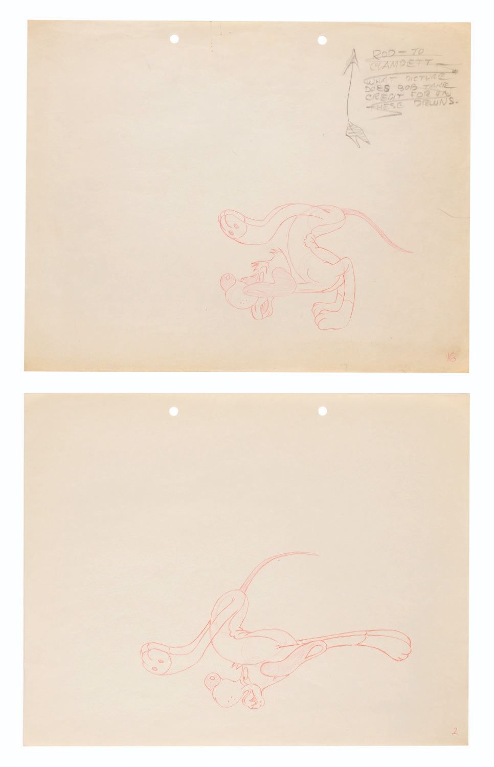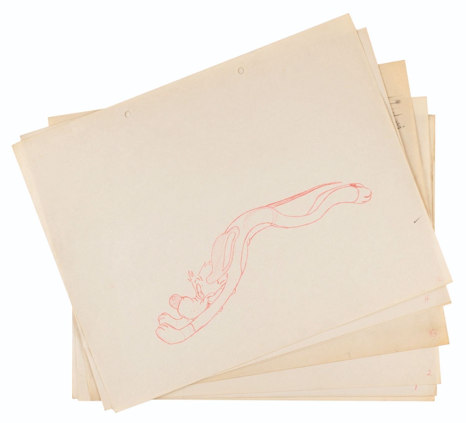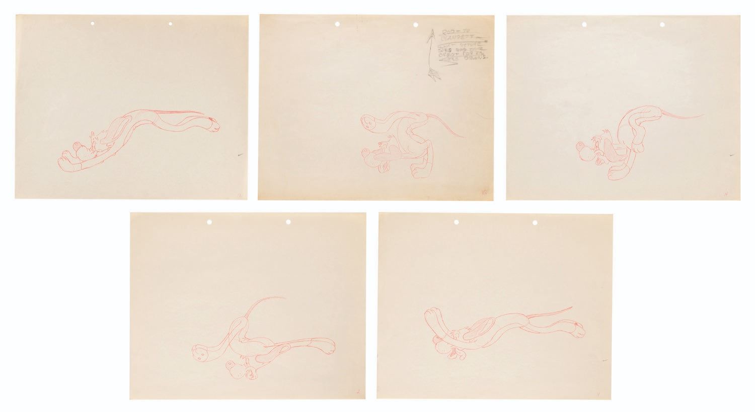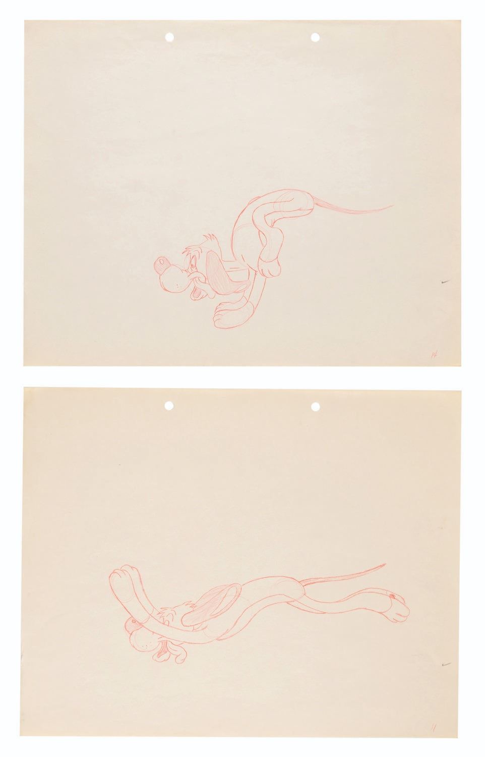 (Schlesinger, 1941) A set of nine production drawings of Willoughby the dog from the Merrie Melodies cartoon “The Crackpot Quail,” directed by Tex Avery. The set features key poses in Willougby’s exaggerated run cycle with hind legs that get ahead of himself. The drawings are accomplished in red pencil on 9.5” x 12” animation paper, with one trimmed to 5.5” x 12”. The drawings have image sizes of up to 4” x 7” and are overall in very good production-used condition with light wear from age, and one in good condition with some edge wear and smudges.
