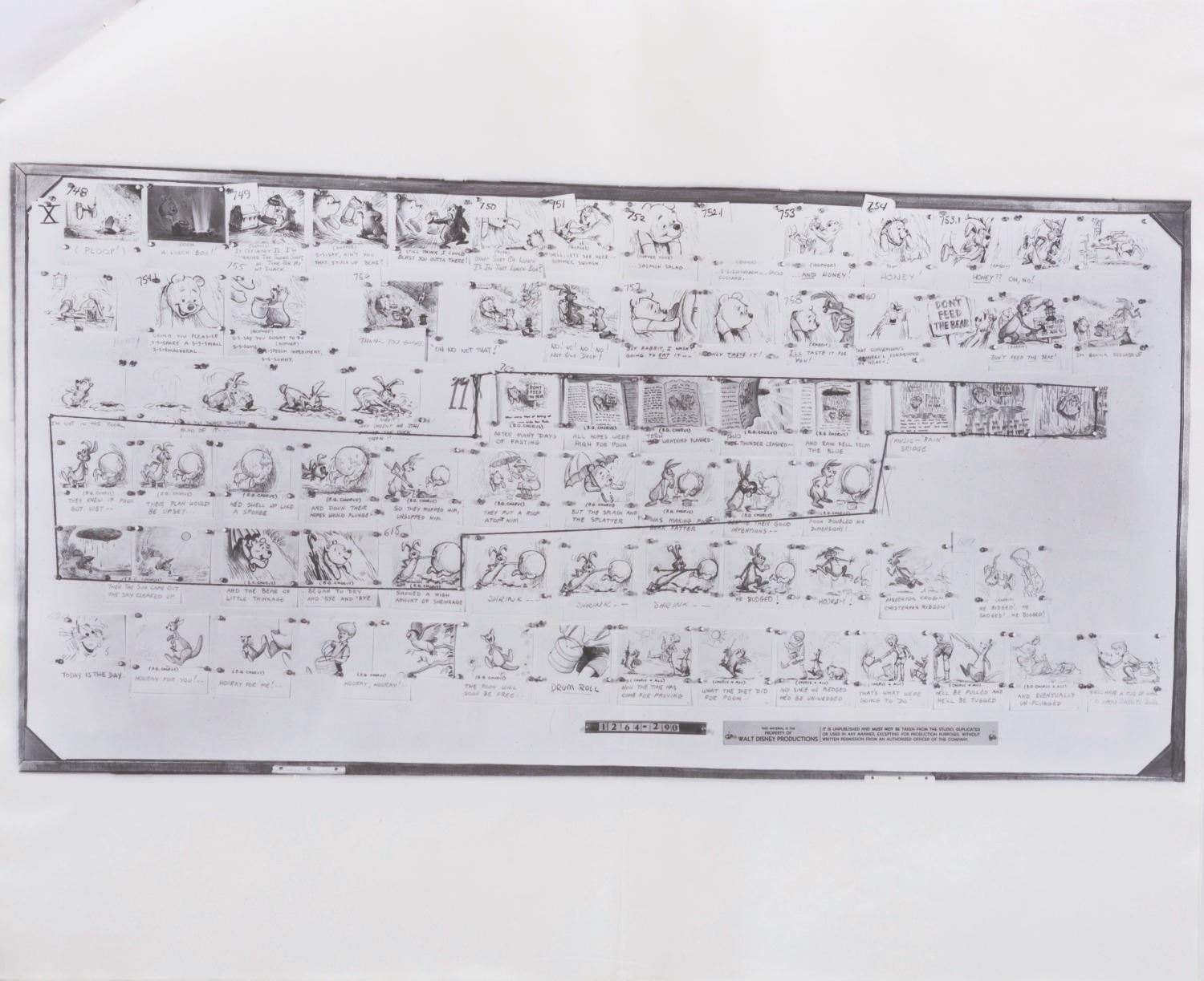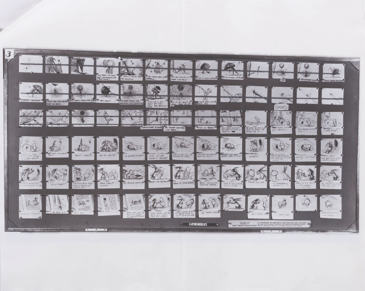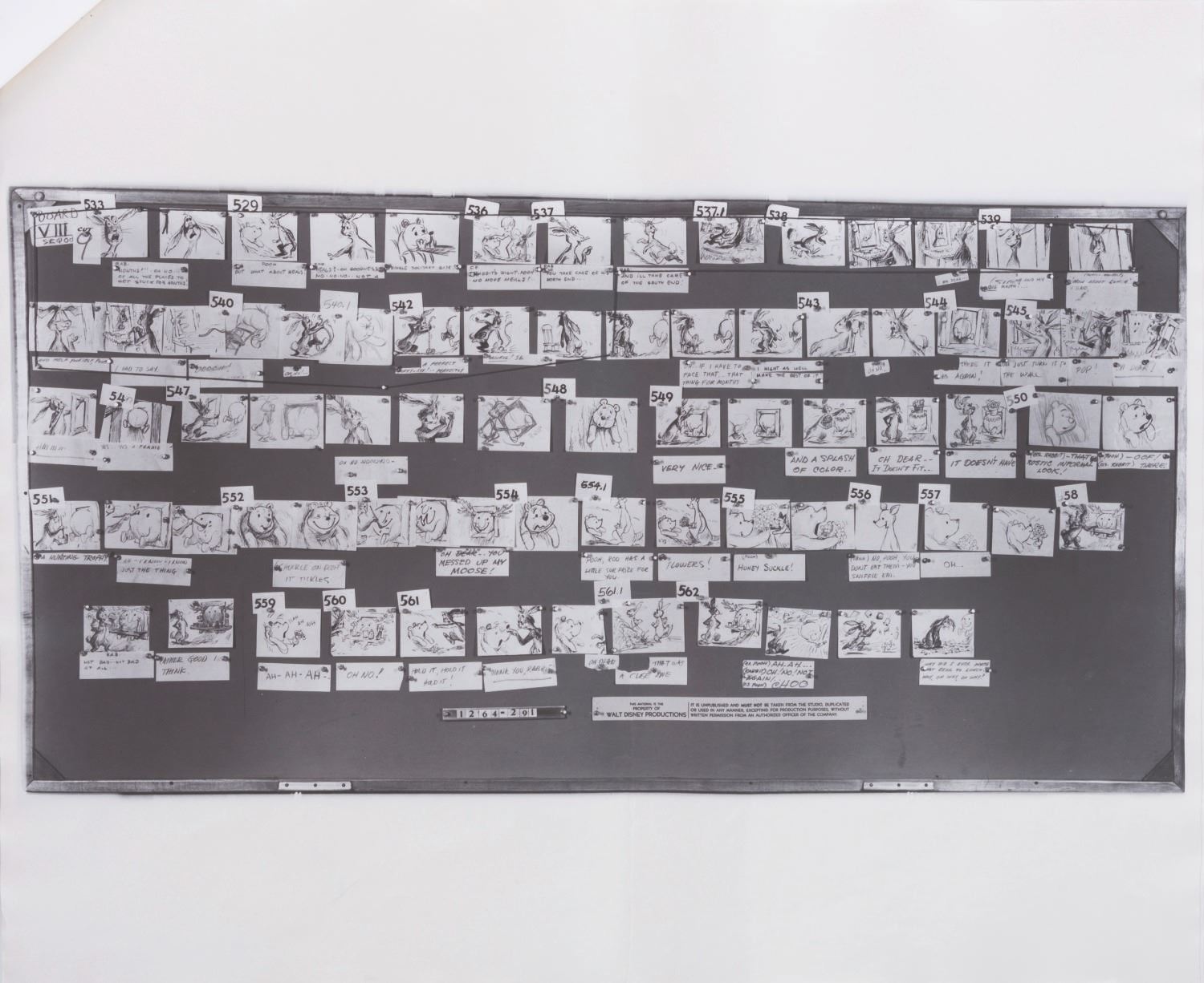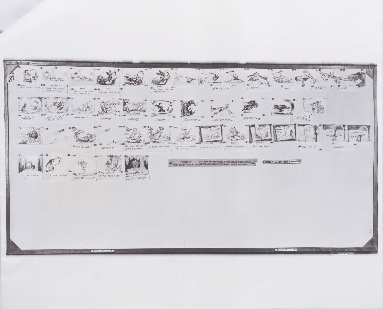 (Disney, 1963-65) A collection of 12 pages of photostat storyboards for "Winnie the Pooh and the Honey Tree." These photographic reproductions of storyboards were used by animators as reference during production. Measuring 14" x 17", the photostats display in very good condition with full vertical folds down the center, creases, wear from production use, light discoloration from age, and two pages crossed out with black marker.