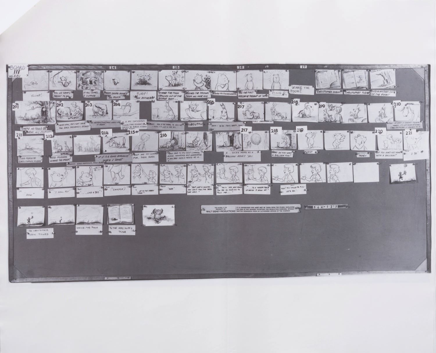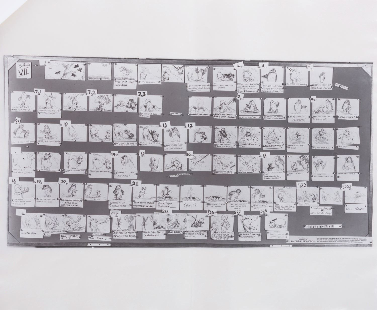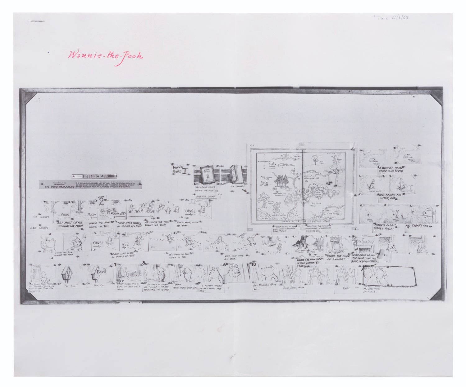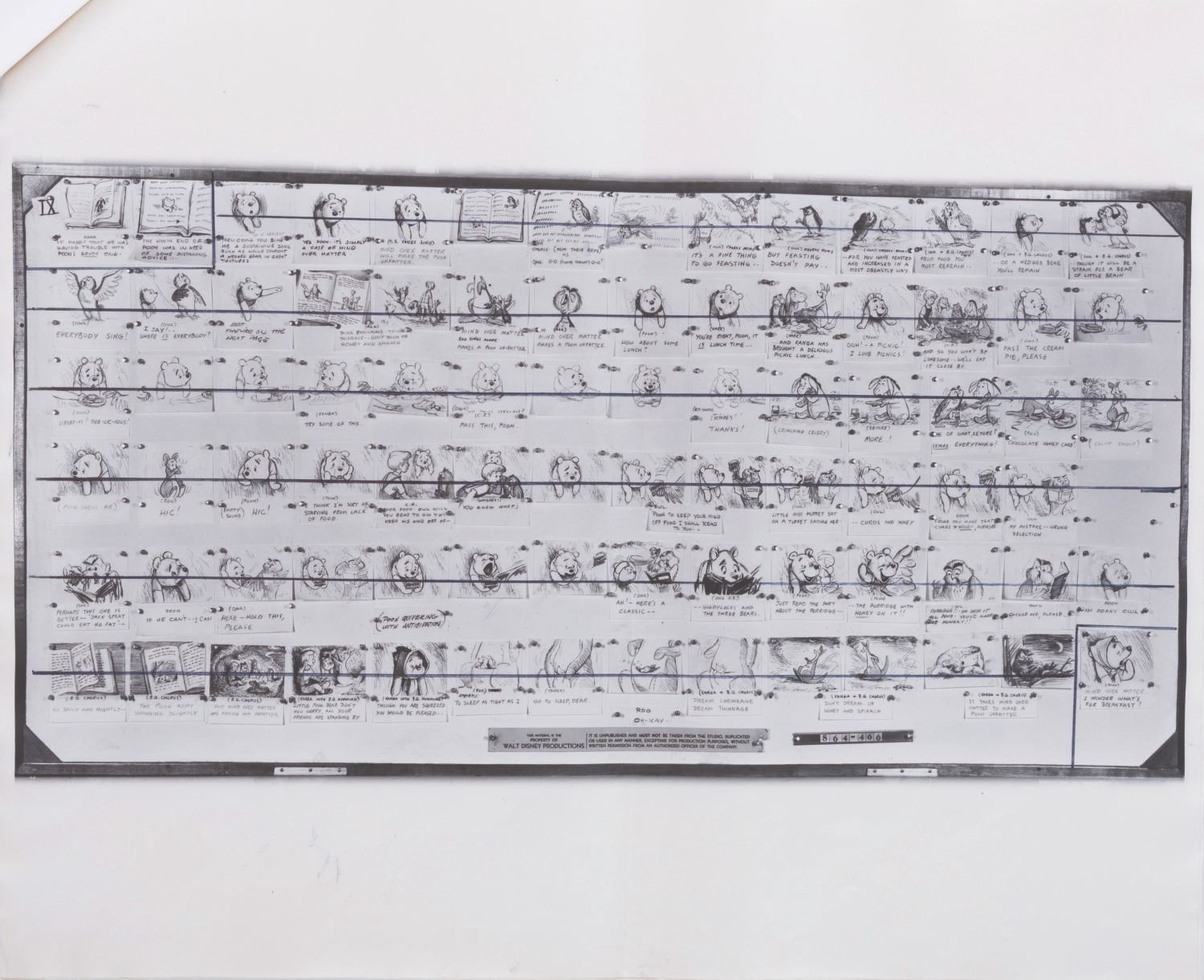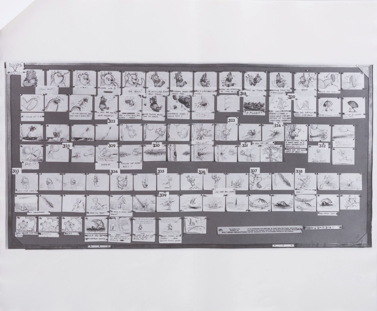 (Disney, 1963-65) A collection of 12 pages of photostat storyboards for "Winnie the Pooh and the Honey Tree." These photographic reproductions of storyboards were used by animators as reference during production. Measuring 14" x 17", the photostats display in very good condition with full vertical folds down the center, creases, wear from production use, light discoloration from age, and two pages crossed out with black marker.