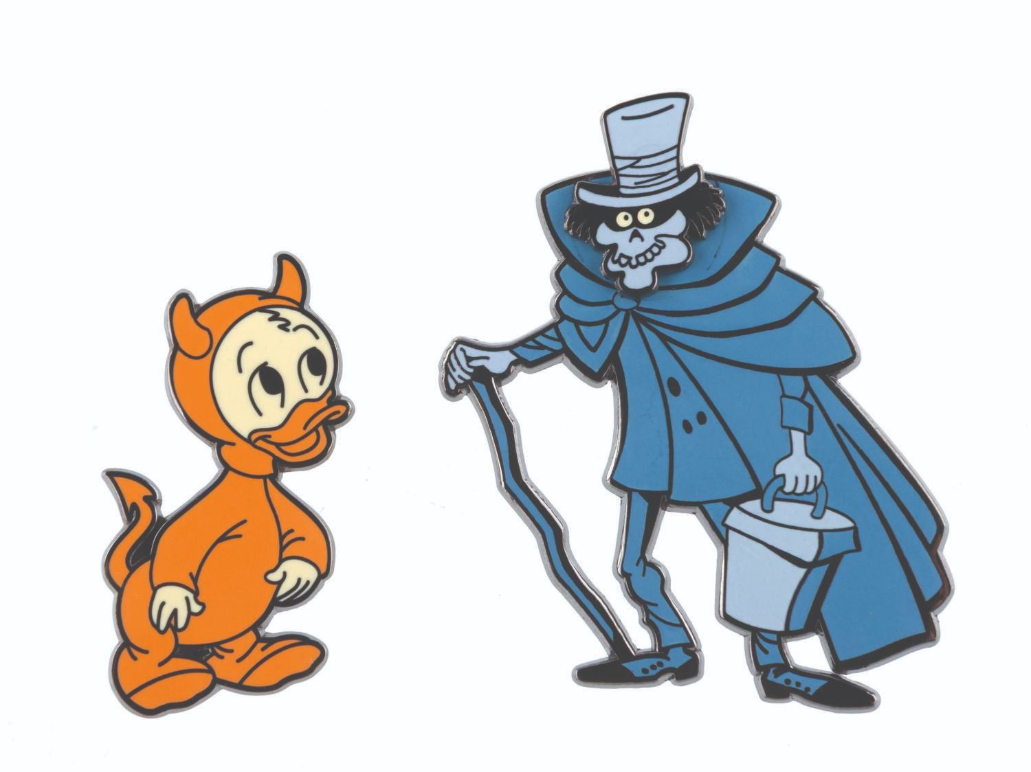 (Disney, 2003) A two pin set of the Haunted Mansion's Hatbox Ghost and one of Donald's nephews in a devil costume from the cartoon "Trick or Treat." This set was offered in a limited edition of 1000 exclusively through the Disney Catalog, and includes the first pin ever of the Hatbox Ghost. Measuring up to 1.5" x 2", the pins are in fine condition.