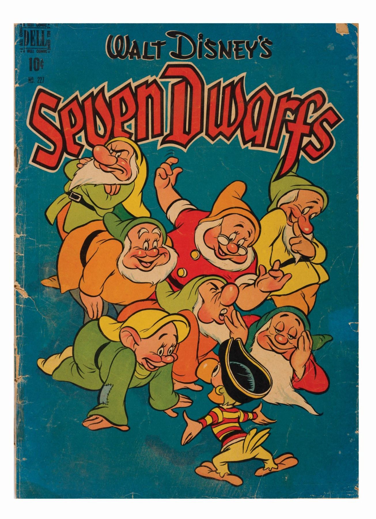 (Dell, 1947) A copy of "Walt Disney's Seven Dwarfs" comic book issue no. 227. Measuring 7.25" x 10.25", the comic is in fair condition, with much edge wear especially to the spine, a .5" tear at the center spine, tape repair to the back, and chipping to the cover.