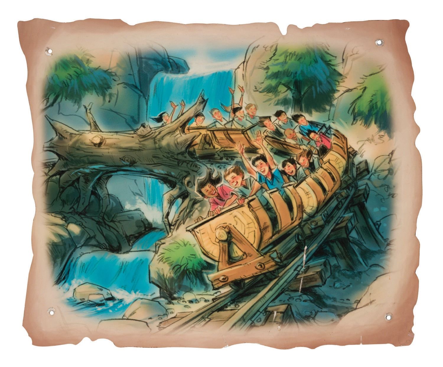 (Walt Disney World, 2013-14) A rare concept art exhibit sign posted along the construction barrier of the Seven Dwarf's Mine Train in Fantasyland at The Magic Kingdom. Measuring 18"x15", the sign is in very good Park-used condition with wear throughout from exposure, handling, and age.