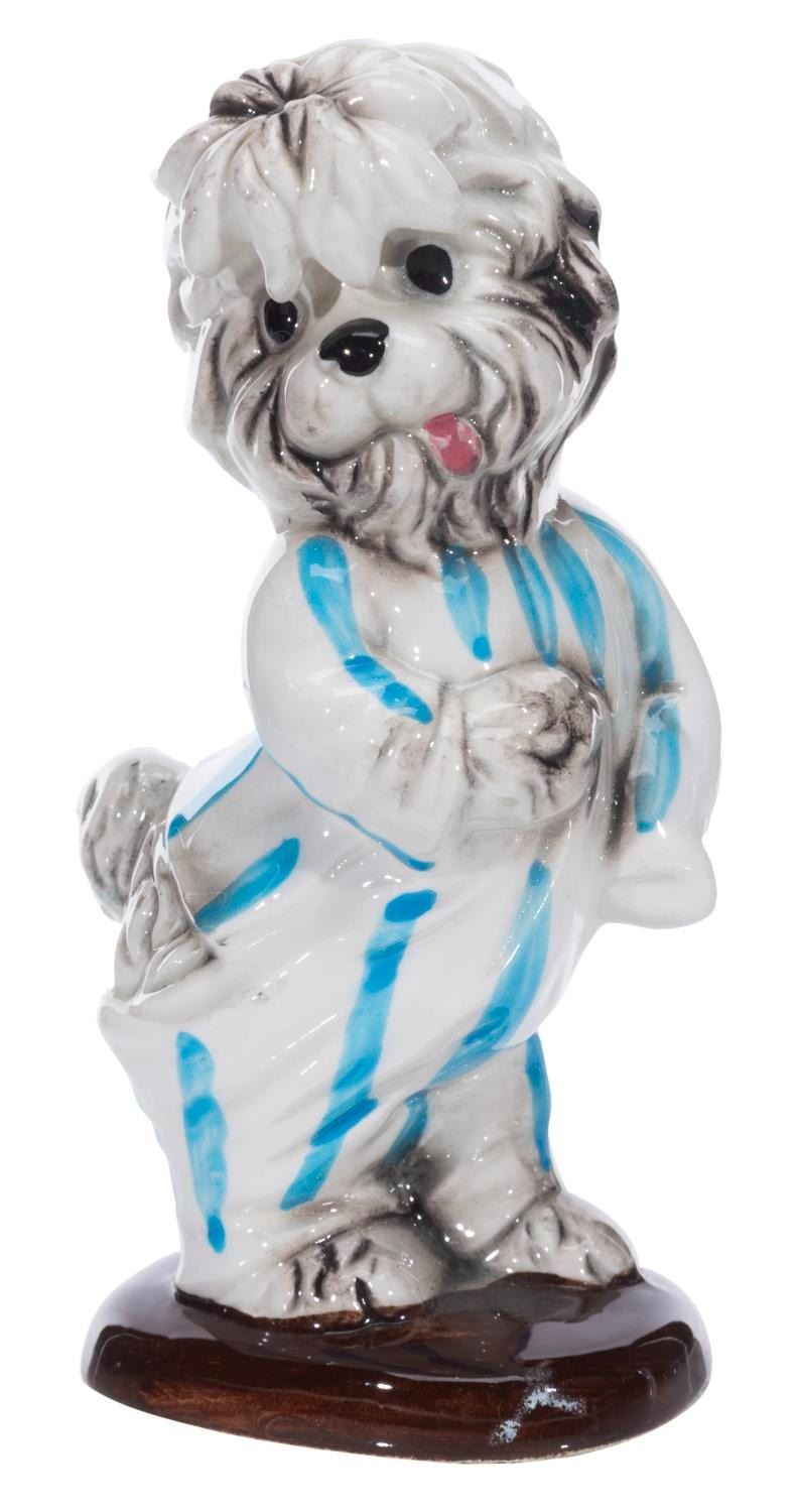 (Enesco, 1960s) A painted and glazed ceramic figurine of the Shaggy Dog, from the live-action Disney movie of the same name, manufactured by Enesco. Measuring 2.75" x 1.75" and 5" tall, the figure is in very good condition with minor imperfections in the glaze.