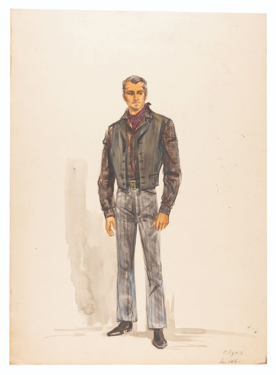 (Paramount, 1953) An early costume design for Alan Ladd as the title character in "Shane.” Shane's costume in this design more closely resembles his depiction in the book rather than the film. Measuring 14.5” x 20”, the colored pencil, marker, and watercolor design on artist board displays in very good condition with light creases, edge wear, scuffs, smudges, and spots of discoloration from age.