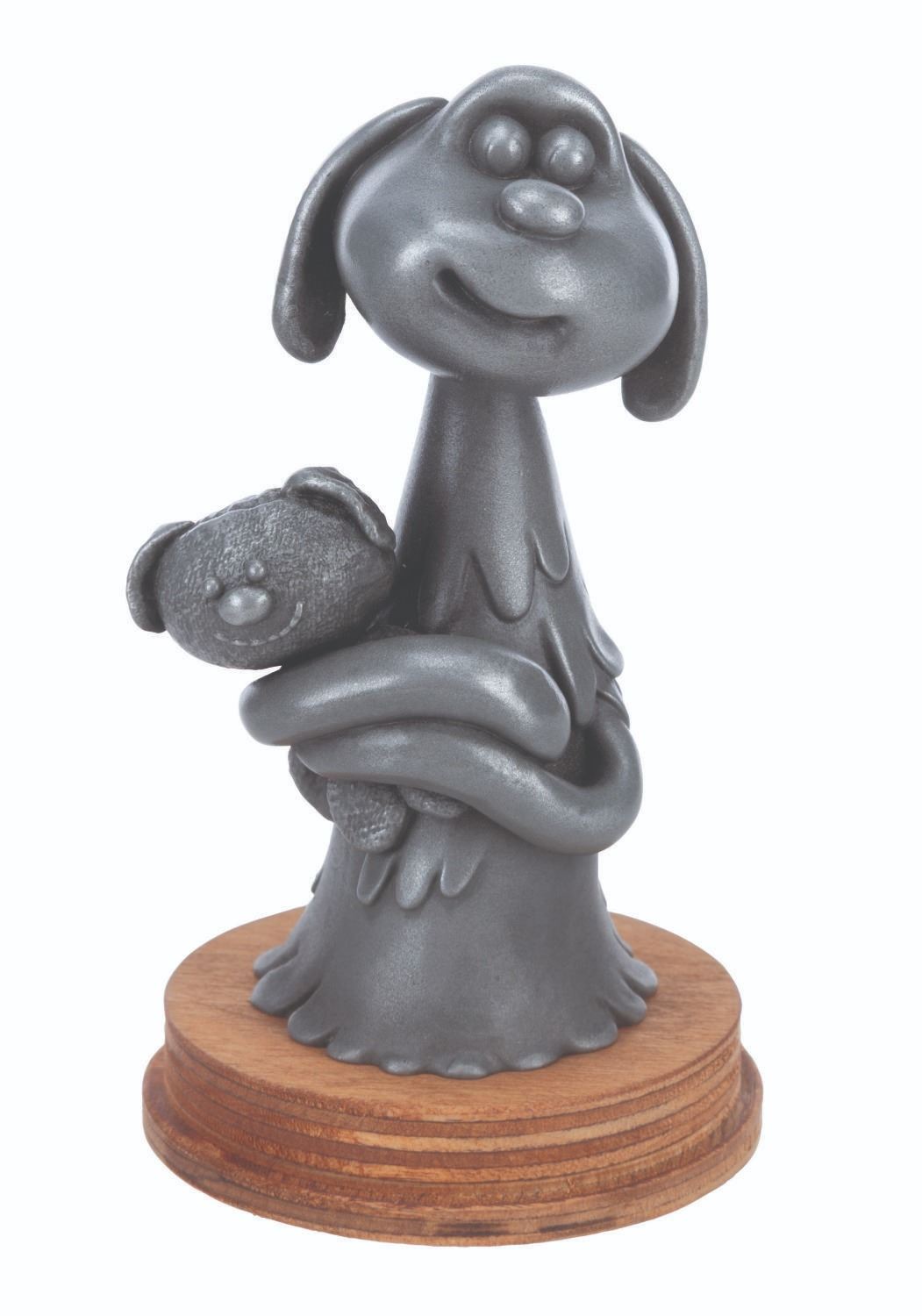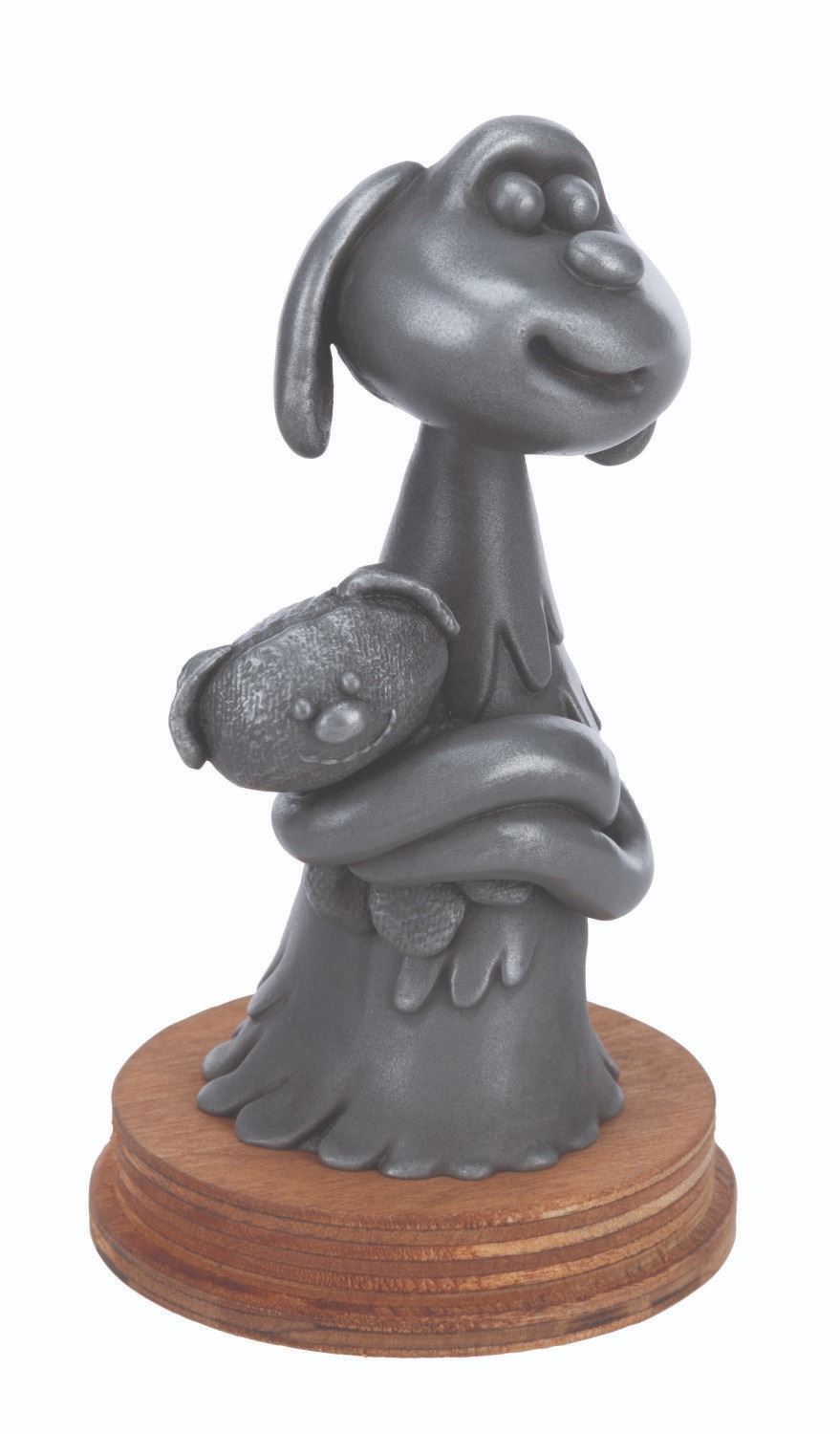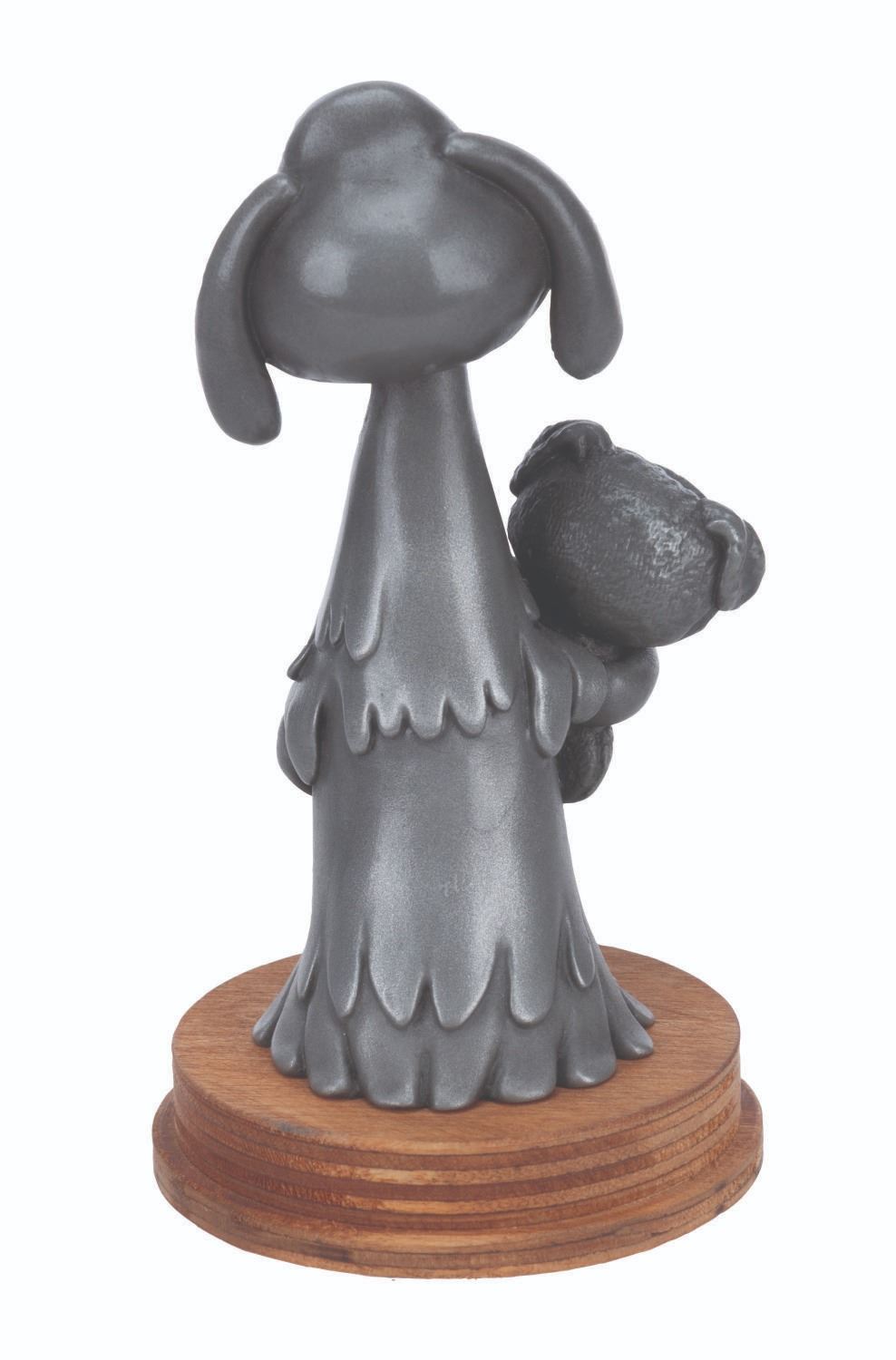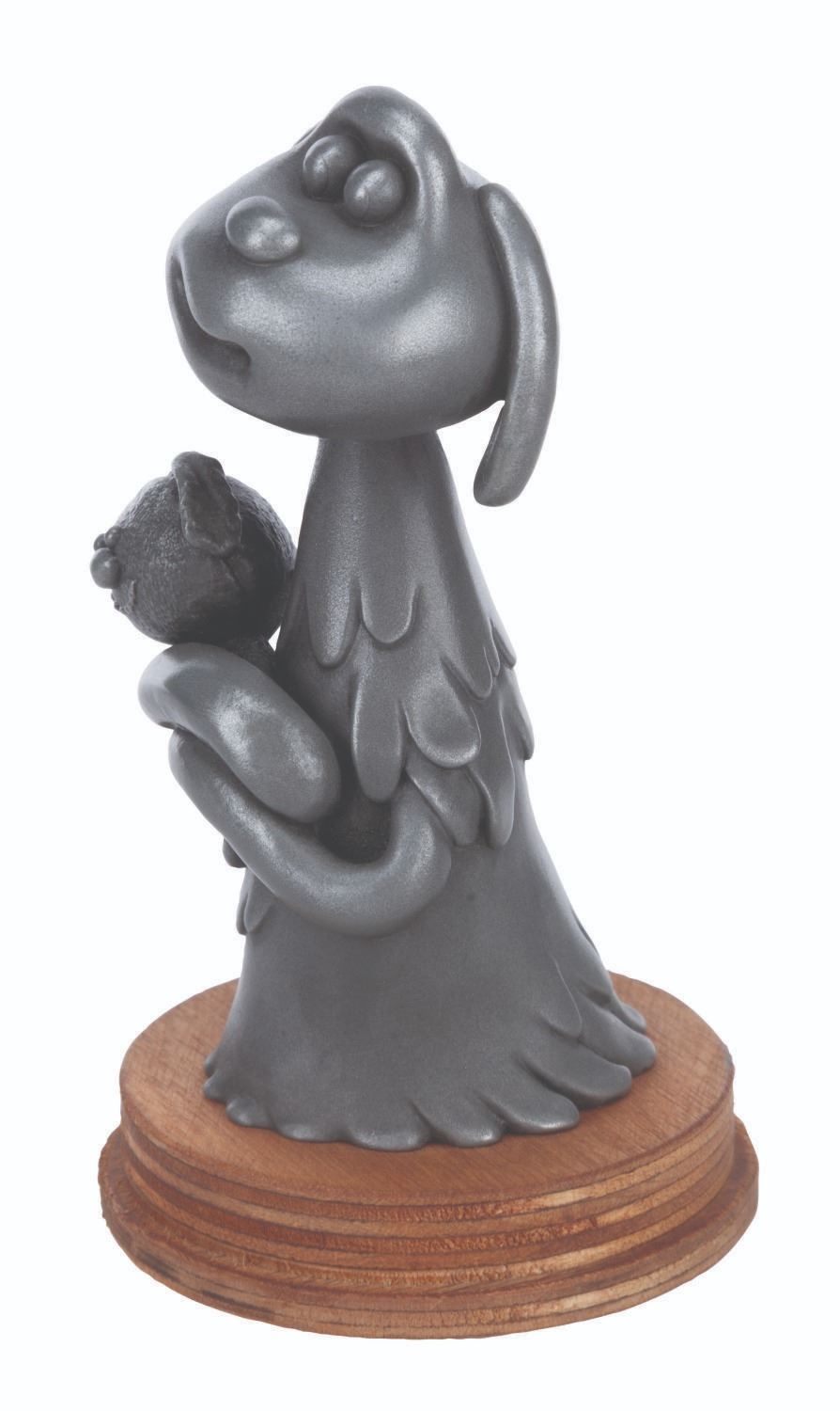 (Aardman, 2019) A Lu-La statue given to crew members of the stop-motion film “A Shaun the Sheep Movie: Farmageddon.” The resin statue of the alien holding a teddy bear is displayed on a wooden base with the film’s title treatment and “Crew” engraved on the bottom. Measuring 3.75” tall and 2.25” in diameter, the statue is in very good condition with light wear.