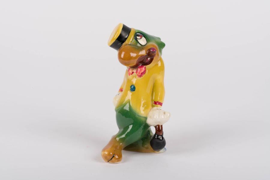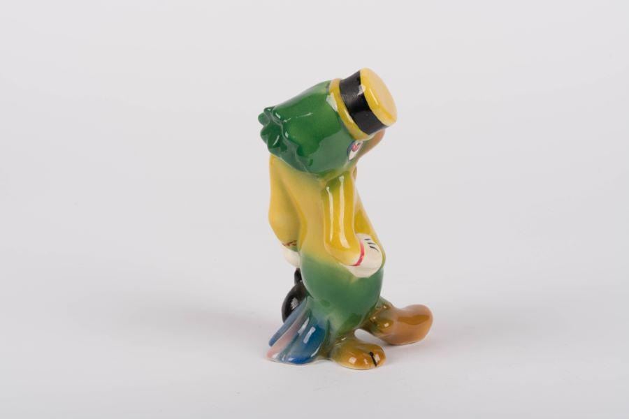 (Shaw, 1940s) A painted glazed ceramic figurine of Jose Carioca from "The Three Caballeros” by Evan K. Shaw. Measuring 3” x 3.5” and 5.75” tall, the figurine is in very good condition with imperfections in the glaze, light wear from age, and light crazing to the white areas.