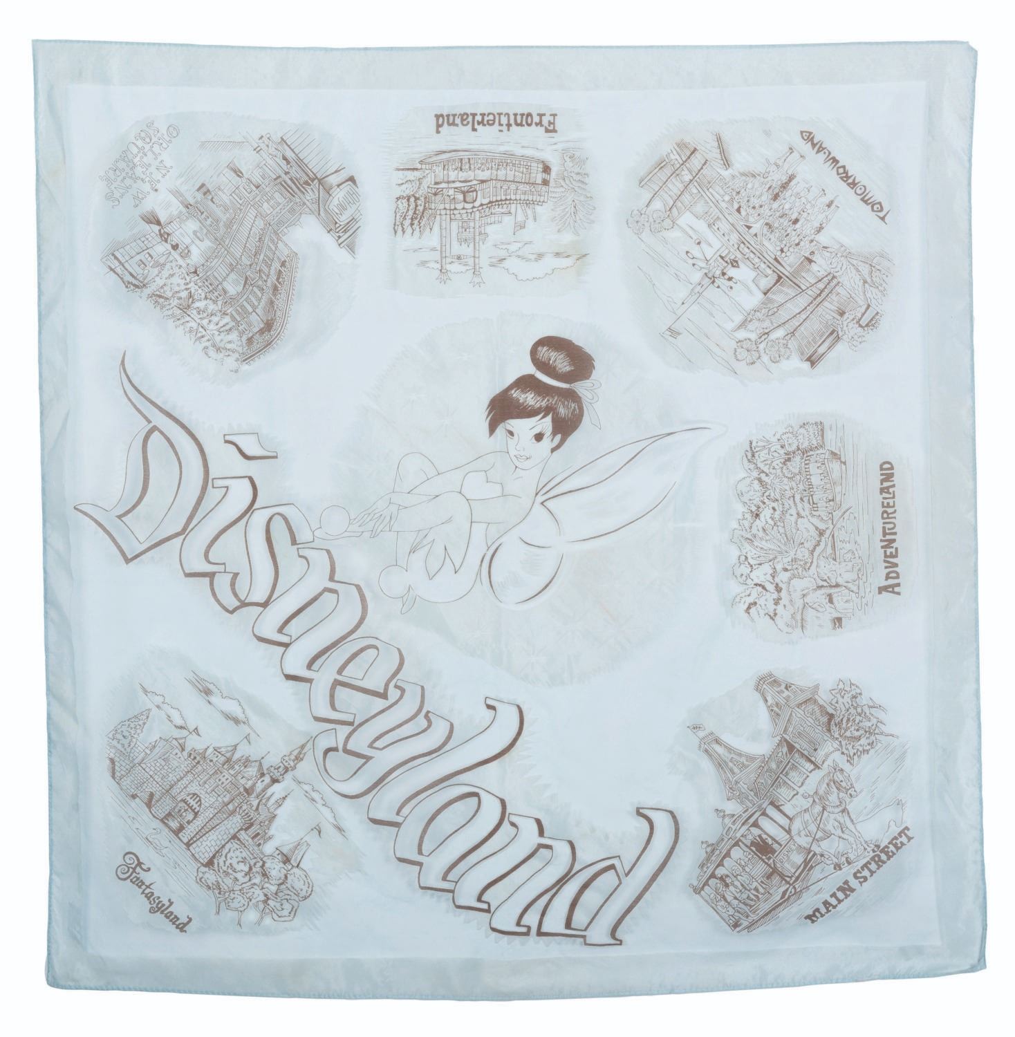(Disneyland, 1960s) A Disneyland scarf featuring the Park’s lands around the borders and Tinker Bell in the center. Measuring 27" x 27", the scarf displays in very good condition with stains and wear.