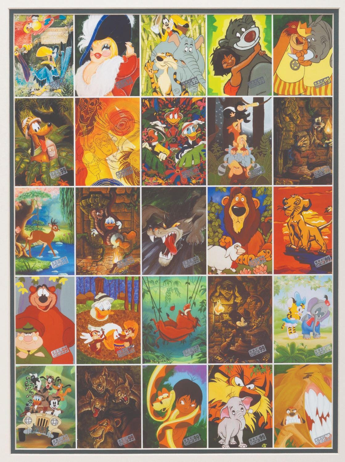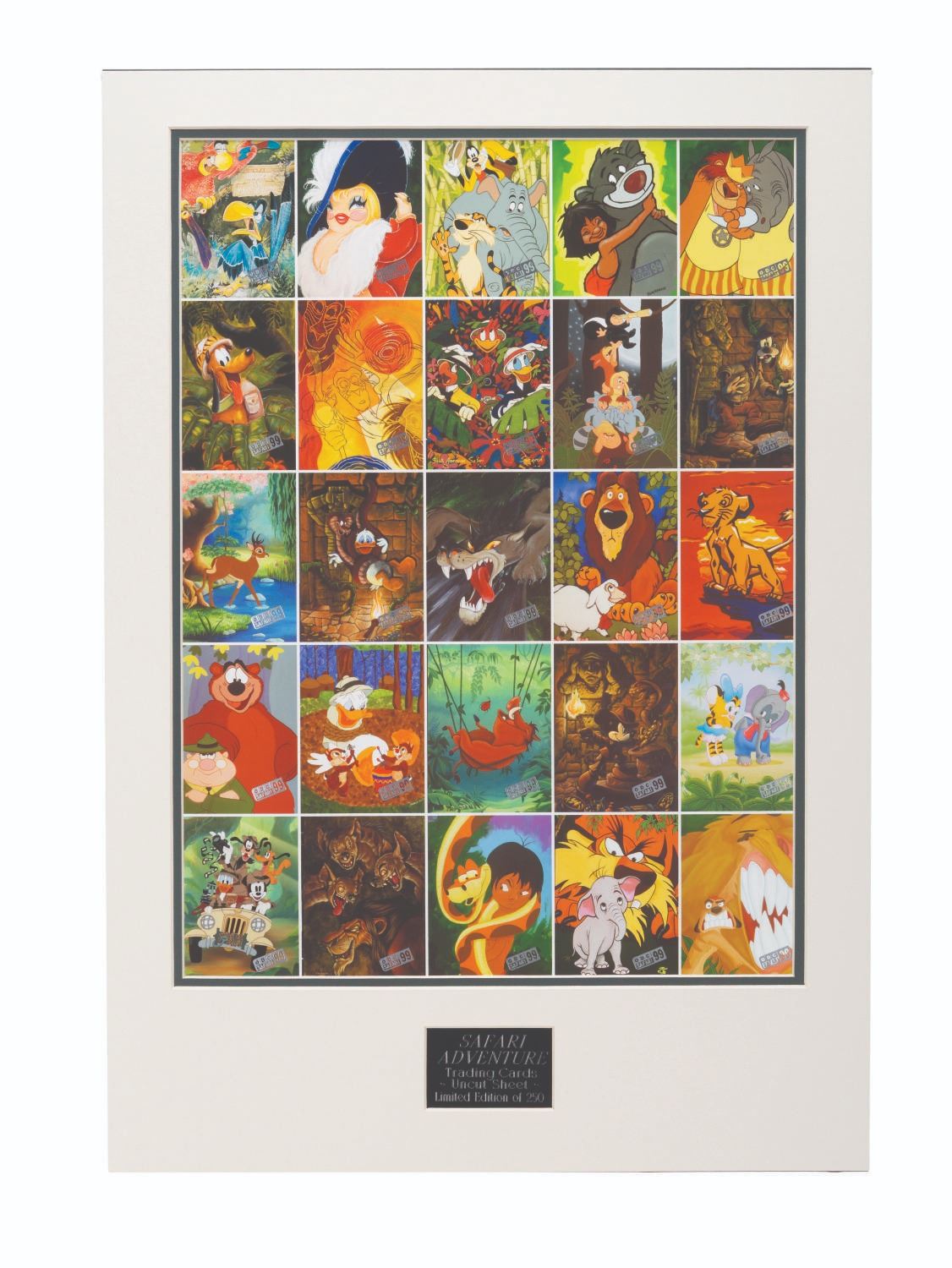 (Disney, 1999) An uncut set of 25 Disney Safari Adventures cards, released in a limited edition of only 250 at the 1999 Disneyana Convention in Walt Disney World. The set comes in a special matte that allows the back with artist information to also be displayed. Measuring 17.25" x 24.5" overall, the set is in fine condition.