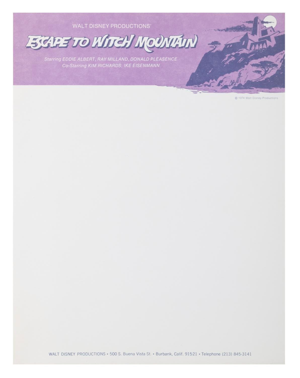 (Disney, 1975) A sheet of Walt Disney Productions letterhead for "Escape to Witch Mountain." This stationery was created and used only for correspondence during the production of this classic film. Measuring 8.5" x 11", the stationery is in fine condition.