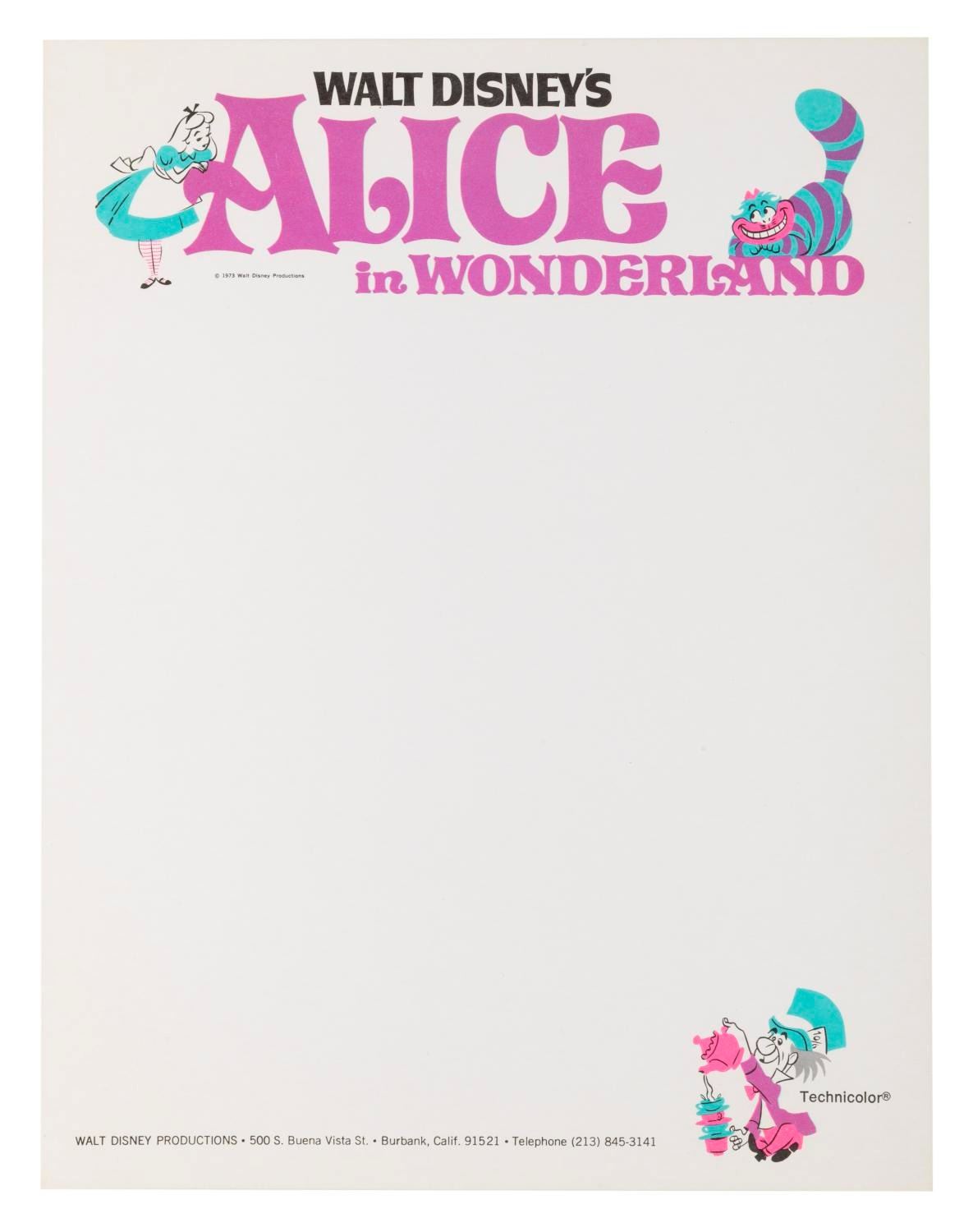 (Disney, 1973) A Walt Disney Productions stationery page themed for the 1973 re-release of "Alice in Wonderland." Measuring 8.5" x 11", the stationery is in fine condition.