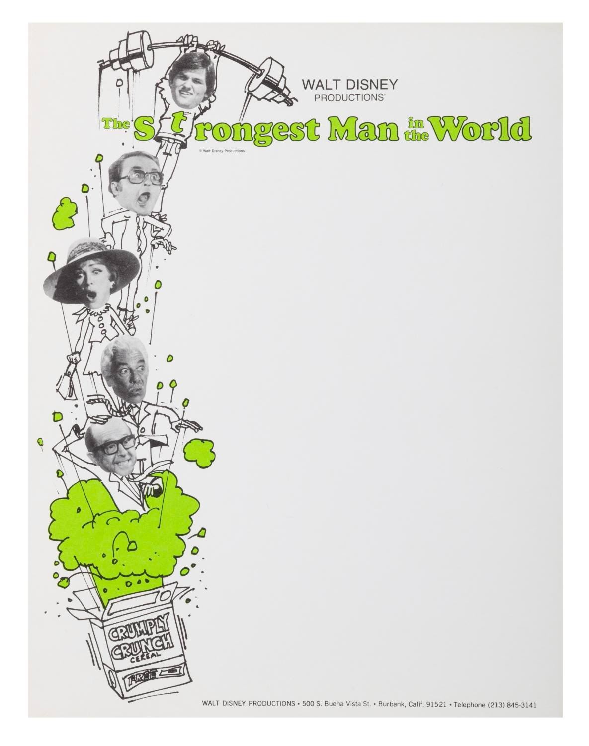 (Disney, 1975) A sheet of Walt Disney Productions letterhead for "The Strongest Man in the World" starring Kurt Russell. This stationery was created and used only for correspondence during the production of the film. Measuring 8.5" x 11", the stationery is in fine condition.