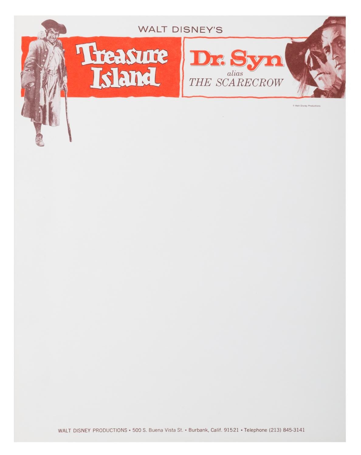 (Disney, 1950/63) A Walt Disney Productions stationery page themed for "Treasure Island" and "Dr. Syn Alias The Scarecrow." Measuring 8.5" x 11", the page is in fine condition.