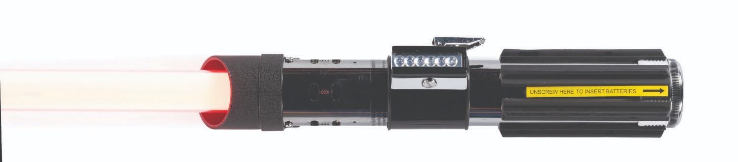 (Hasbro, 2010) A Hasbro Signature Series Darth Vader Force FX lightsaber. Included with the red lightsaber are a display stand and belt clip for cosplaying as the villain. The Sith’s lightsaber, which has a removable blade, requires three AAA batteries and a Phillips screwdriver (not included). Measuring 43.5” in its original 4” x 44.75 box, the tested lightsaber is in very good working condition with scratches and a sticky residue on the hilt.