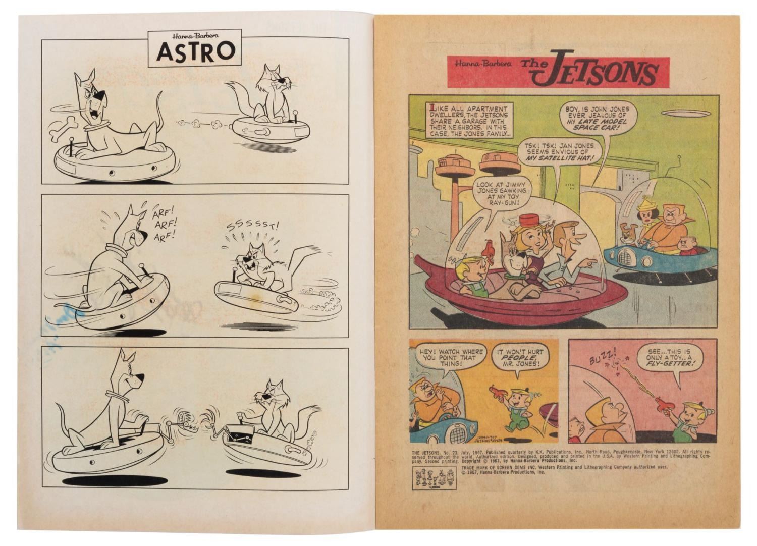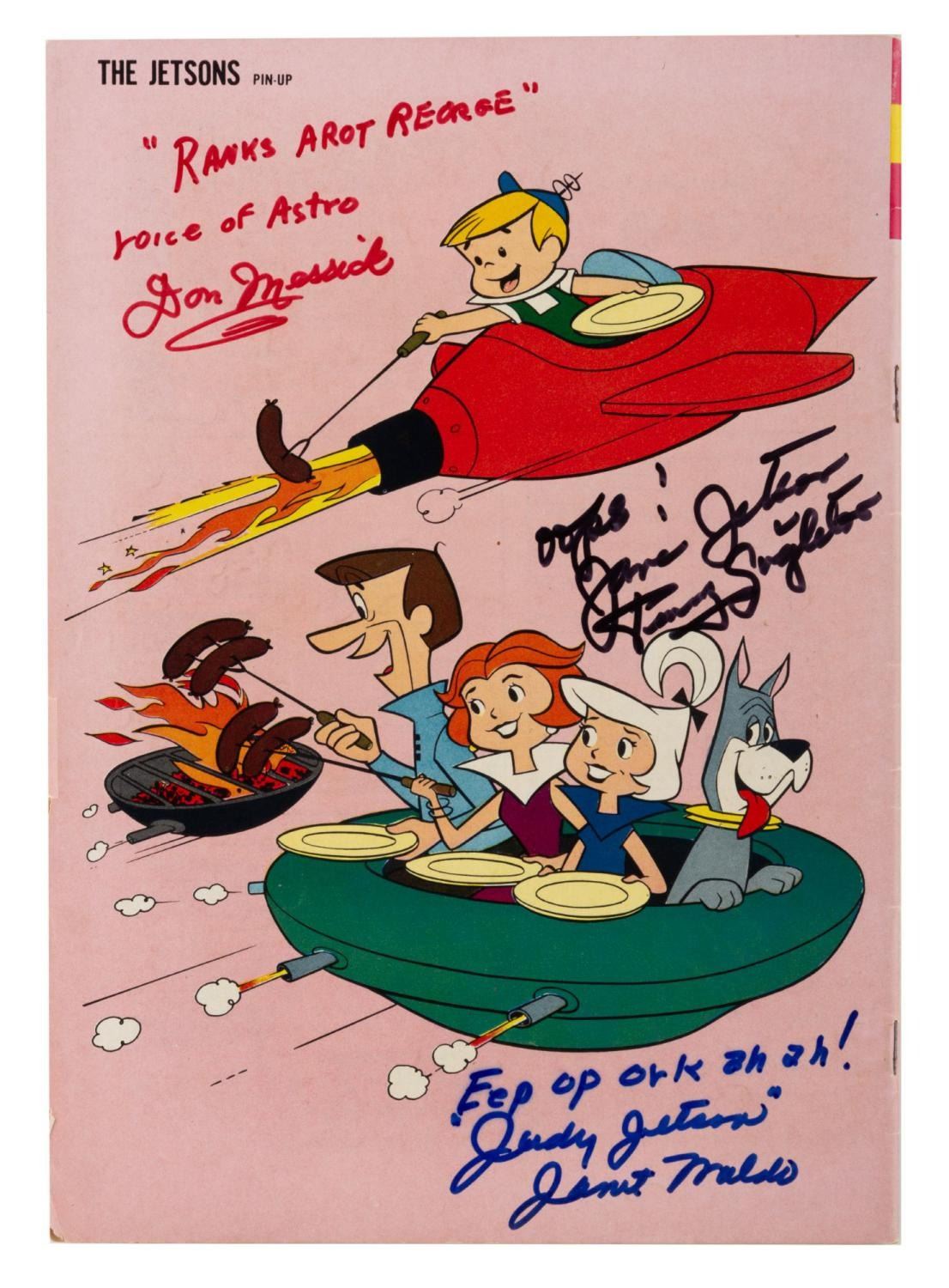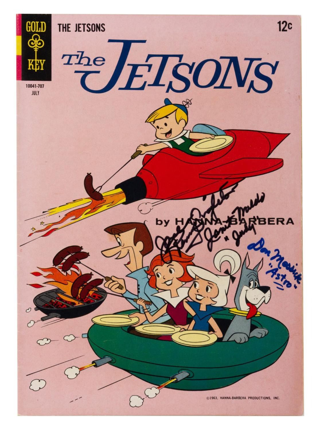 (Gold Key, 1963) Issue 23 of The Jetsons comic book, dated July 1963 and signed by three members of the cast. Autographs include Penny Singleton (Jane), Janet Waldo (Judy), and Don Messick (Astro). Measuring 7.25" x 10.25", the comic is in good condition, with light chipping to the edges, minor creases, stains, and slight oxidation around the staples.