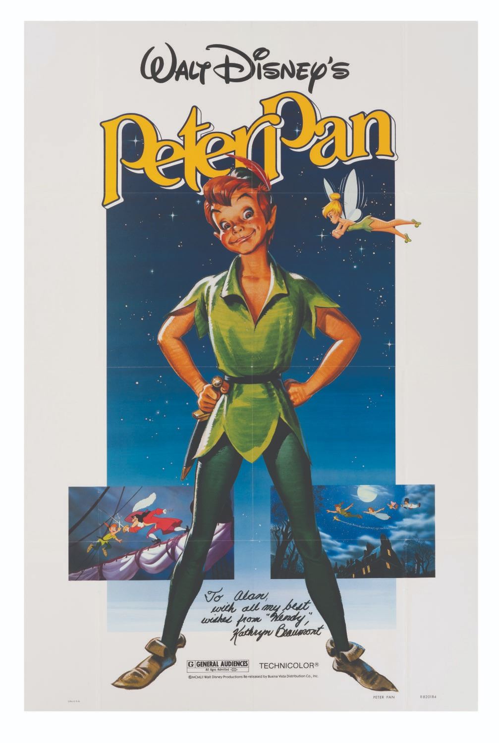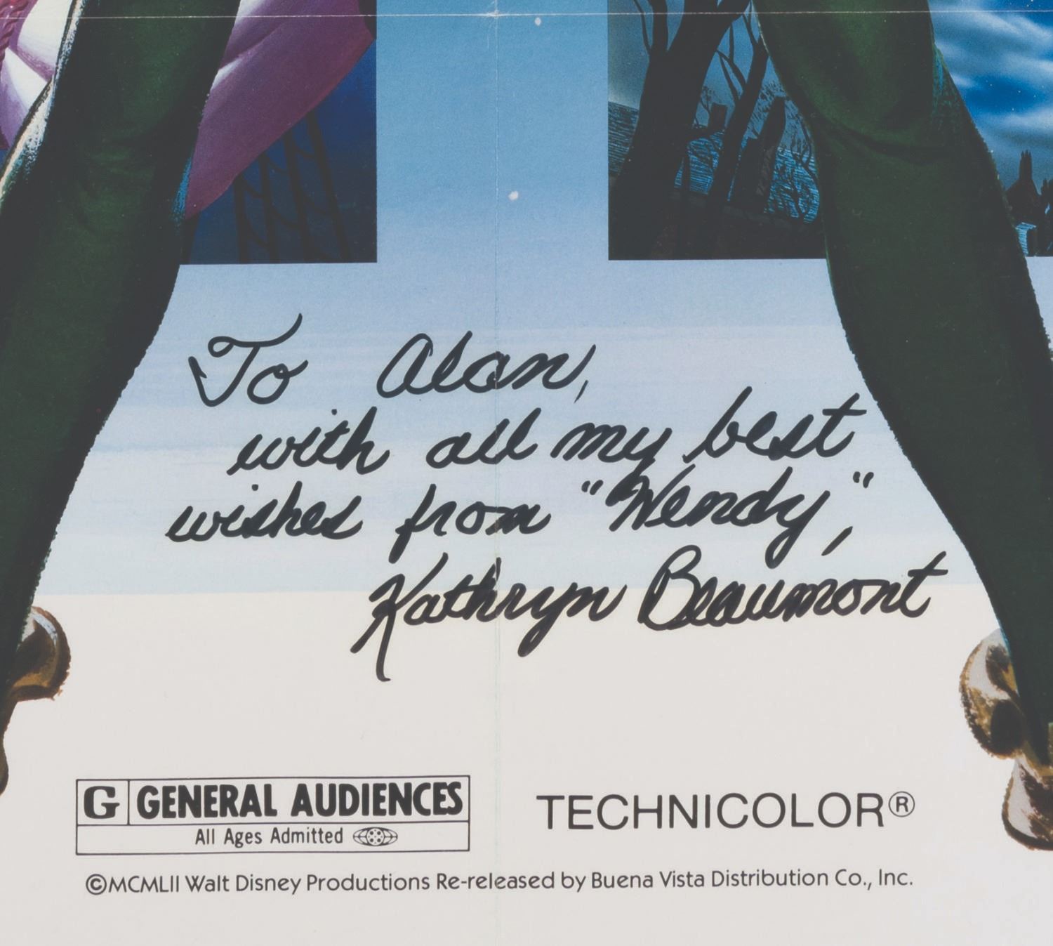 (Disney, 1982) A one-sheet poster for the 1982 rerelease of Peter Pan, signed boldly with dedication by Kathryn Beaumont, the voice of Wendy Darling. Measuring 27"x41", the poster with autograph is in very good condition, with very light wear mainly along original folds.
