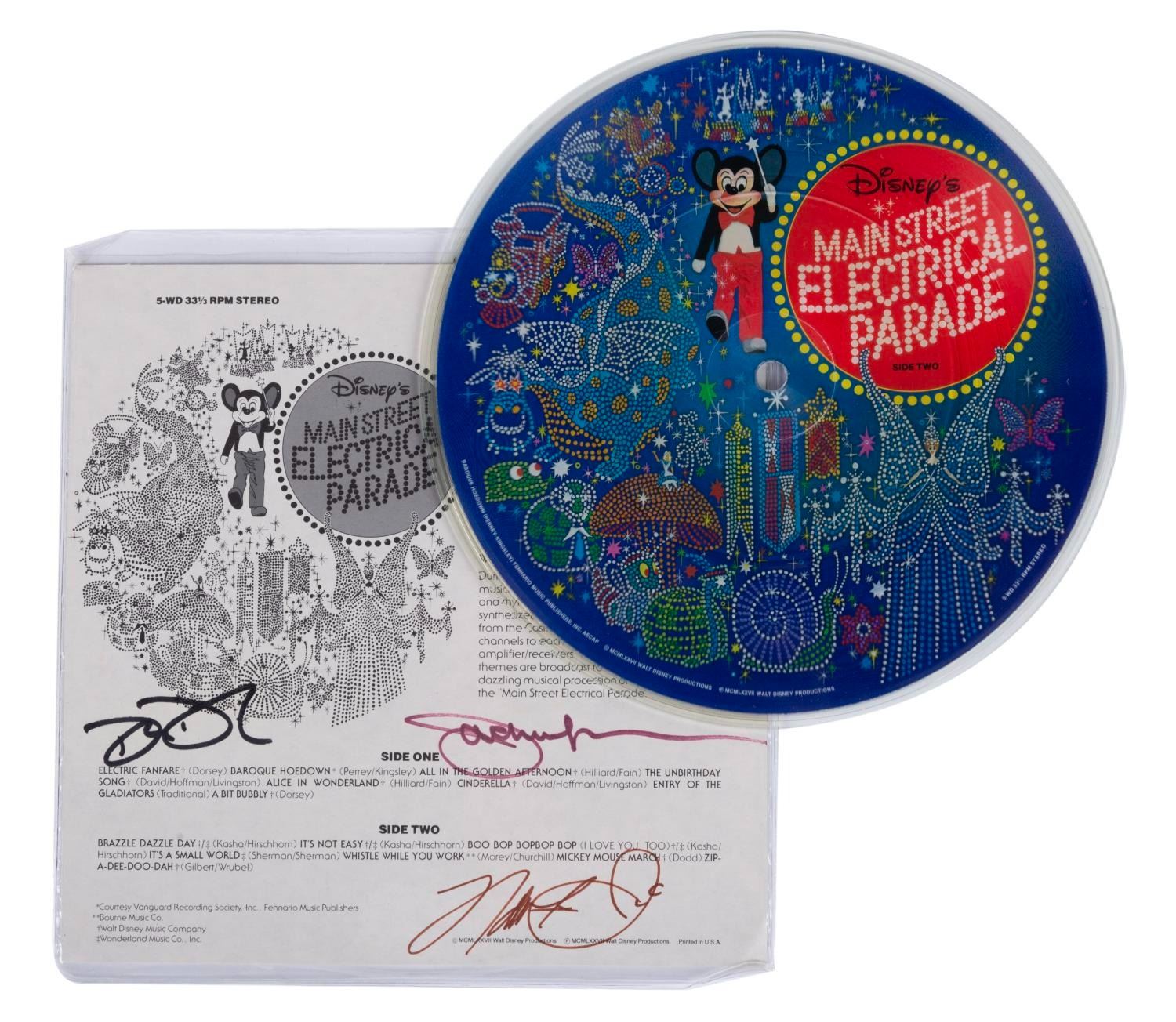 (Disneyland/Walt Disney World, 1977) A Signed Disney’s Main Street Electrical Parade Record. This two-sided 33 1/3 rpm stereo picture disc has been signed by electronic musician Don Dorsey (who composed the Electronic Fanfare) and two other artists, and features “Baroque Hoedown” by Perrey-Kingsley Feninario Music Publishers. The sleeve has been signed by Don Dorsey. The record is in fine condition with little apparent wear while the sleeve is in very good condition with light wear to its edges and corners.
