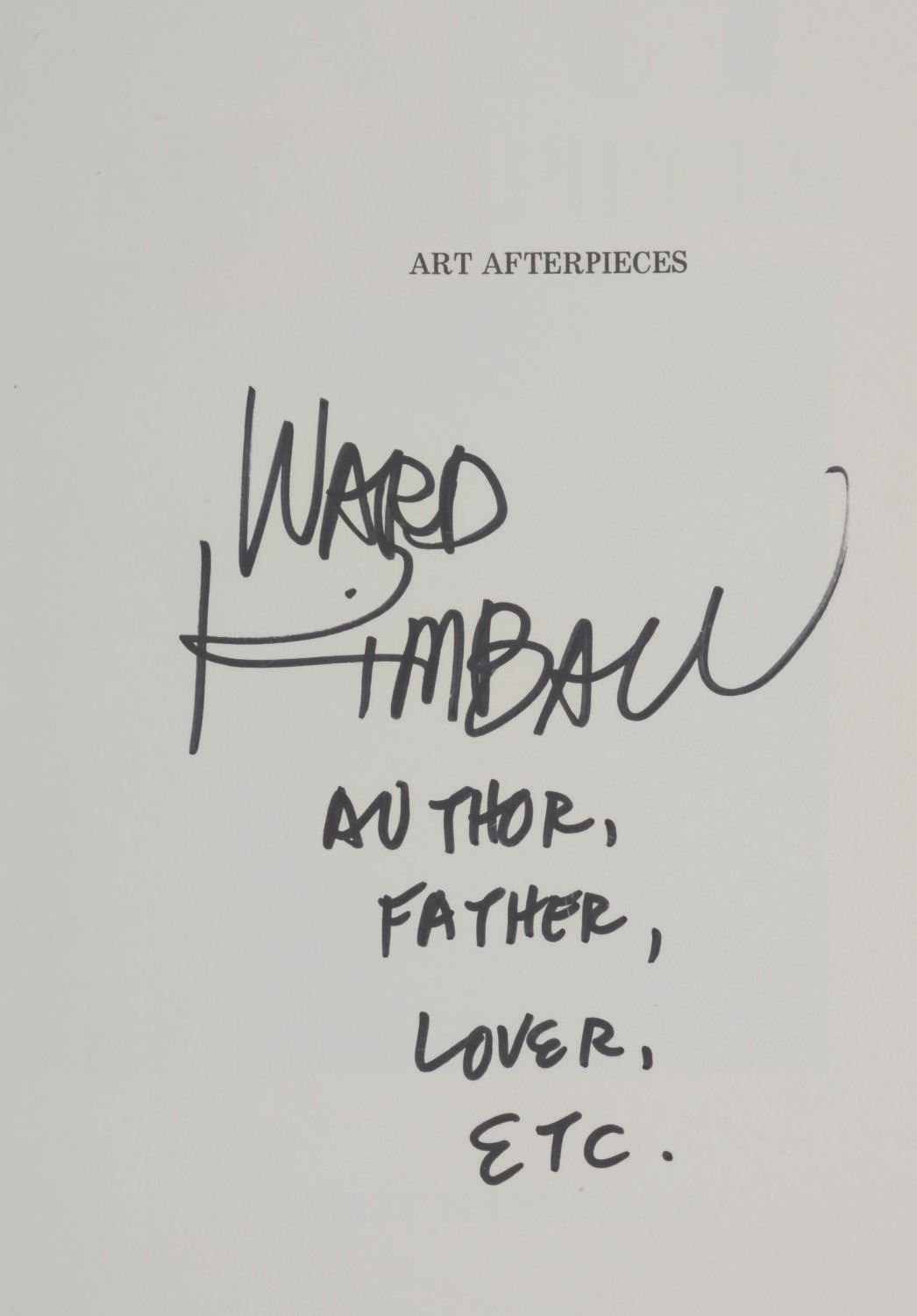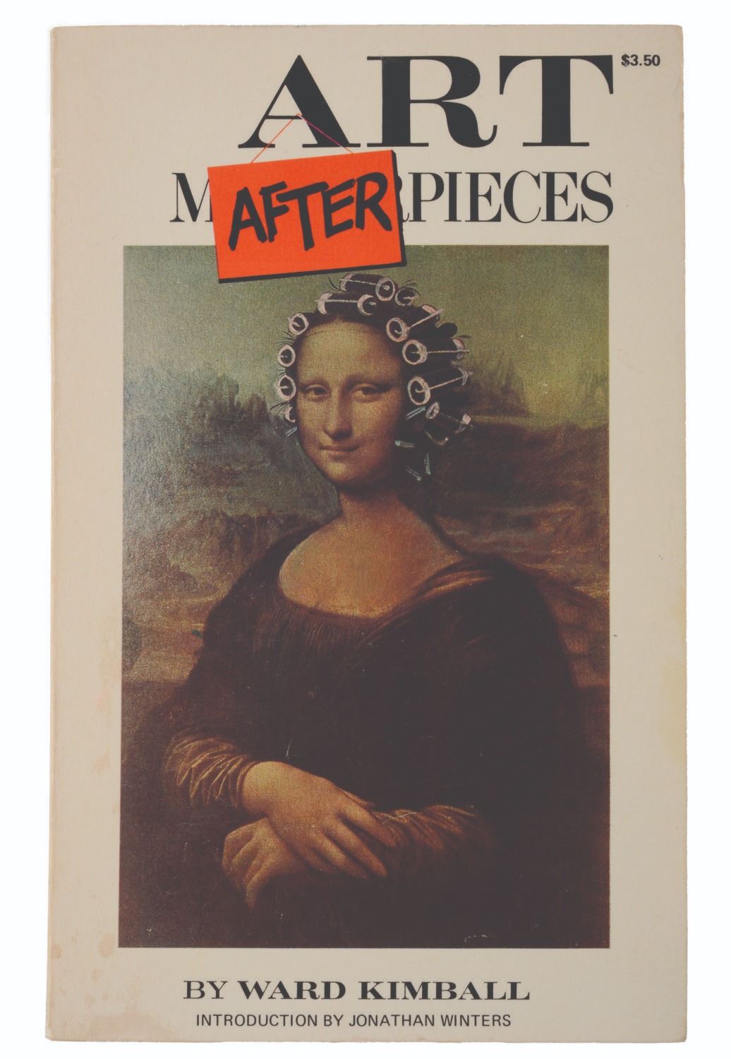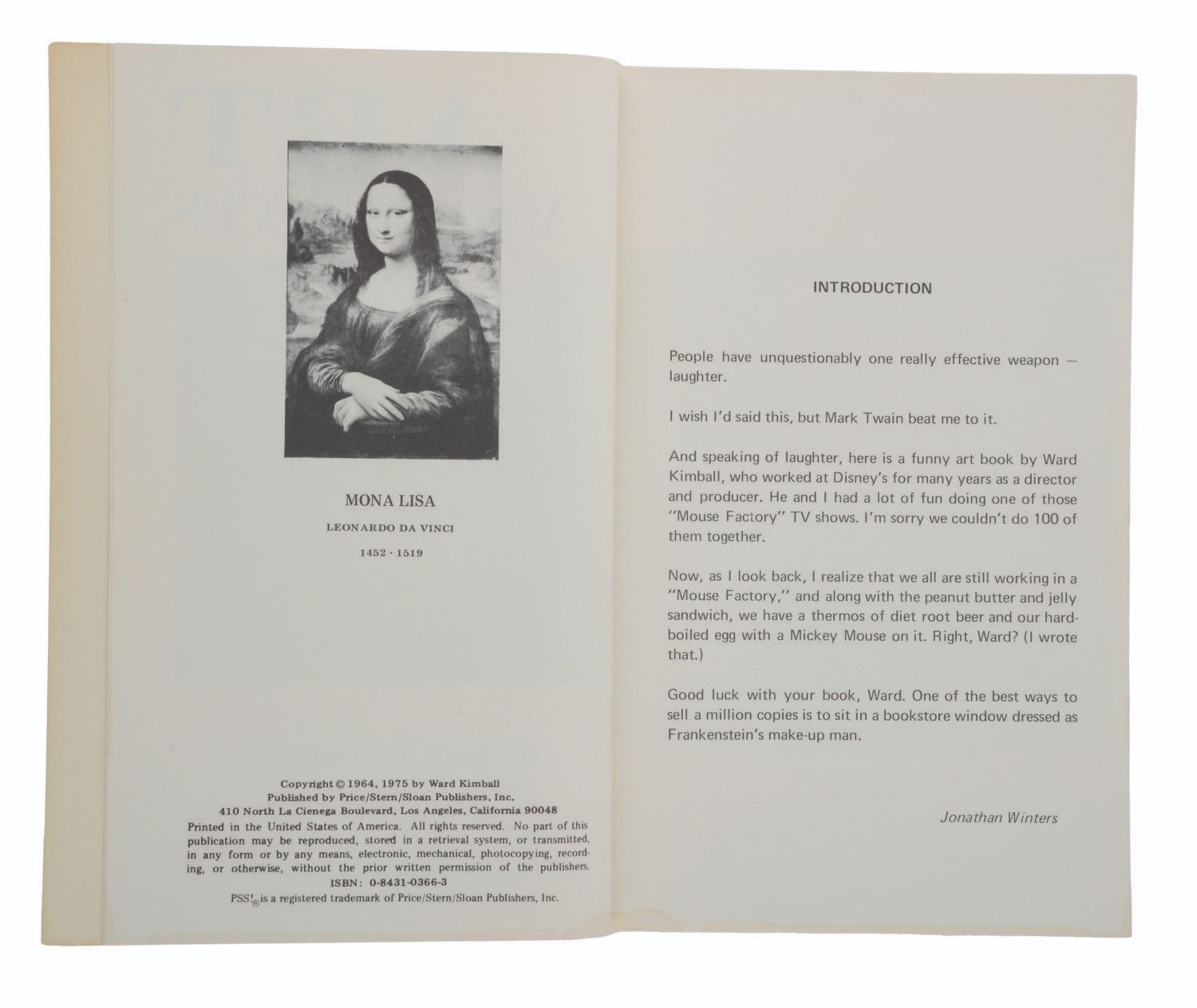 (Price/Stern/Sloan, 1975) An Art Afterpieces book hand-signed by the author and Disney Legend Ward Kimball. With a foreword by humorist Jonathan Winters, this 46-page book features Ward’s amusing updates to classic artworks, such as adding hair curlers to the Mona Lisa. Measuring 5.25" x 8.25", the book is in good condition with water stains along the bottom edge, discoloration, and light soiling.