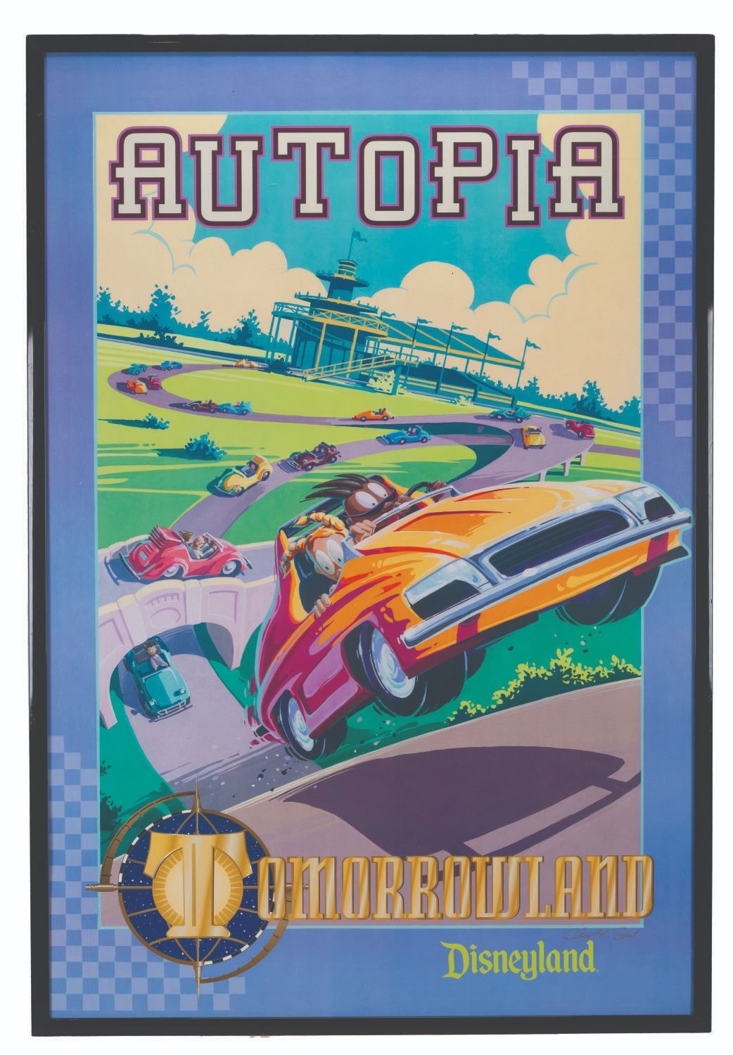 (Disneyland, 2000) A very rare printed attraction poster by Christopher Smith for Disneyland's Autopia. This poster pays tribute to the original "Autopia" poster designed by Bjorn Aronson, with a more modern appeal for the newly refurbished version of the attraction, which was sponsored by Chevron. Smith signed the poster near the bottom right in bold gold marker. Measuring 36" x 54", the poster displays in fine condition with very light creases.