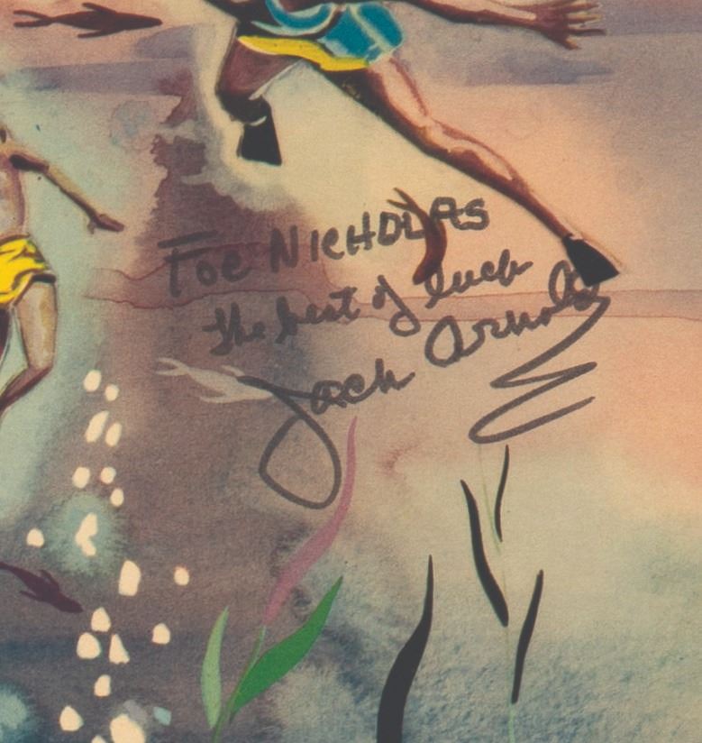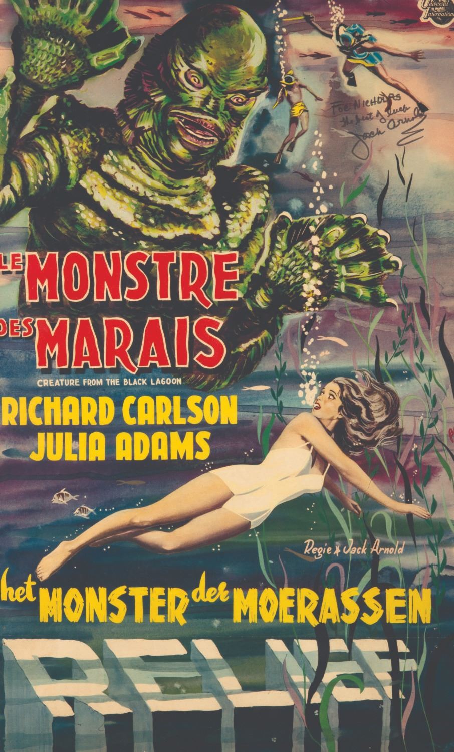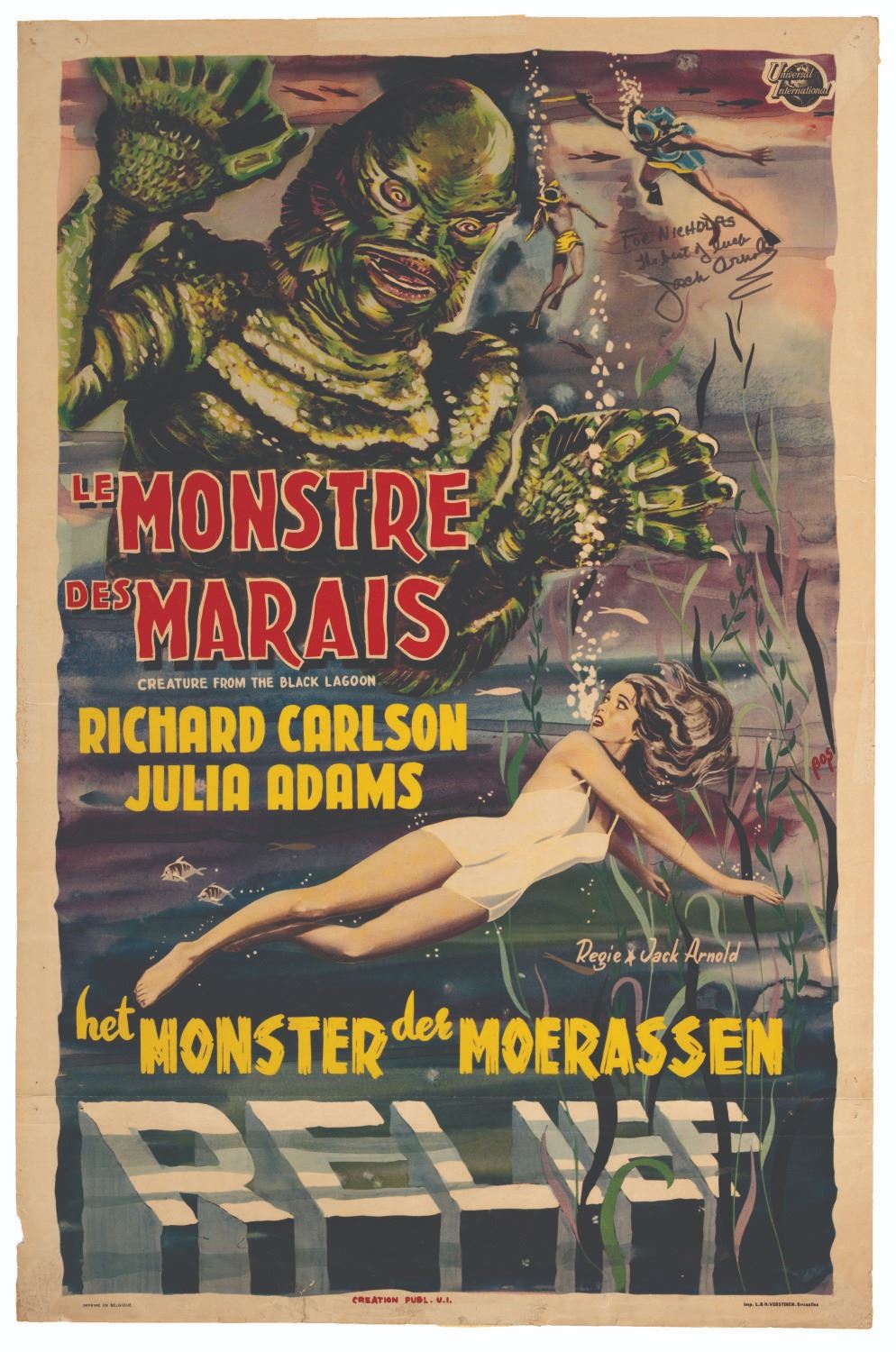 (Universal, 1954) A very rare Belgian poster for the original 3-D release of The Creature From the Black Lagoon, signed with dedication by the film's director Jack Arnold. With"RELIEF" in large type at the bottom being French for"Third Dimension," this is noted as one of very few posters printed in any country with a 3-D designation actually printed on the poster, as opposed to glued on in a printed addition. Measuring 14.5"x22", the poster is in very good condition, with slight fading from age, some original but discreet folds and creases, and light wear mainly visible in the borders including pinholes, a .5" chip, waviness, a repaired 1" edge tear, and tape residue on back.