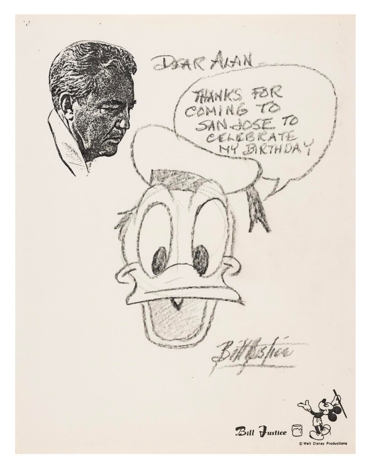 (Justice, 1980s-2000s) A Donald Duck drawing by Disney Legend Bill Justice, accomplished on Justice’s Walt Disney Productions letterhead in grease pencil and signed by the artist with a personalized dedication to a fan. Measuring 8.5” x 11”, the signed drawing displays in very good condition with original folds from mailing and light discoloration from age.