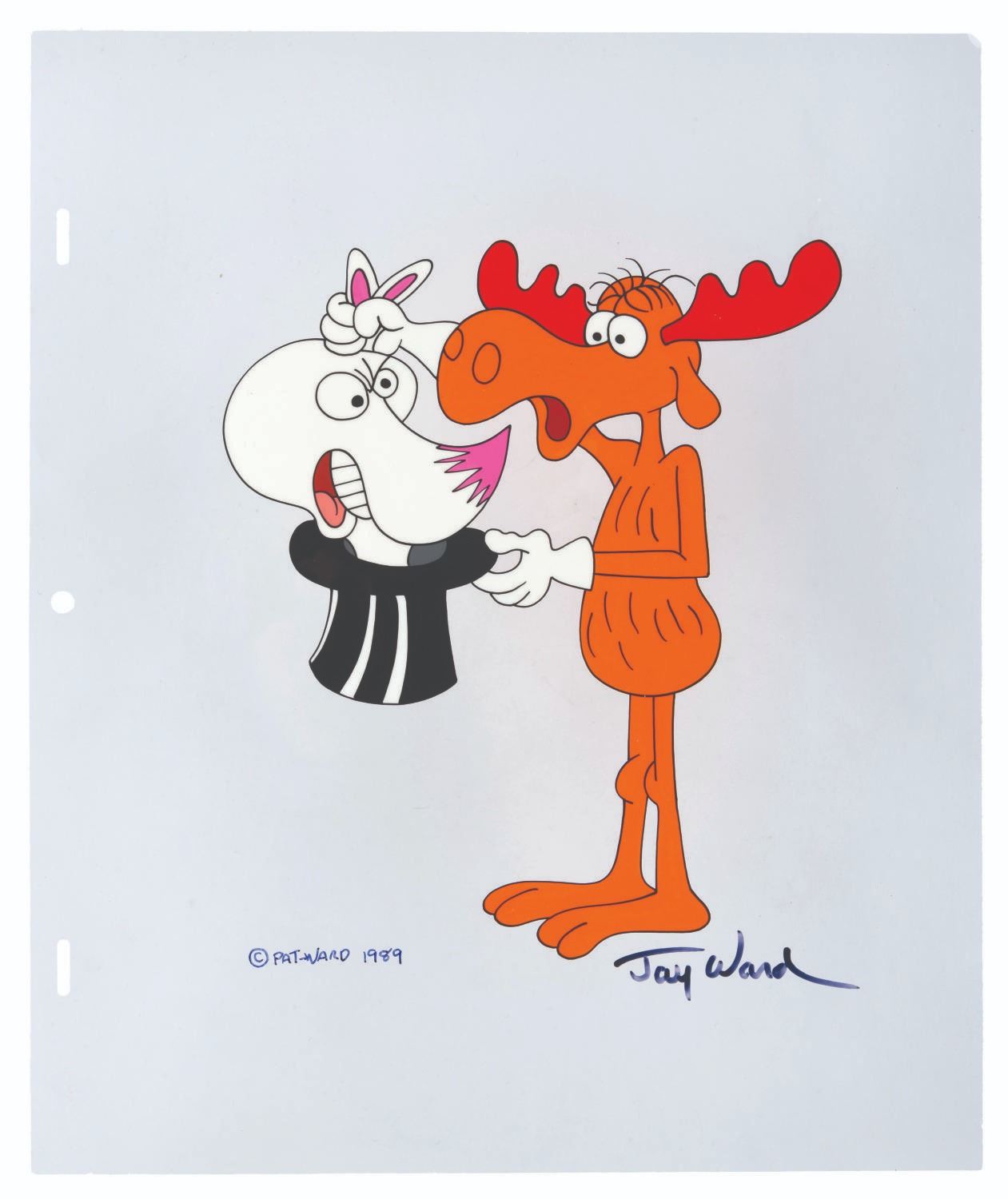 (Ward, 1989) Scene Cel #40 in the Jay Ward Productions Original Animation Scene Cels Collection, featuring Bullwinkle, signed by Ward in black ink. With a character image size of 8” x 7” on a 10.5” x 12.5” cel, the art is in fine condition.